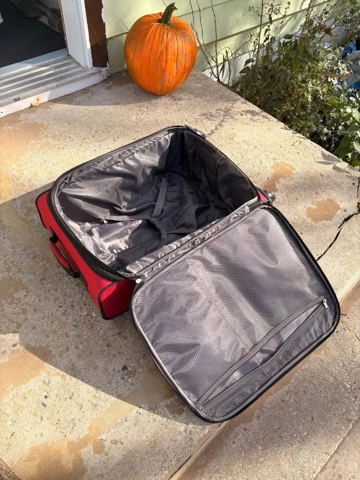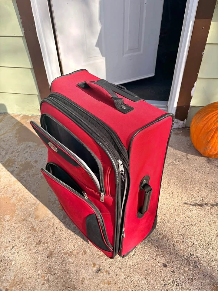 Red 4 wheel American Tourister suitcase. Shows some signs of wear otherwise good condition 27" by 16" by 9"