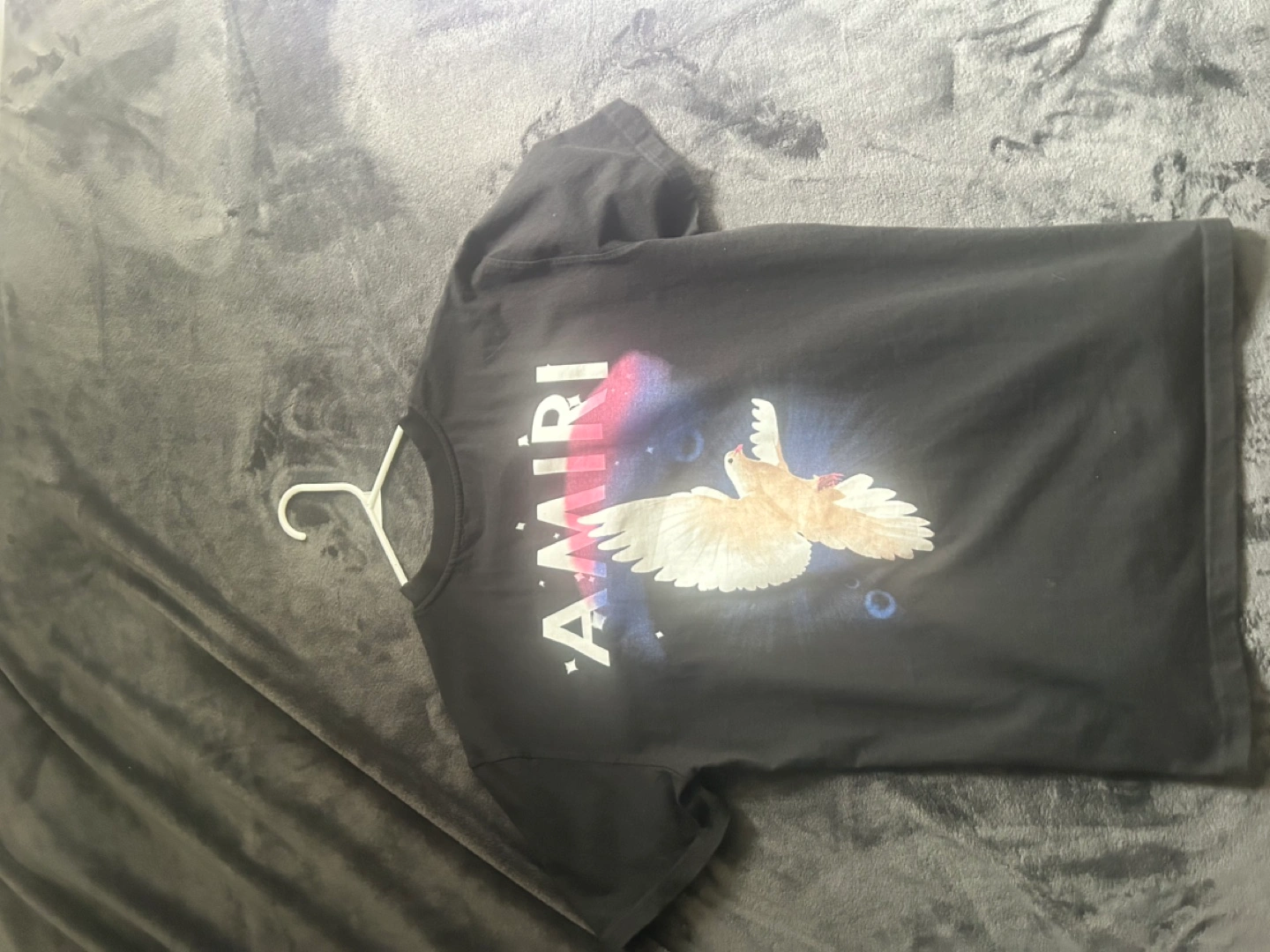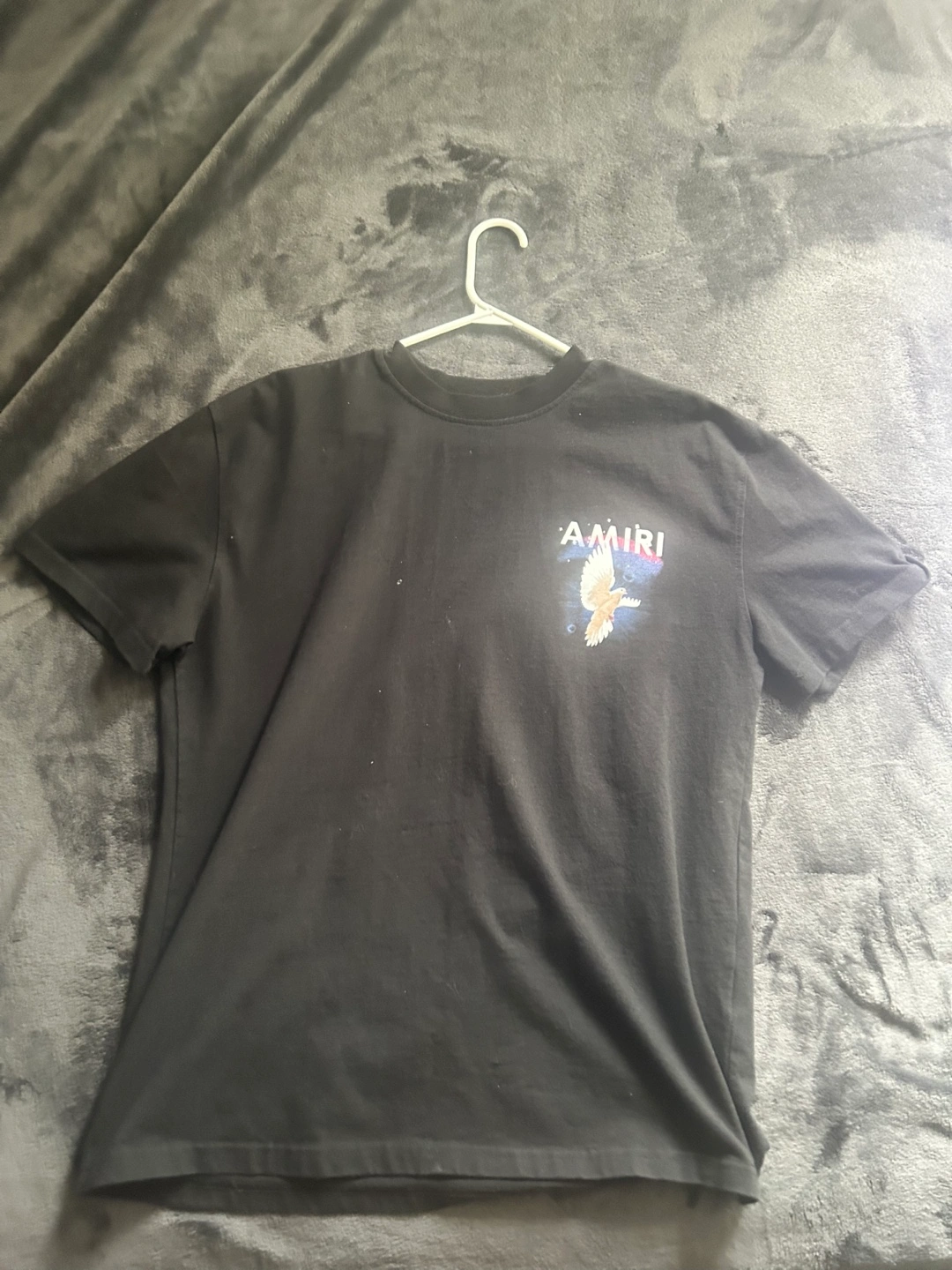 Men's black t-shirt. Features a graphic of a dove. Short sleeves. Crew neck.