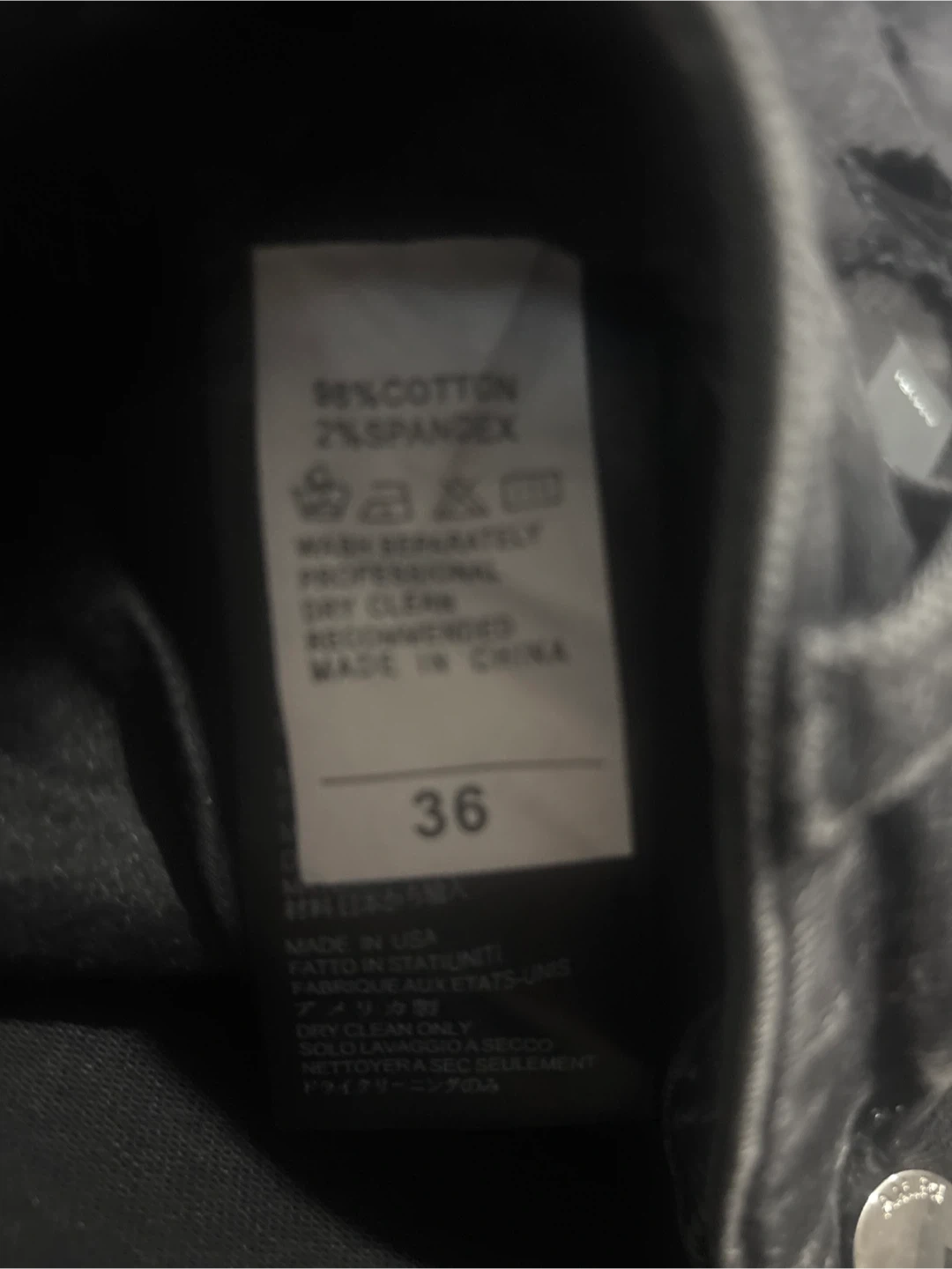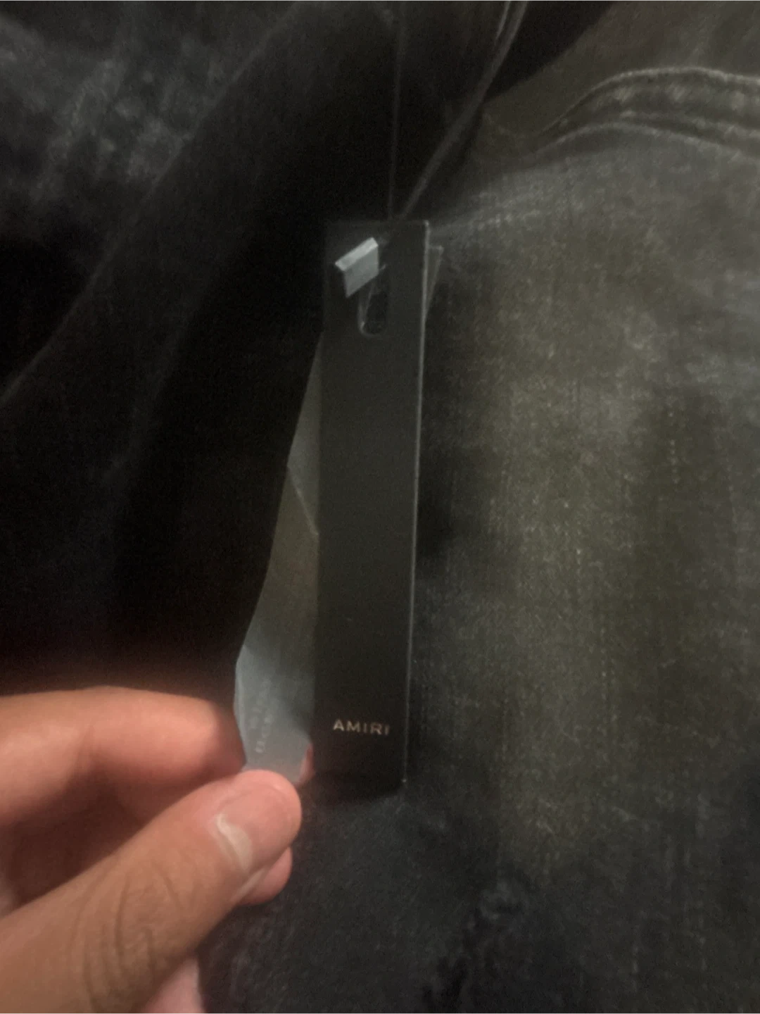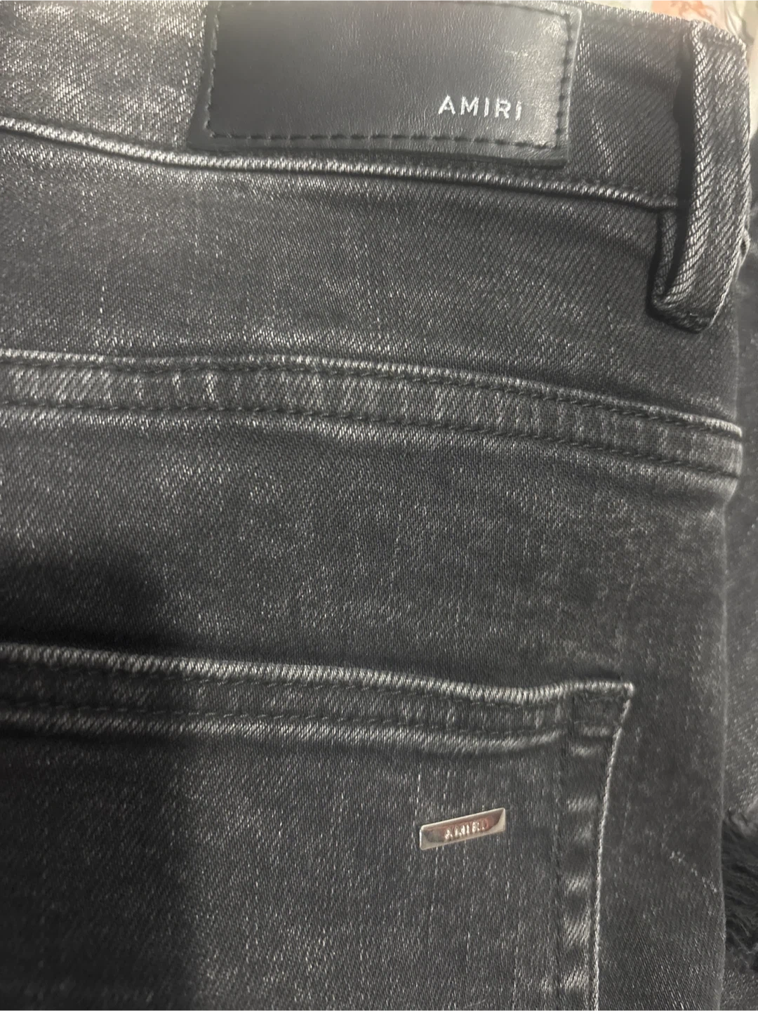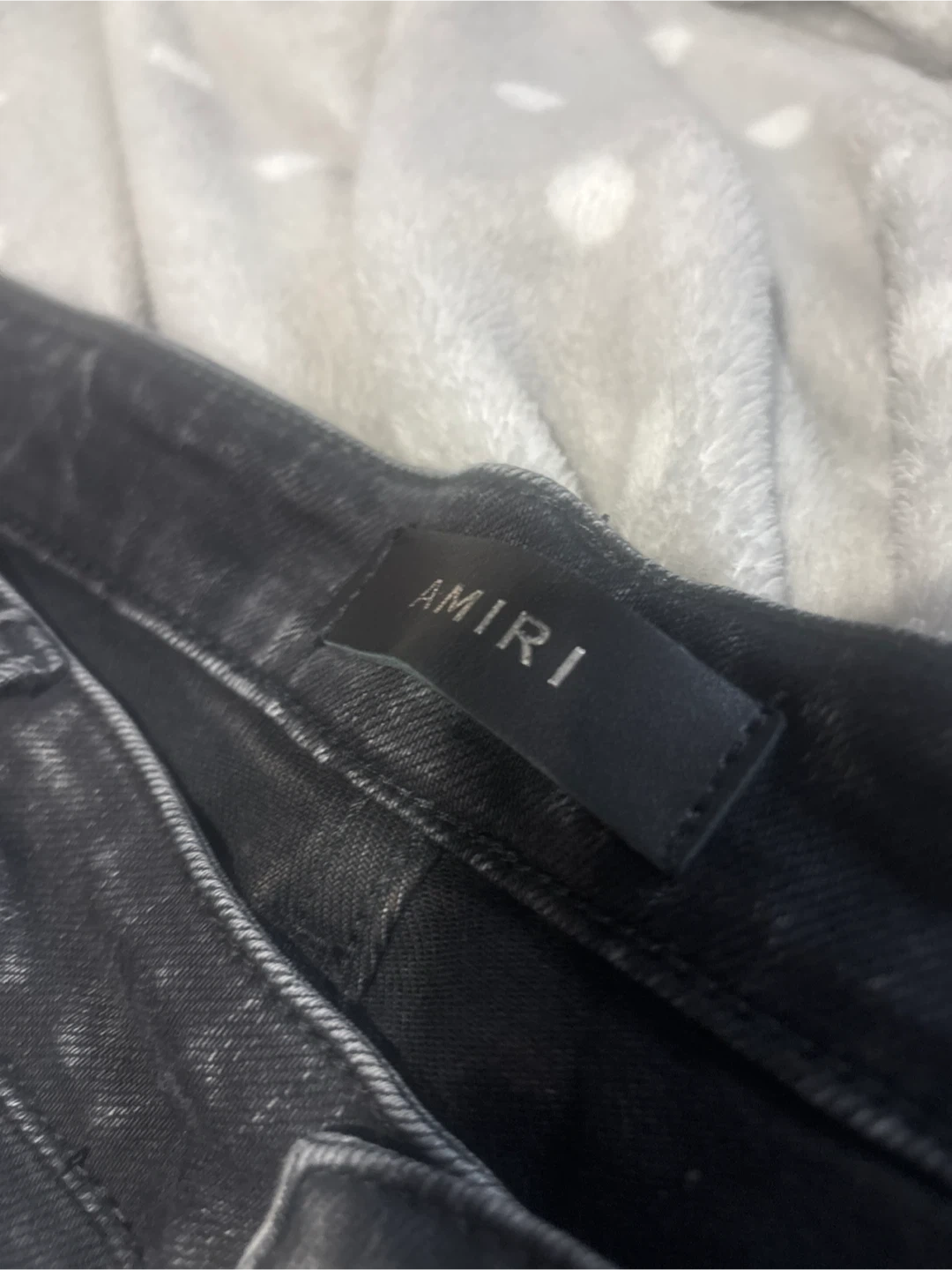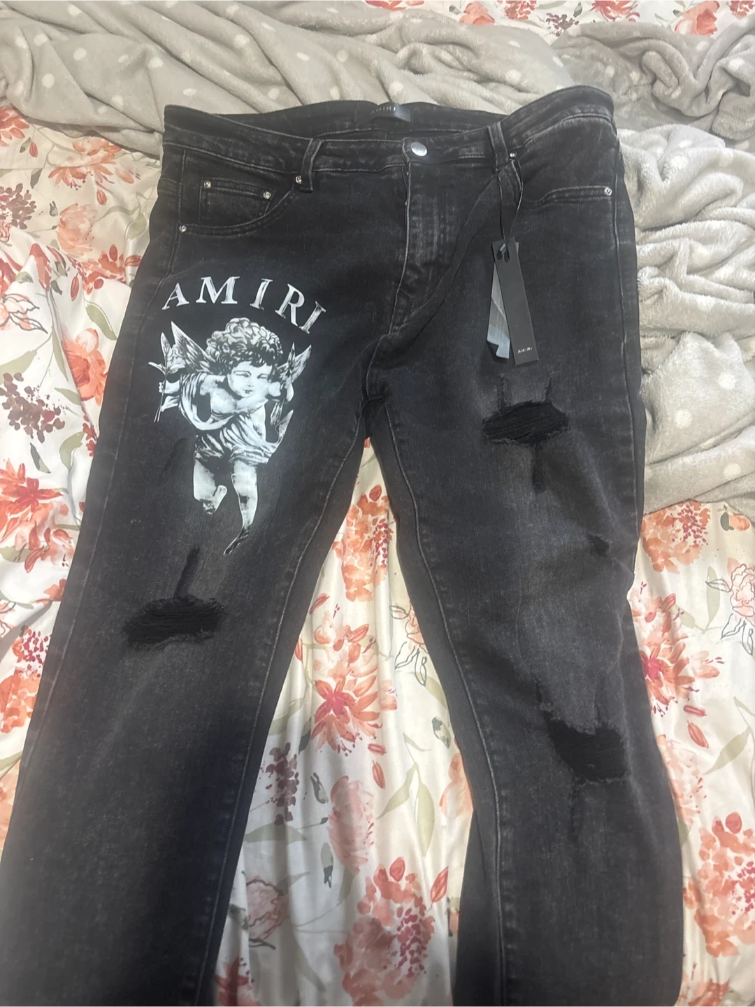Selling a pair of AMIRI black jeans in size 36. They feature a cool angel graphic and a stylish distressed look. Made with 98% cotton and 2% spandex for a comfortable fit!