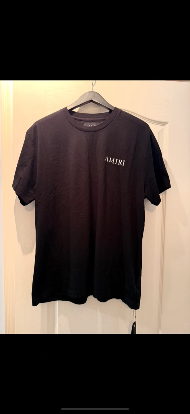 Black cotton t-shirt. Short sleeves. Minimalist AMIRI logo. Brand tag. Big Amiri logo on the back