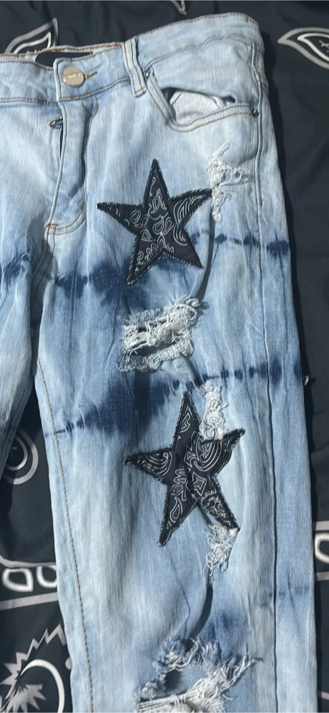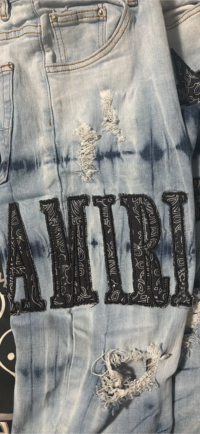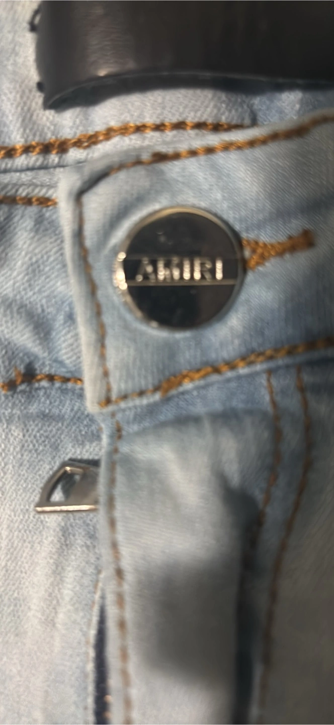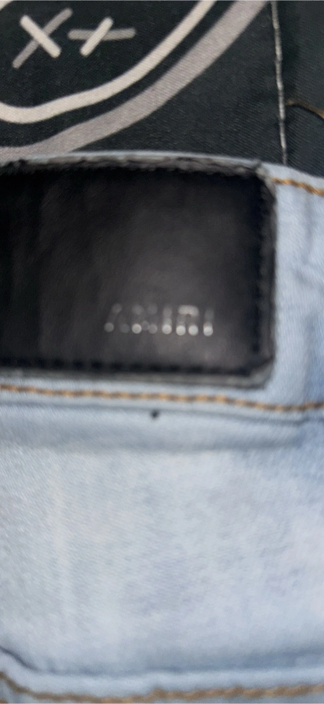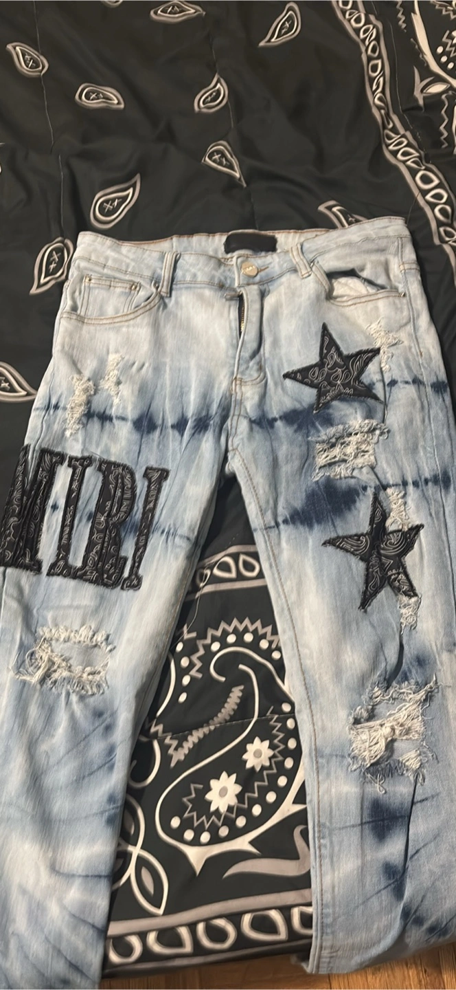 Selling a pair of Amiri jeans in size 32. They feature a light wash denim with unique star and Amiri logo detailing. Perfect for adding some edge to your wardrobe!