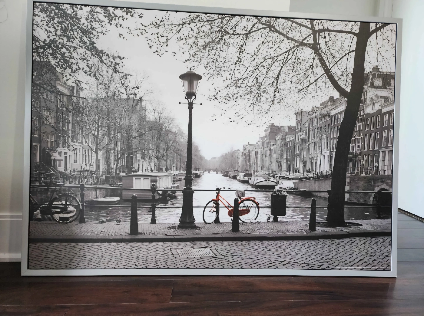 Selling a framed print featuring a black and white scene of the Amsterdam canal. It adds a touch of European charm to any room!