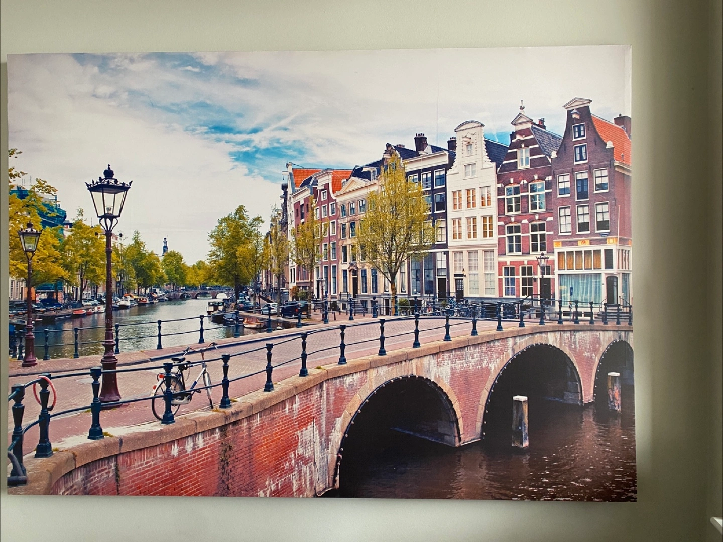 Add a touch of Amsterdam's charm to your home with this vibrant canvas print! This eye-catching piece captures a picturesque canal scene, complete with classic Dutch architecture and a charming bridge. The print measures approximately 54 inches in width and 39 inches in height. The canvas is in good condition, ready to brighten up any room. This beautiful piece is priced to sell at $75.00 CAD, which reflects its quality and the joy it will bring to your space. It’s an affordable way to own a slice of Amsterdam! As a fun aside, I always say if the ad is up, the item is available—because who has time for outdated listings? Grab this Amsterdam canvas print and let your walls tell a story! Size : 55 (W) x 1.5 (D) x 39.5 (H) Perfect for a living room or bedroom.