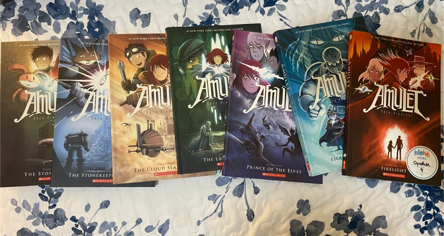 Selling the Amulet series by Kazu Kibuishi! This is a great book series for kids and adults alike. Includes books 1-7: 1- The Stonekeeper 2- The Stonekeeper's Curse 3- The Cloud Searchers 4- The Last Council 5- Prince of the Elves 6- Escape from Lucien 7- Firelight