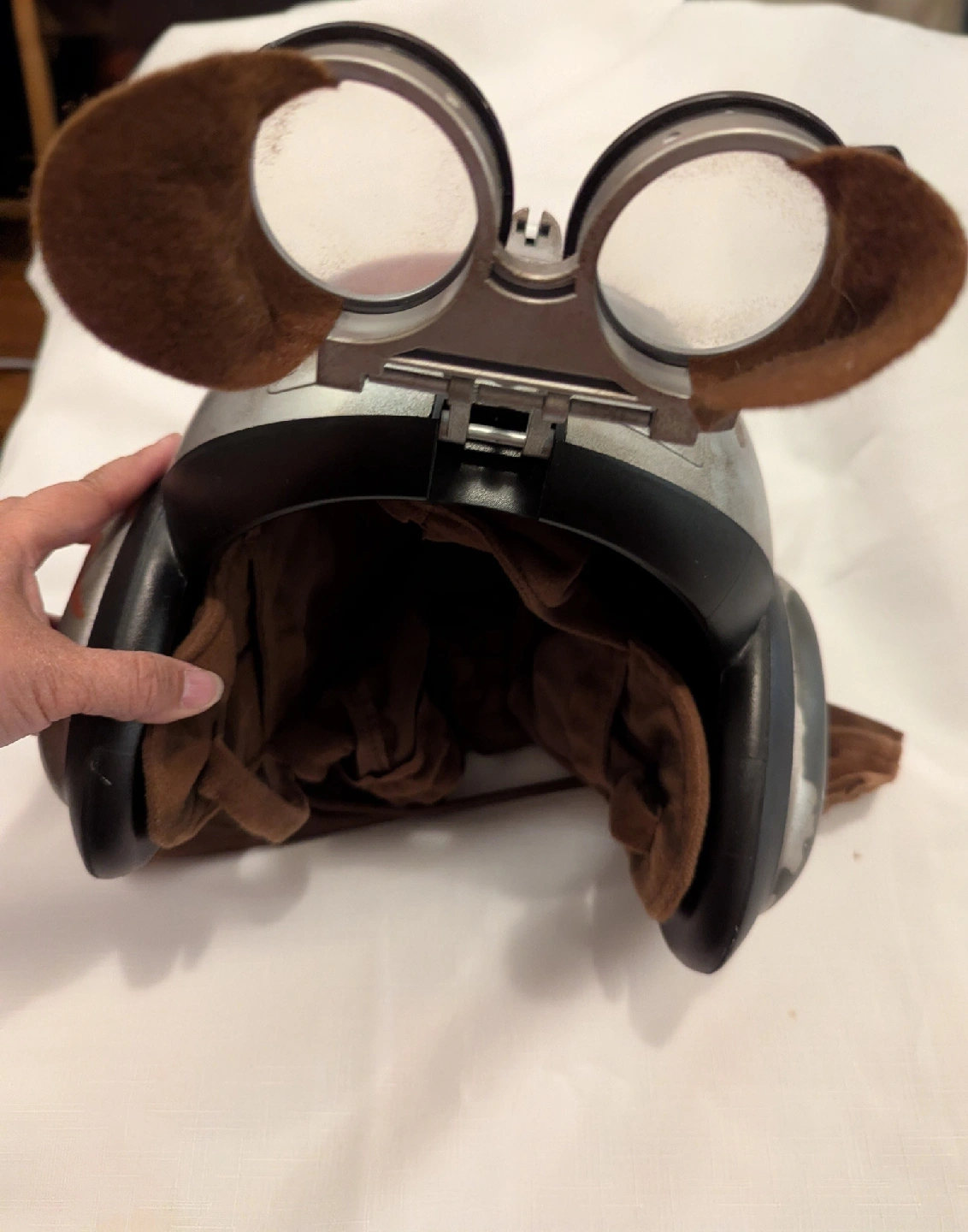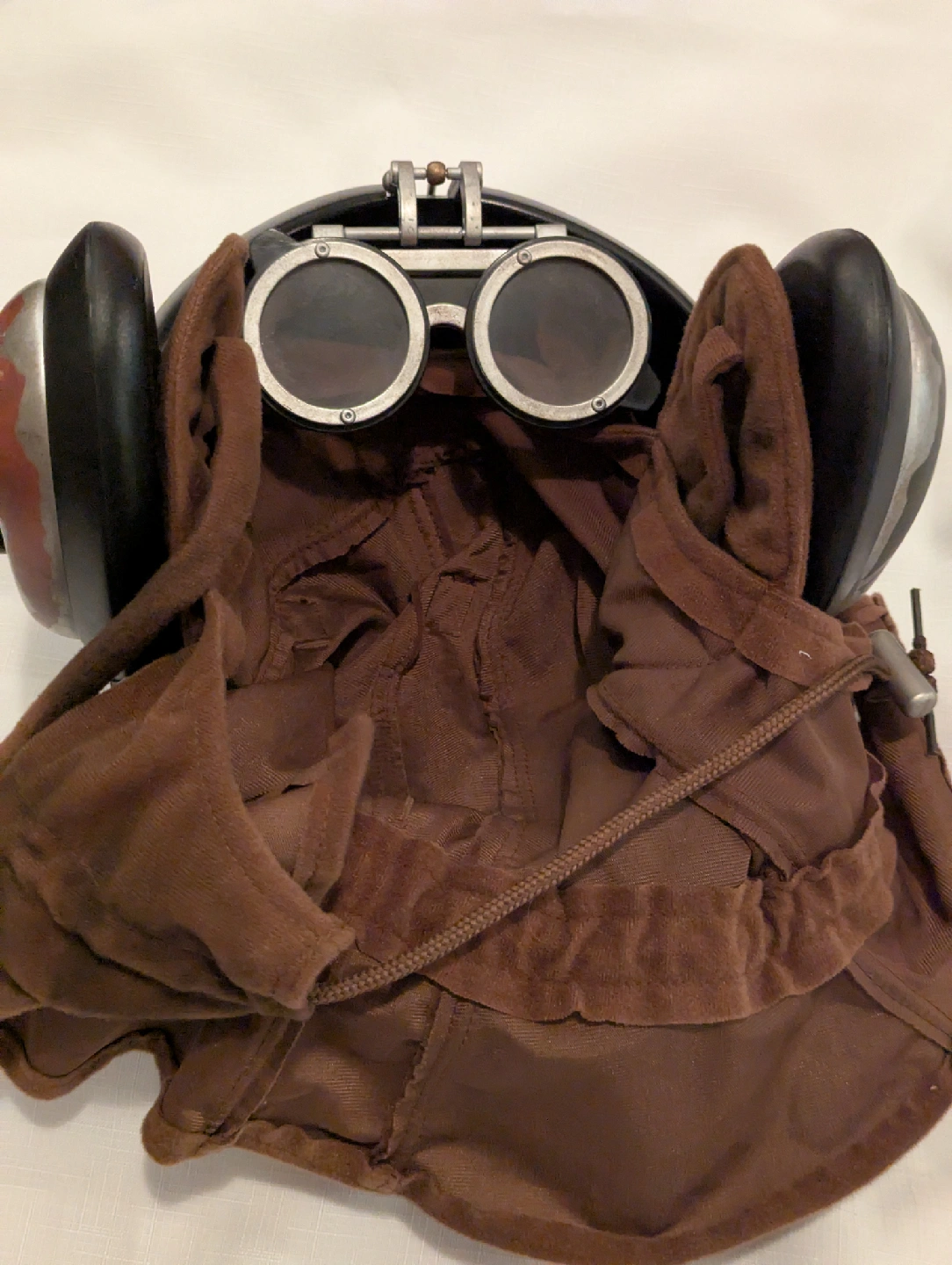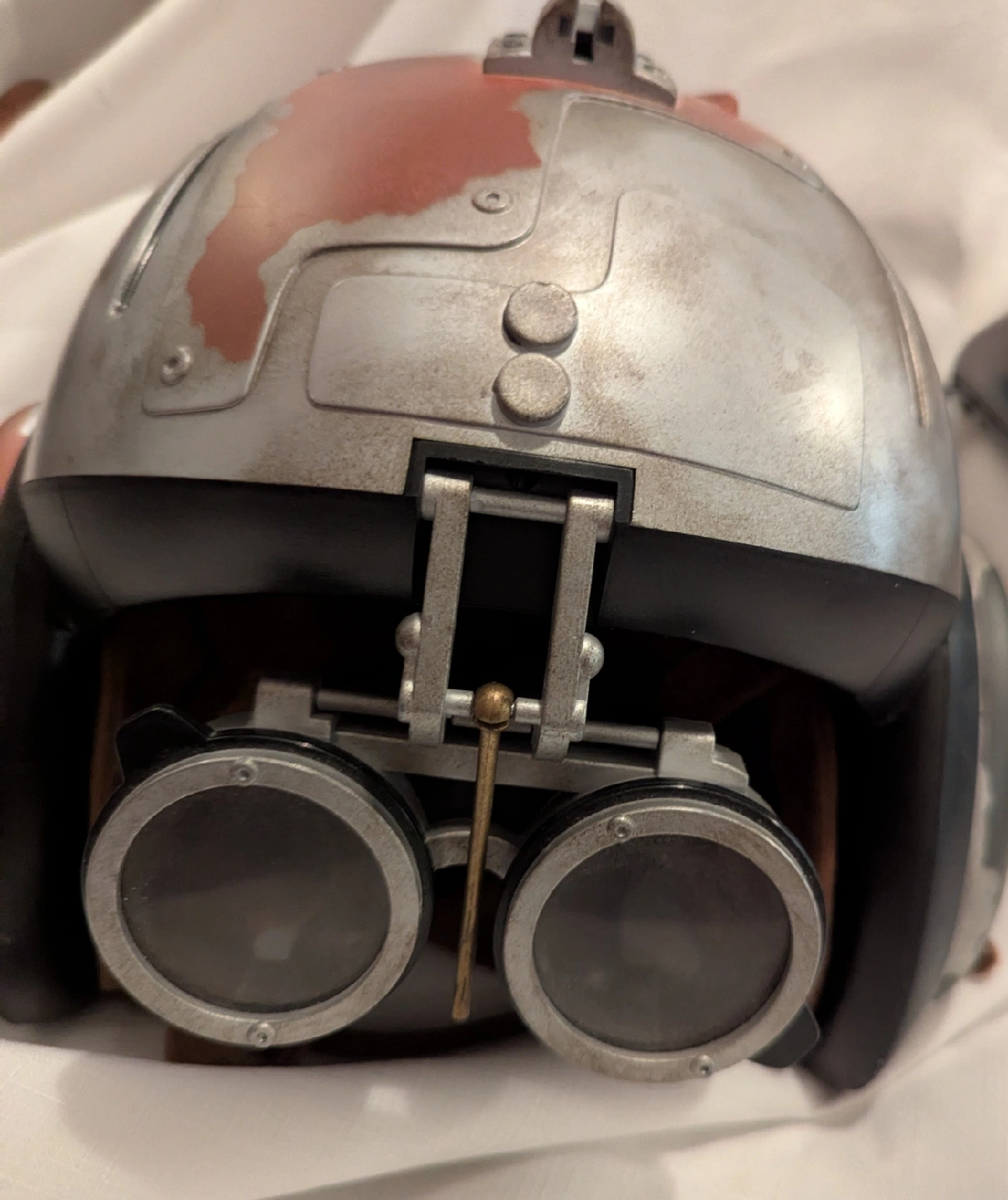 Teen or adult sized pod racing helmet. You could build a whole costume around this! Very detailed. Goggles are attached and lift up. This is a weighty item so be prepared. Feel the force guide you through your pod race. Very cool item made by Lucas Film It has a cool, weathered look with goggles and ear coverings. Perfect for costumes or display. PICKUP South Etobicoke. SEE map Smoke and pet free home. NO delivery. NO meetups Will hold with deposit. NO shipping