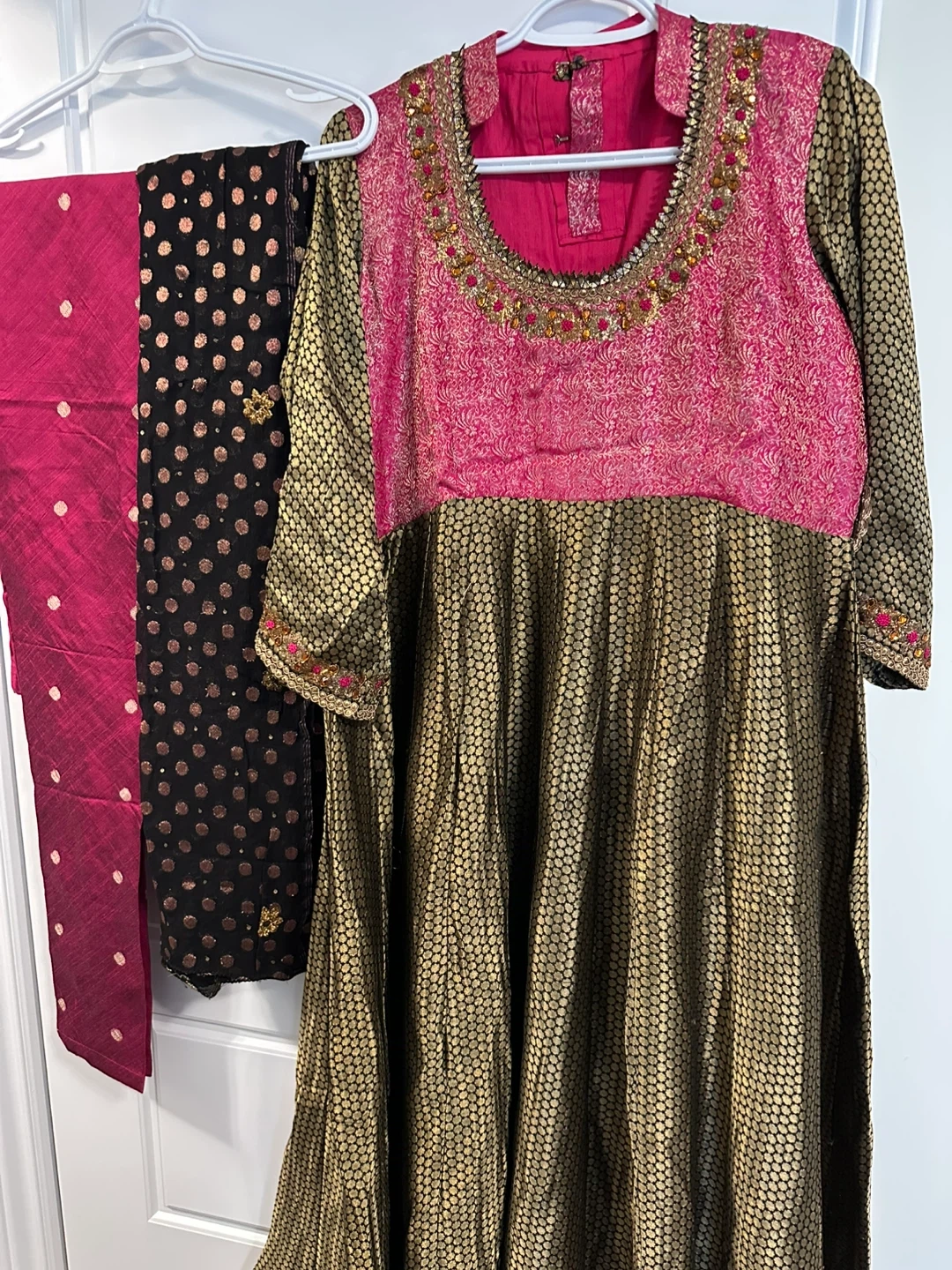 Beautiful anarkali with intricate embroidery! The shirt is with lining, and antique embroidery in front and back and matching dupatta that has sequins and butti. The colours are a vibrant pink and gold, perfect for a special occasion. Churidar is silk. Might fit to large
