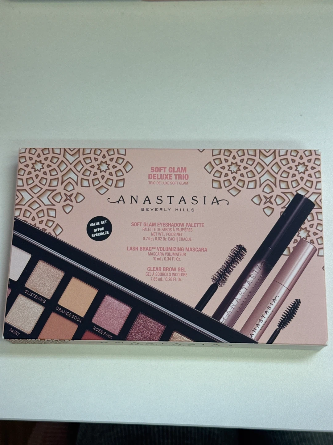 Anastasia Beverly Hills Soft Glam Deluxe Trio ALL FULL SIZED PRODUCTS ALL BRAND NEW Cash only Includes: - Soft Glam Eyeshadow Palette - Lash Brag Volumizing Mascara - Clear Brow Gel Total Value = $148.4 (tax incl.)