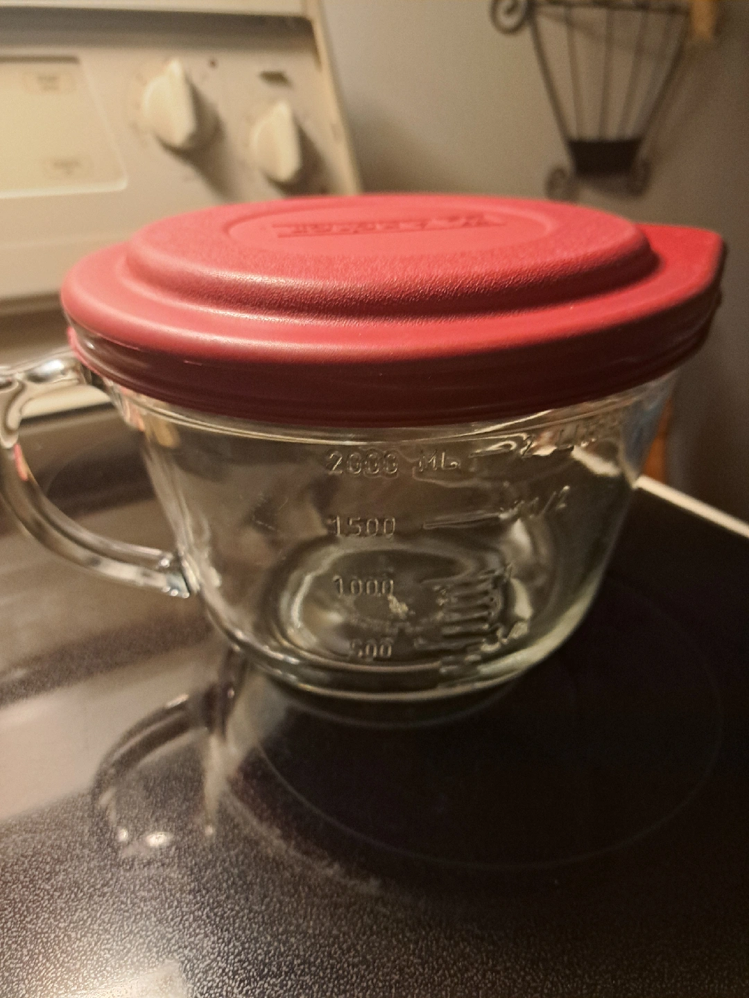 Anchor measuring cup/batter bowl with a red lid. It measures up to 2000 ml. (8 cups) It's in great condition and ready for a new home!