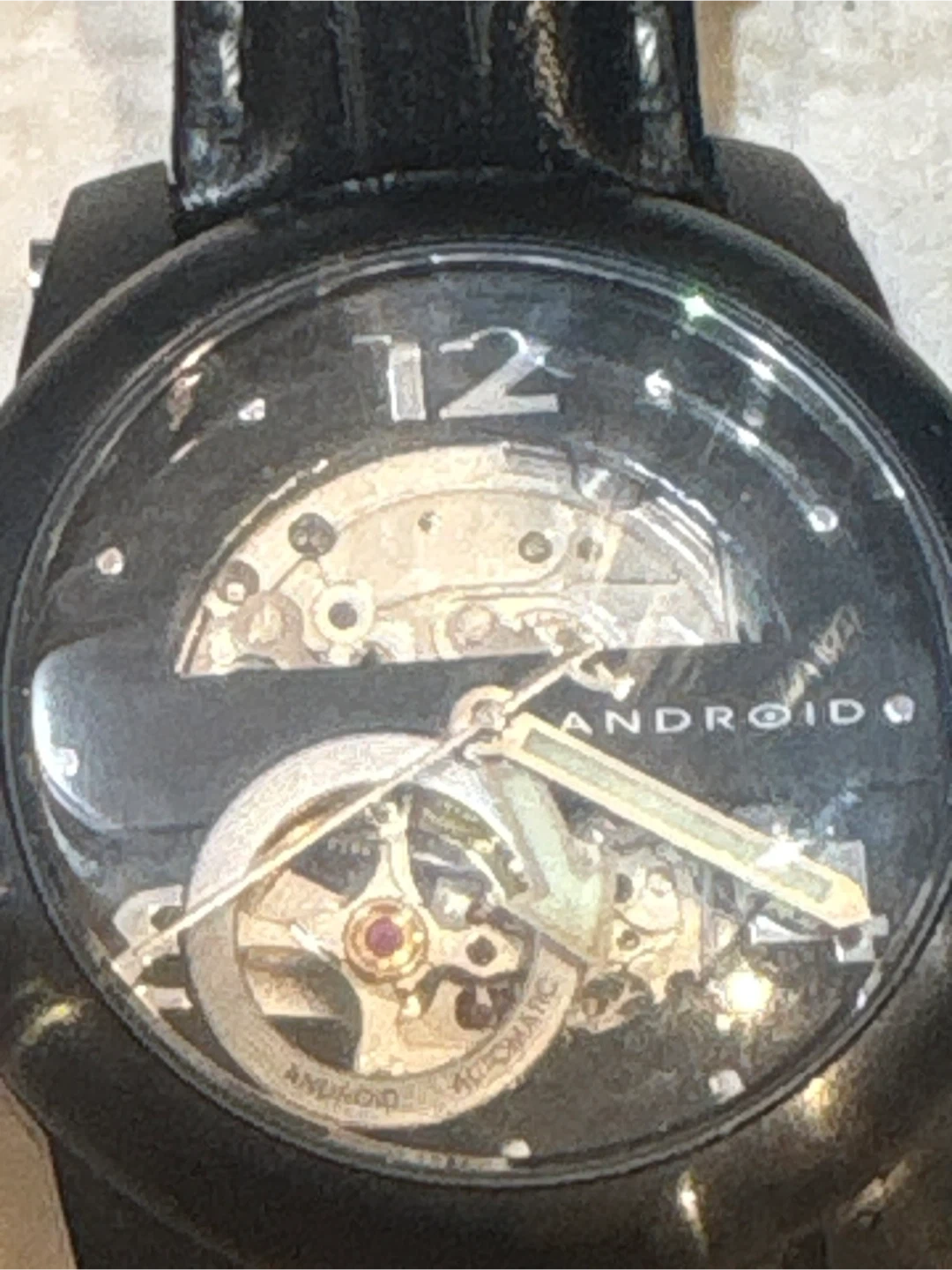 Selling a sleek black Android automatic watch. It's in great condition and ready for a new home! The watch features a unique skeleton design, showcasing the intricate automatic movement. A stylish accessory for any occasion Parkside Drive south of Bloor and keele station area
