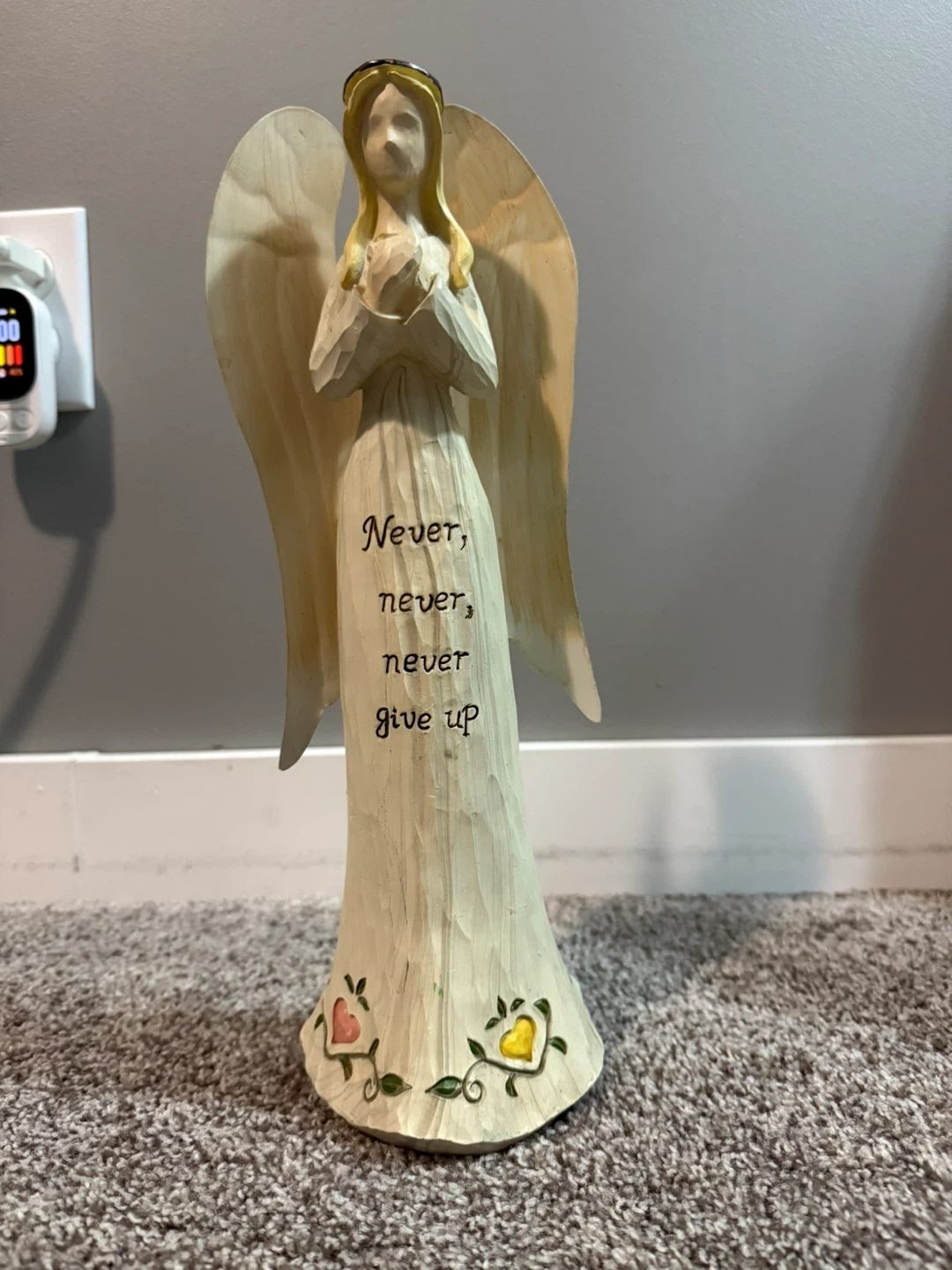 This is a lovely angel figurine that would look great in any room. It has the words "Never, never, never give up" on the front. The base is decorated with hearts and flowers. It's in good condition and ready for a new home it did break in half so I super glued it. You can barely tell but the third picture shows it.