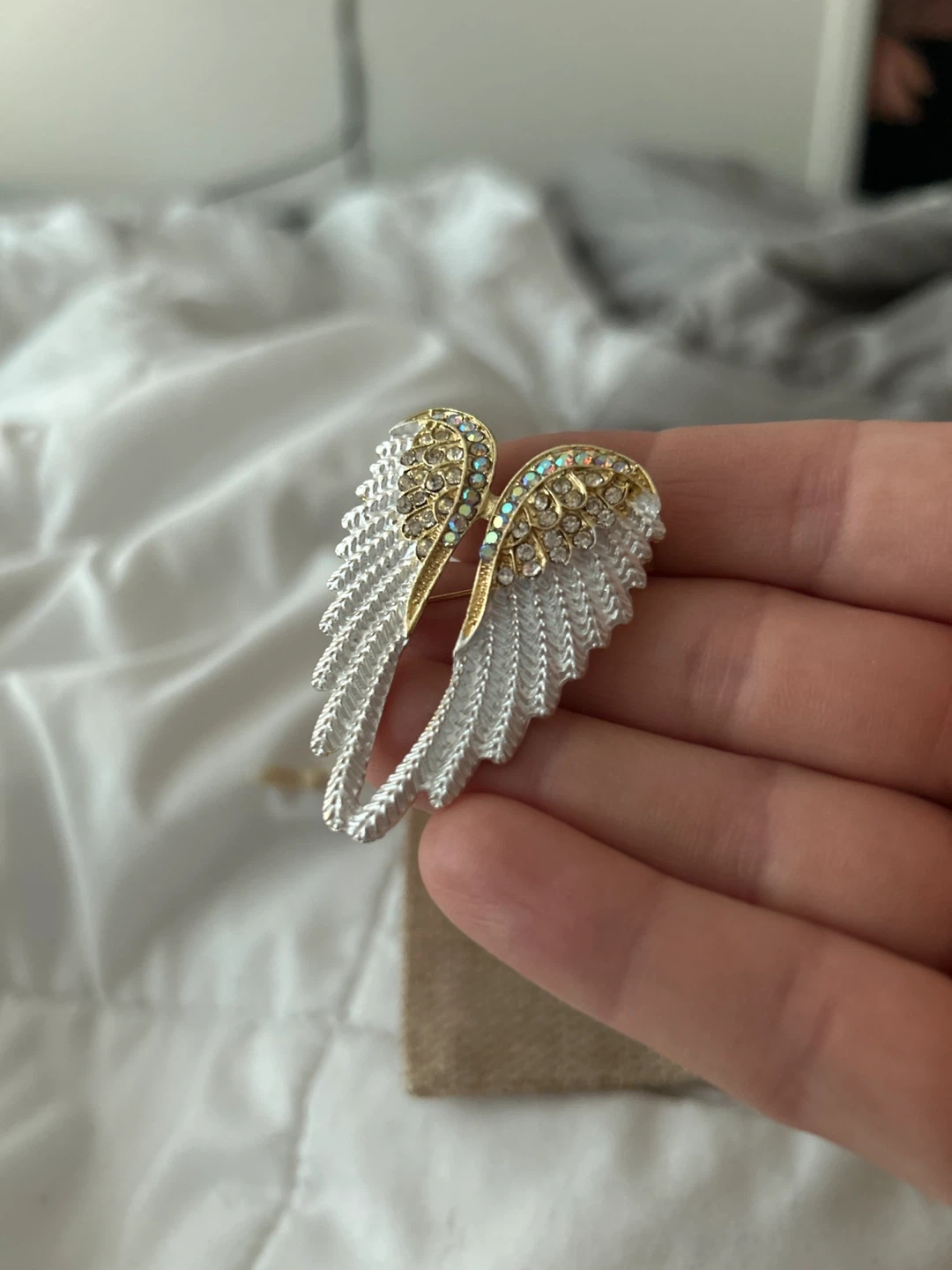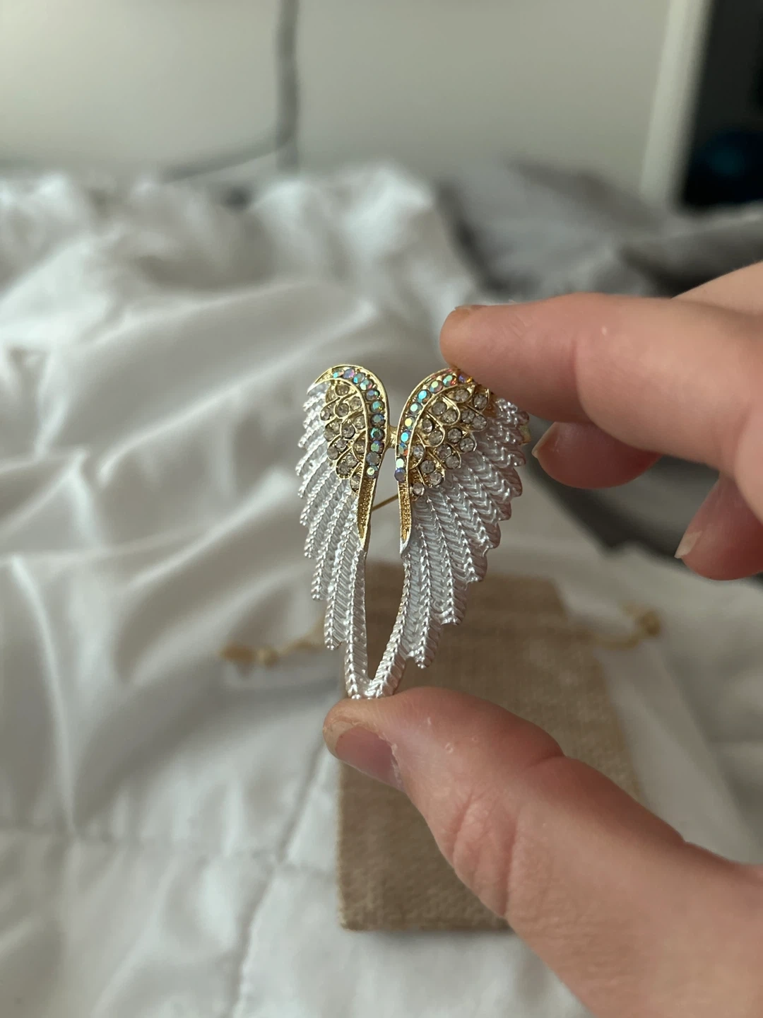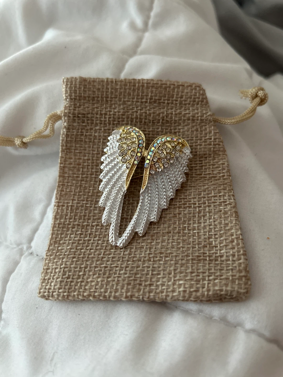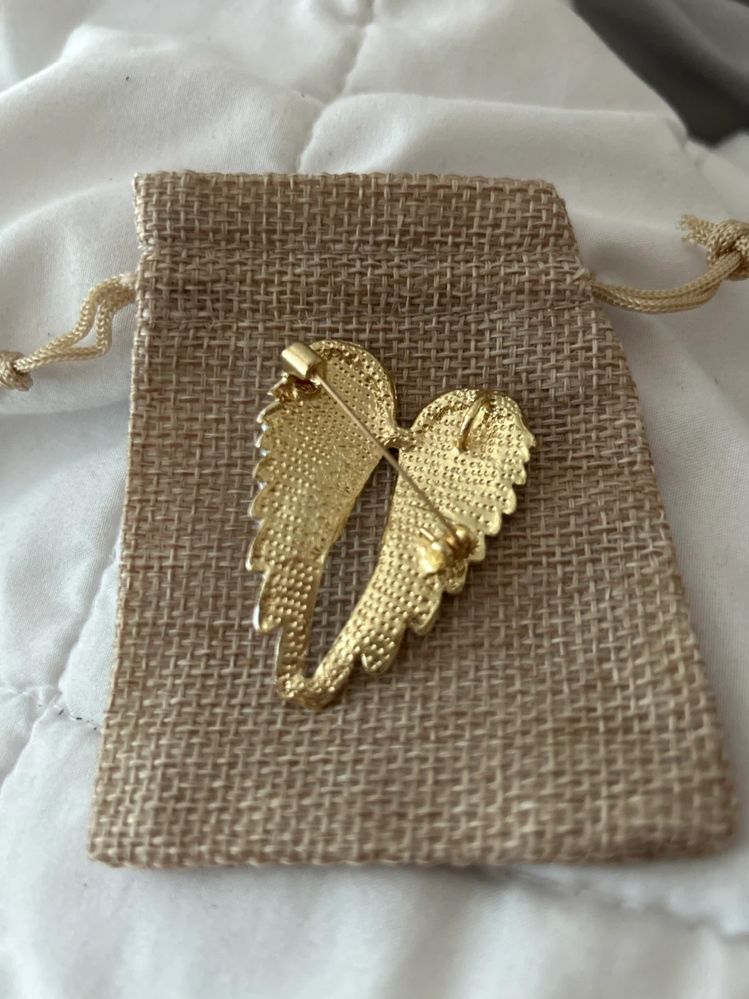 Selling a beautiful angel wing brooch. It features silver and gold tones with some sparkly accents. Comes with a small drawstring bag. New and flawless Please respect pricing God bless 💜