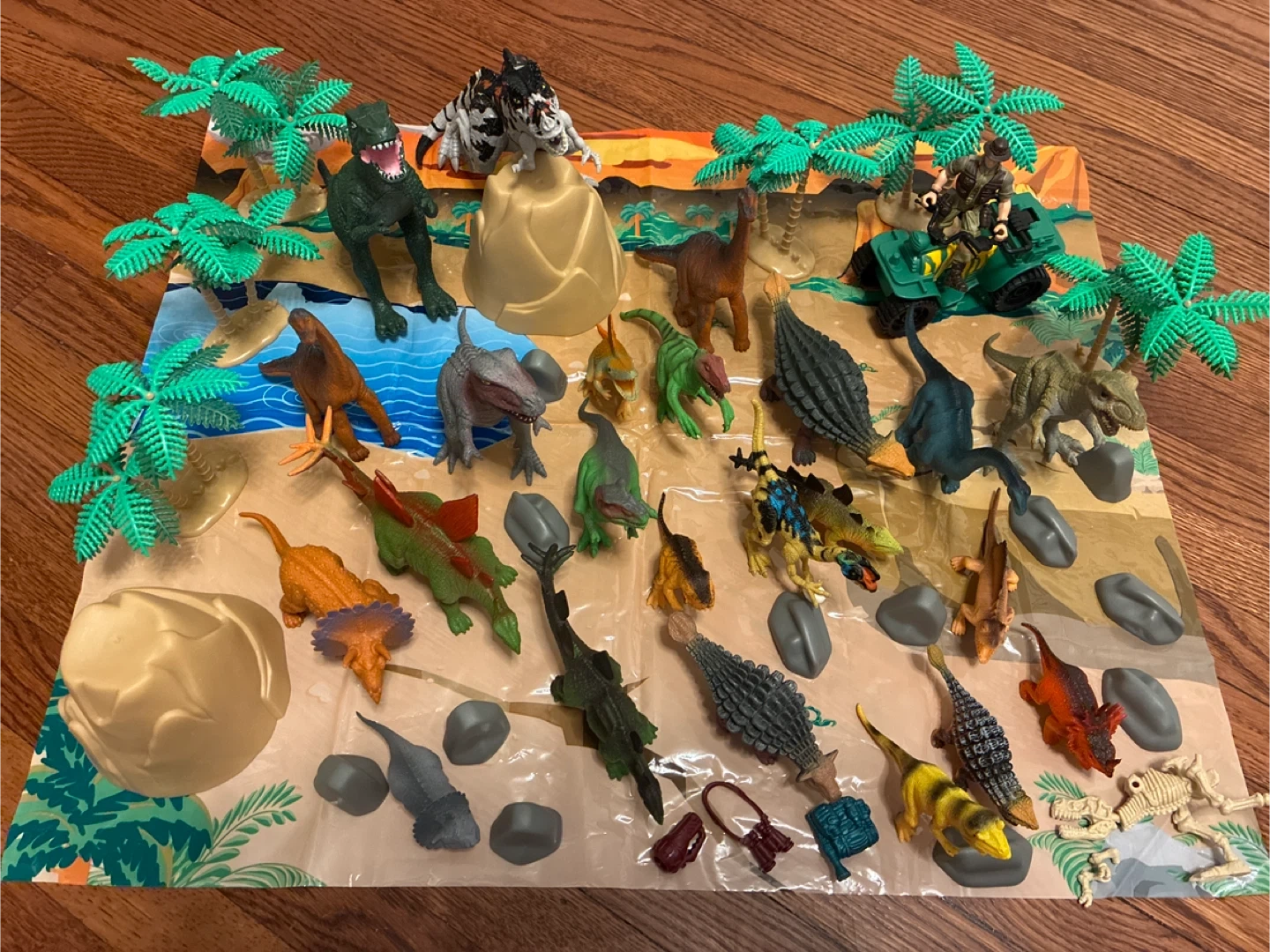 Selling a gently used Animal Planet Mega Dino Tub! This set comes with a variety of dinosaurs, trees, rocks, and a playmat for creating your own prehistoric world. Perfect for any young dinosaur enthusiast!