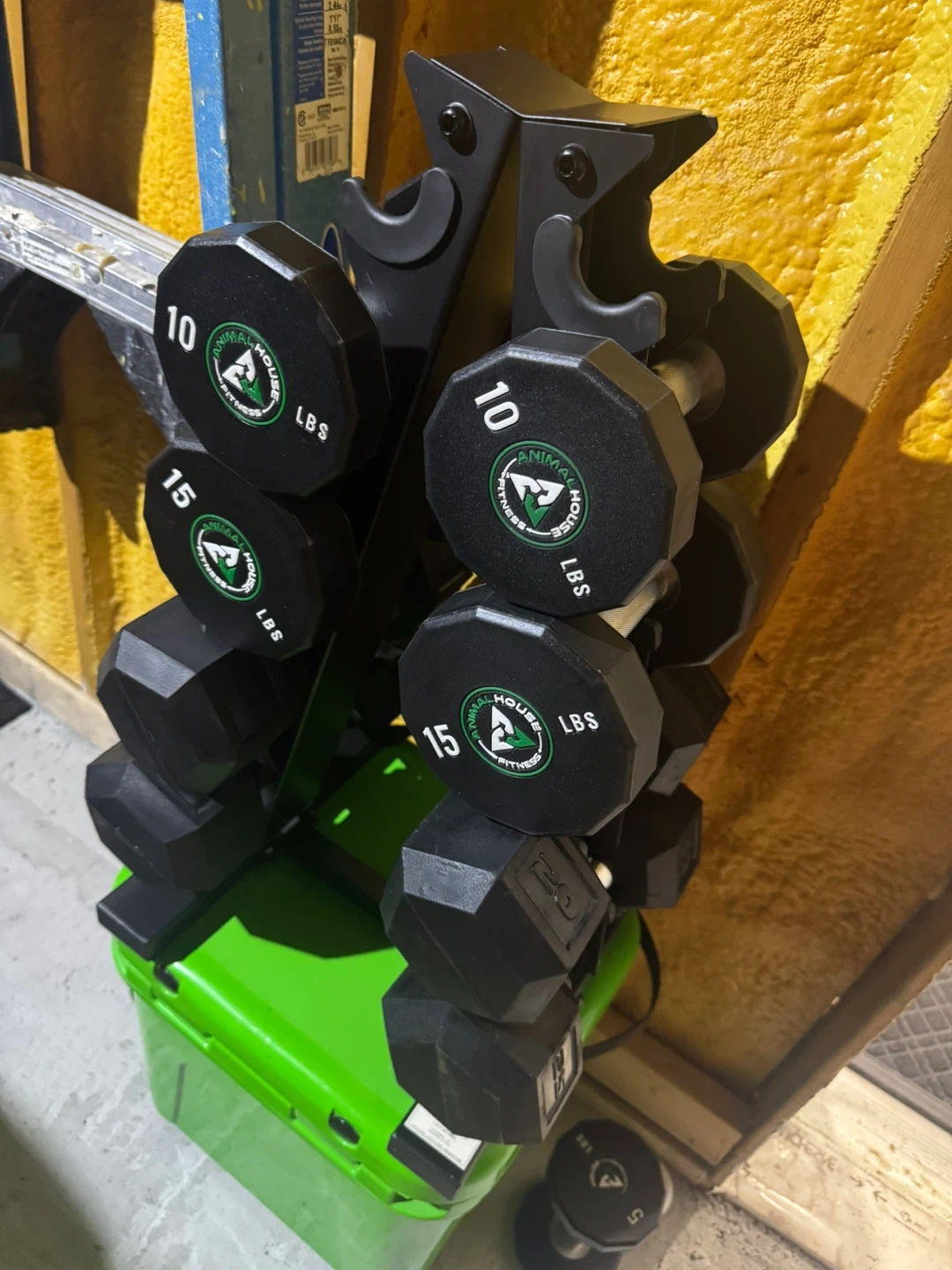 Selling a set of Animalhouse Fitness dumbbells in 5lb 10lb and 15lb weights. Also included is the MonkeyFeet attachment, to complete at home leg workouts . Also available pairs of 20’s and 25’s And weight tree .