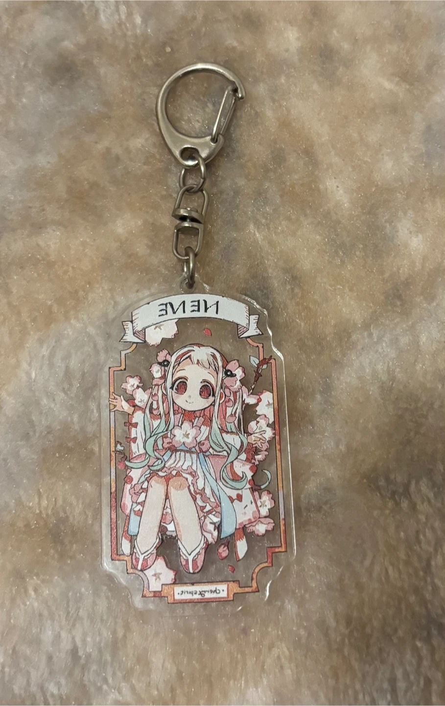 Selling a cute anime character keychain. It features a character with light blue and pink hair, surrounded by cherry blossoms. It's in great condition and ready to add some flair to your keys or bag