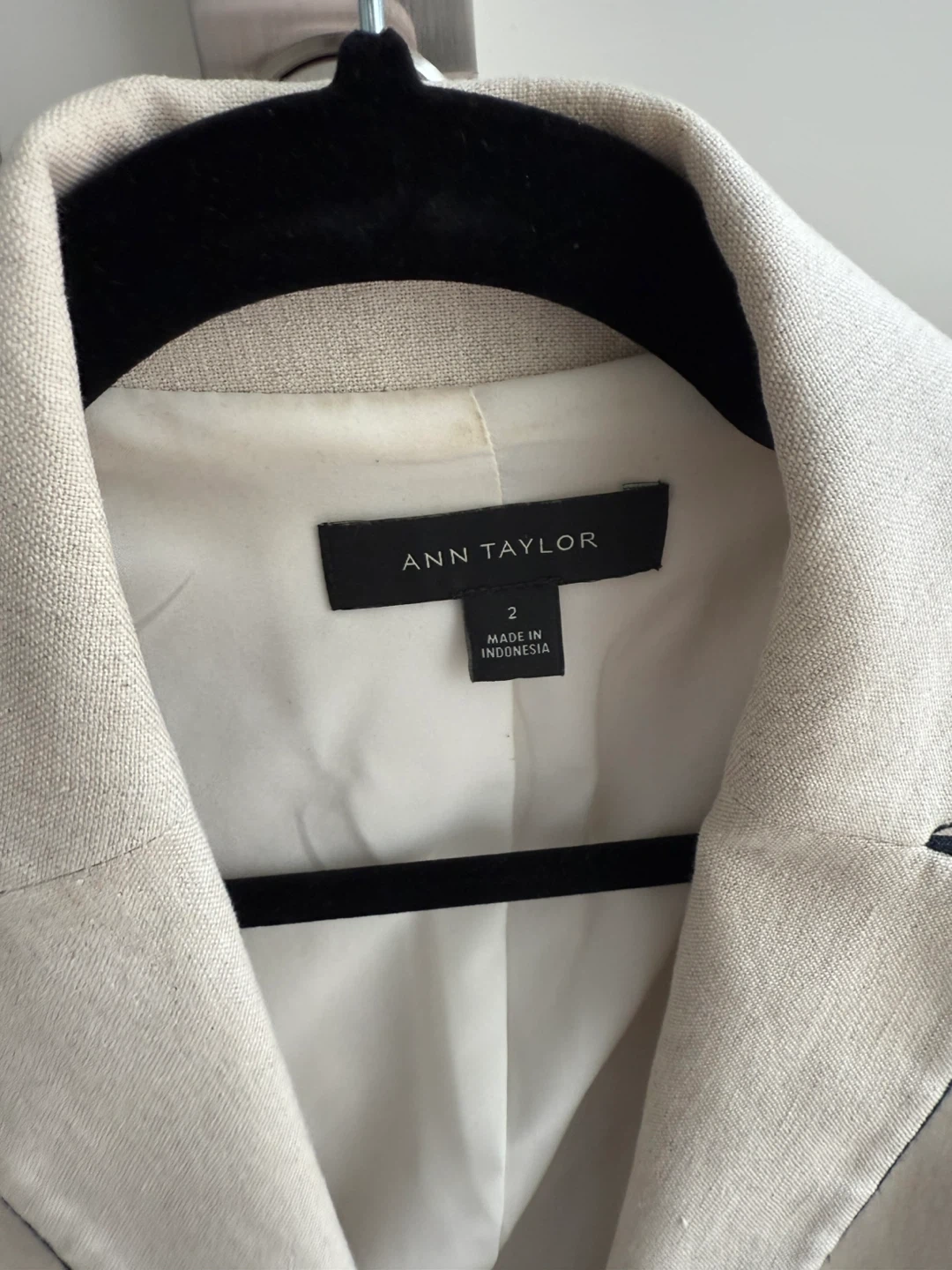 Selling an Ann Taylor blazer in size 2. It's in great condition and ready for a new home! The blazer is a lovely neutral colour with black trim. Perfect for work or a night out