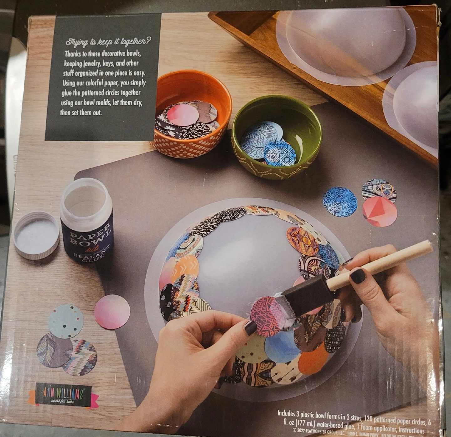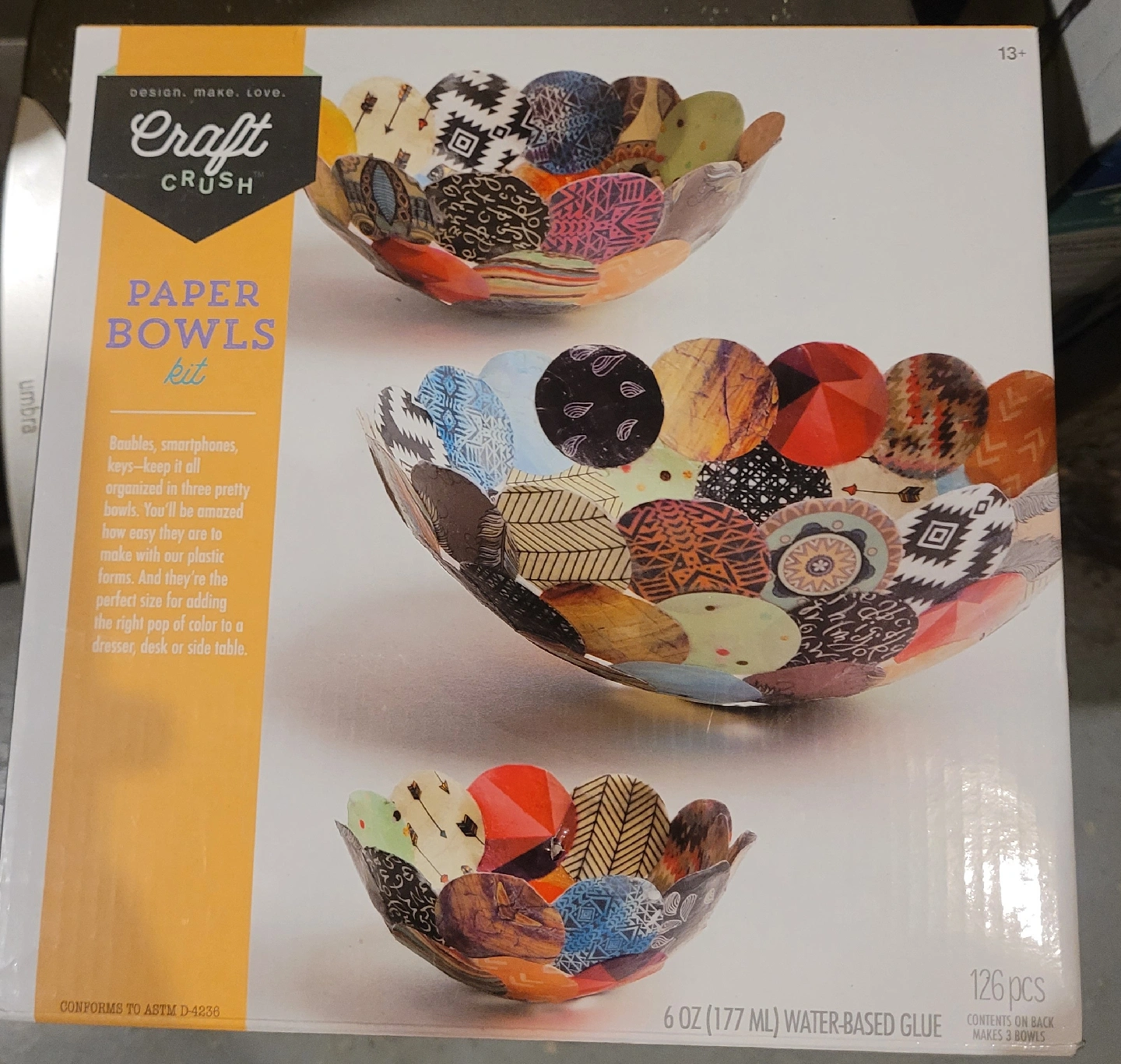 Create delightful and decorative paper bowls with this new Craft Crush Paper Bowls Kit! The kit includes everything needed to make three unique bowls, perfect for organizing small items or adding a touch of handmade charm to your space. With 3 plastic bowl forms, 120 patterned paper circles, and 6 fl. oz (177 ml) of water-based glue, plus a foam applicator, instructions, you'll have a blast crafting. * Includes 3 plastic bowl forms in 3 sizes * 120 patterned paper circles * 6 fl. oz (177 ml) water-based glue * 1 foam applicator * Instructions included If the ad is up, it's available.