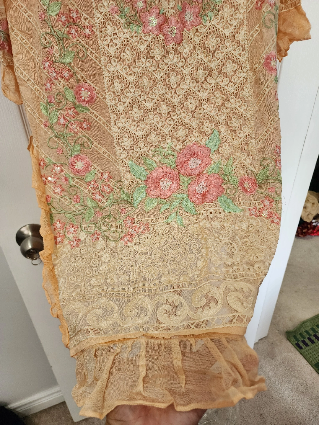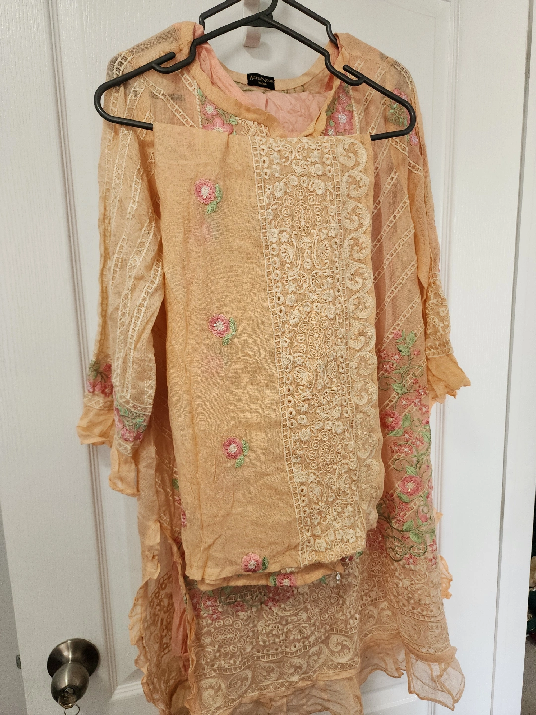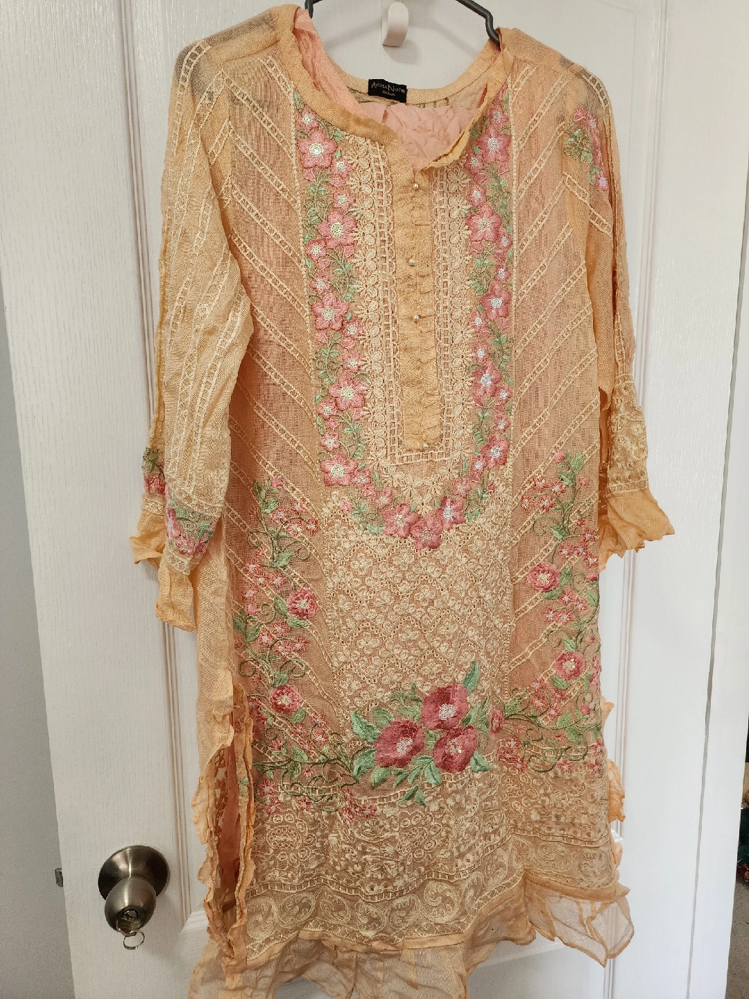 This is a beautiful peach dress by Agha Noor. It features intricate embroidery and a delicate design. Perfect for a special occasion or adding a touch of elegance to your wardrobe!