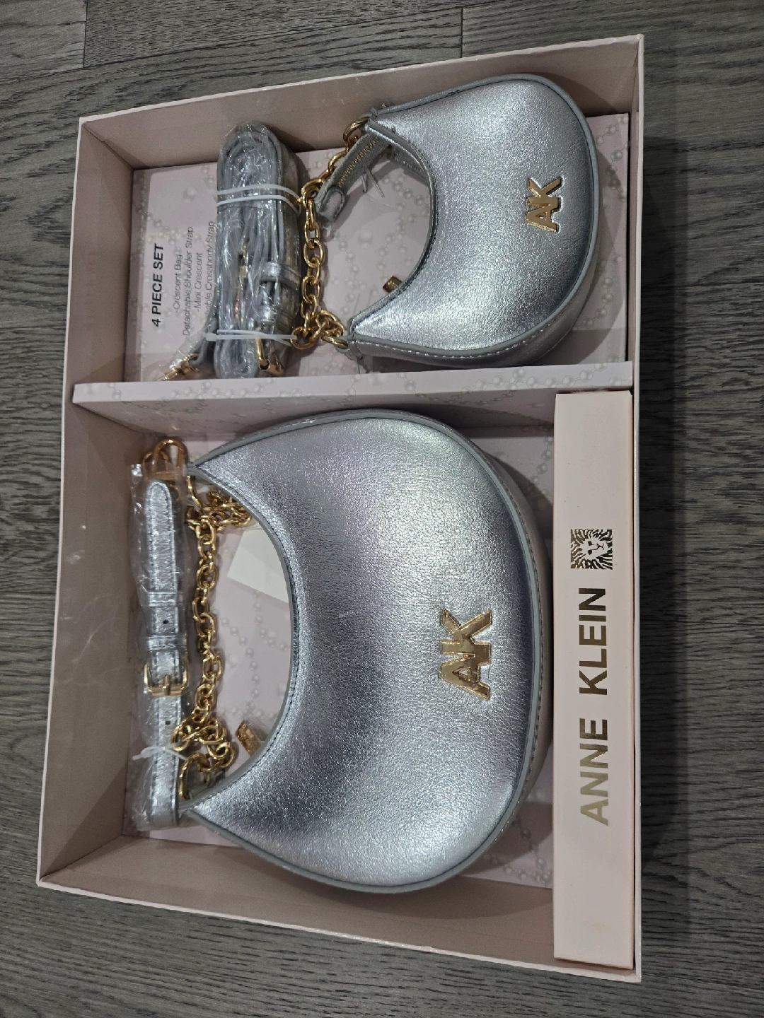 Selling a beautiful Anne Klein 4-piece set that includes a stylish moon crossbody bag! It's a delicate design with a shoulder strap and chain detail. The set comes in its original box, making it perfect for gifting or treating yourself