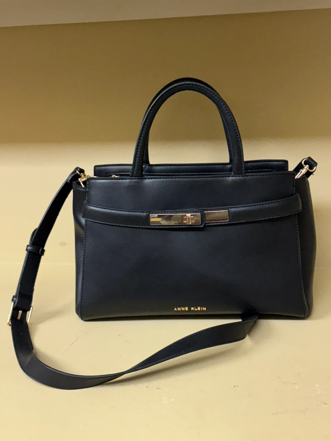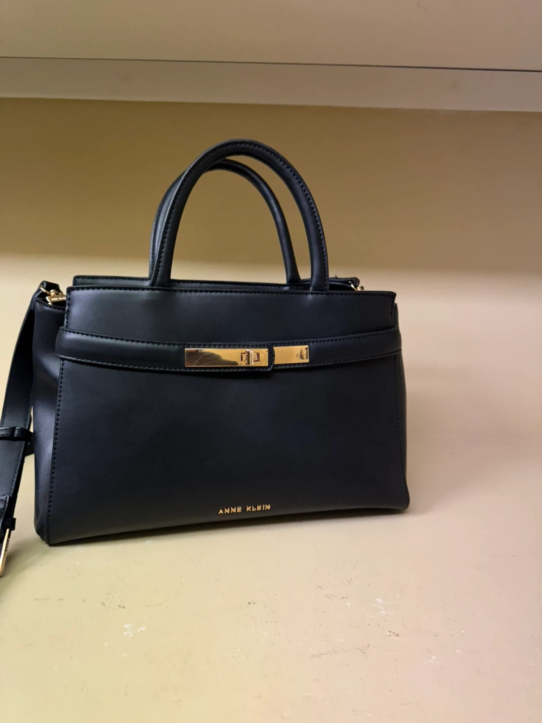 A stylish black handbag from Anne Klein. This bag is perfect for everyday use. It features both handles and a shoulder strap for versatile carrying options. The bag is in great condition and ready for a new home. Only used it once or maybe twice.
