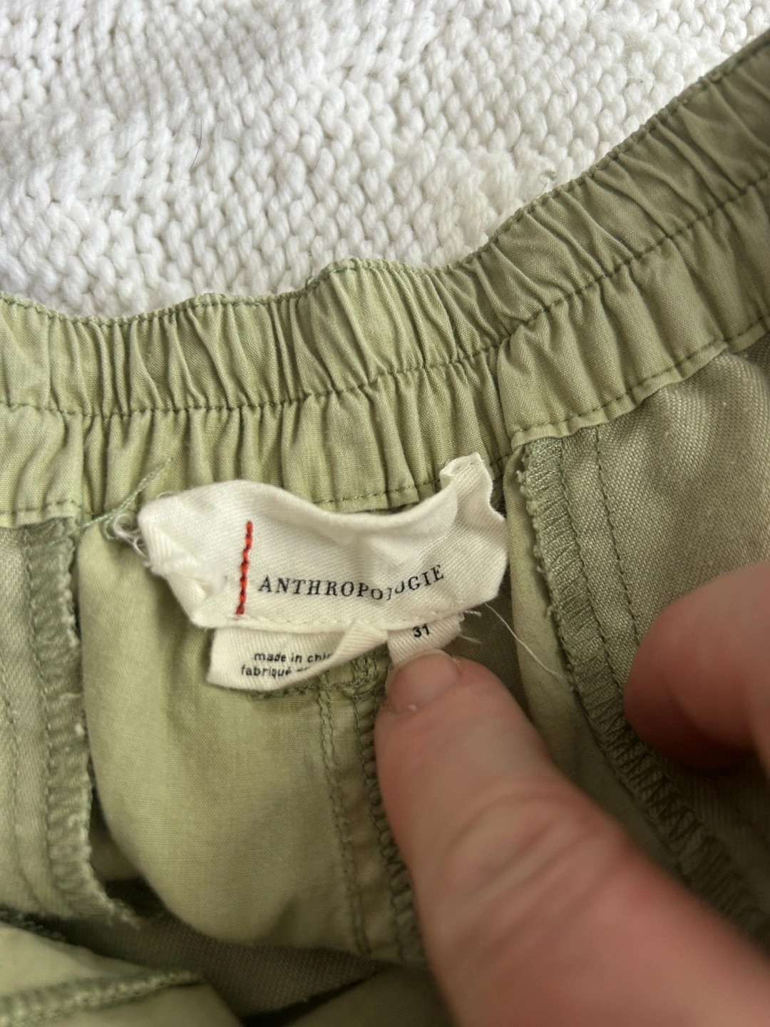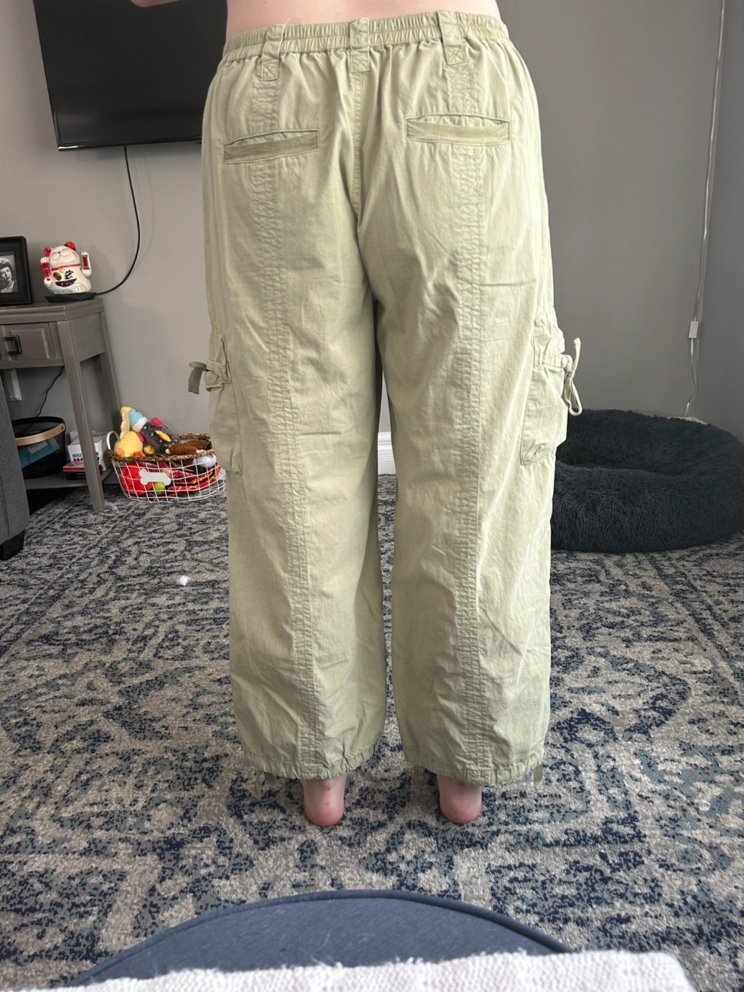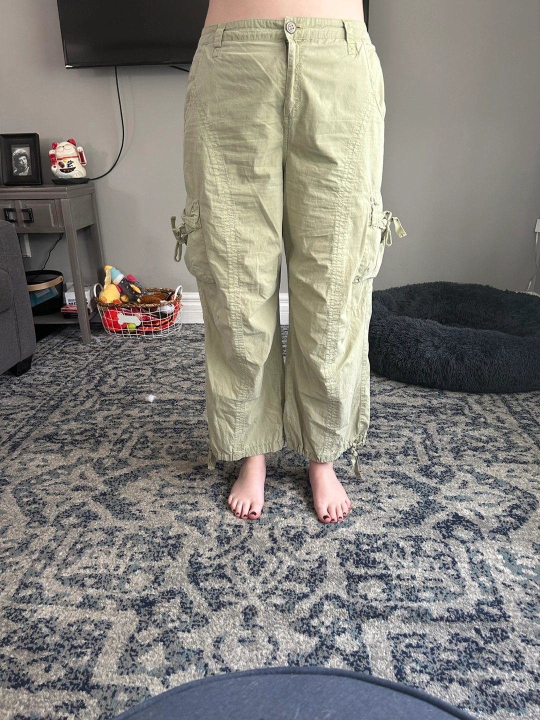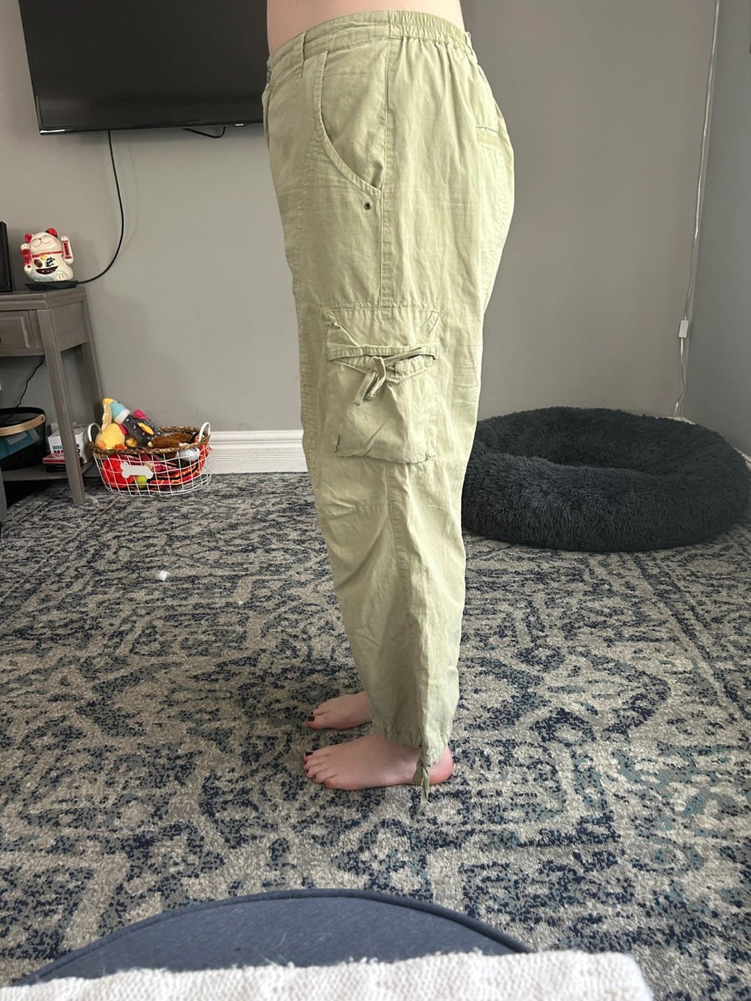 These green cargo pants are ready to be worn. They feature pockets and an elastic waistband. They are a lovely item to lounge around in on a cozy afternoon. Super soft cotton. Size 32