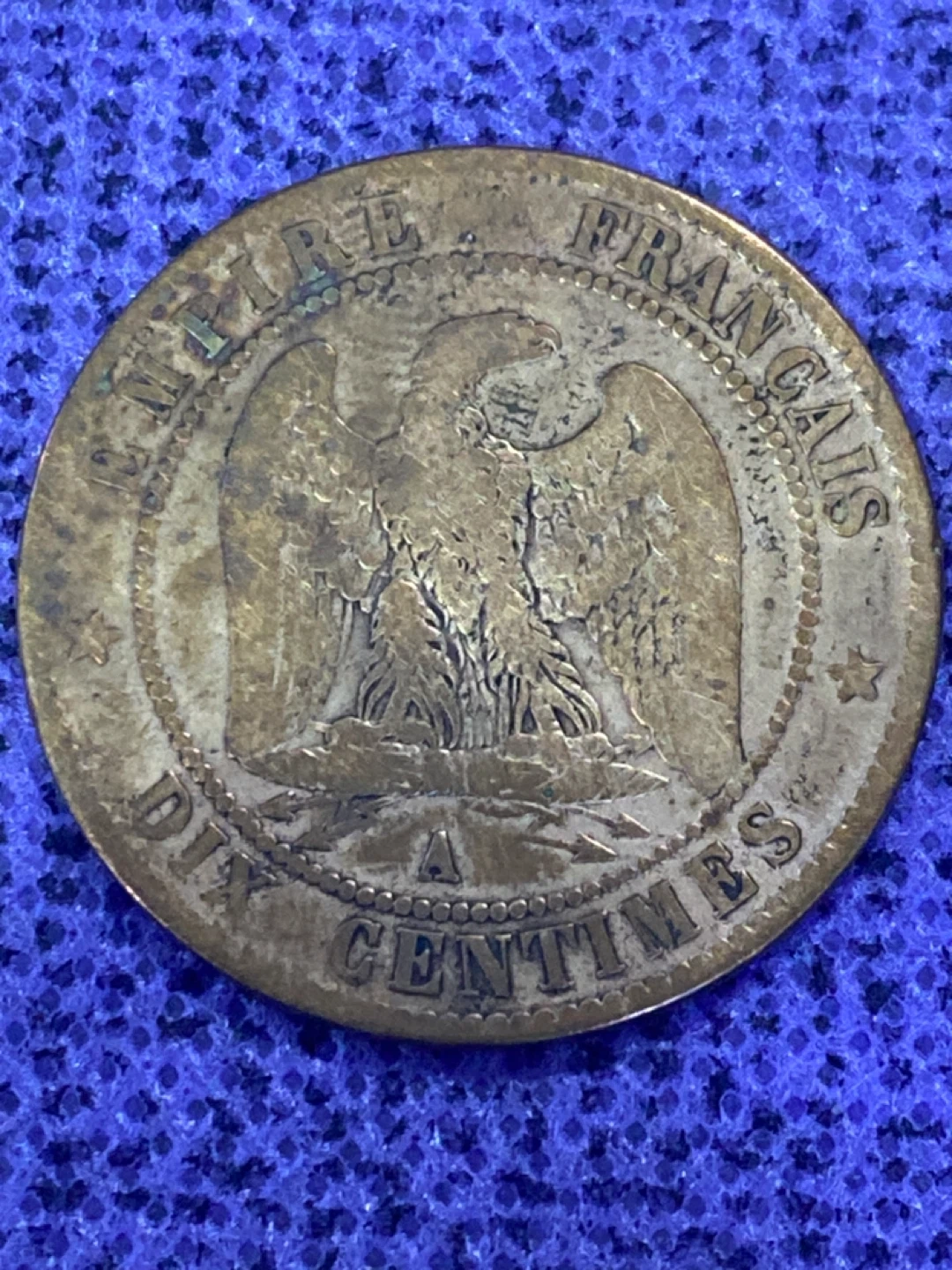 Selling an antique French Empire Dix Centimes coin from 1862. It features an eagle design on one side and a portrait of Napoleon III on the other. A great piece for collectors!