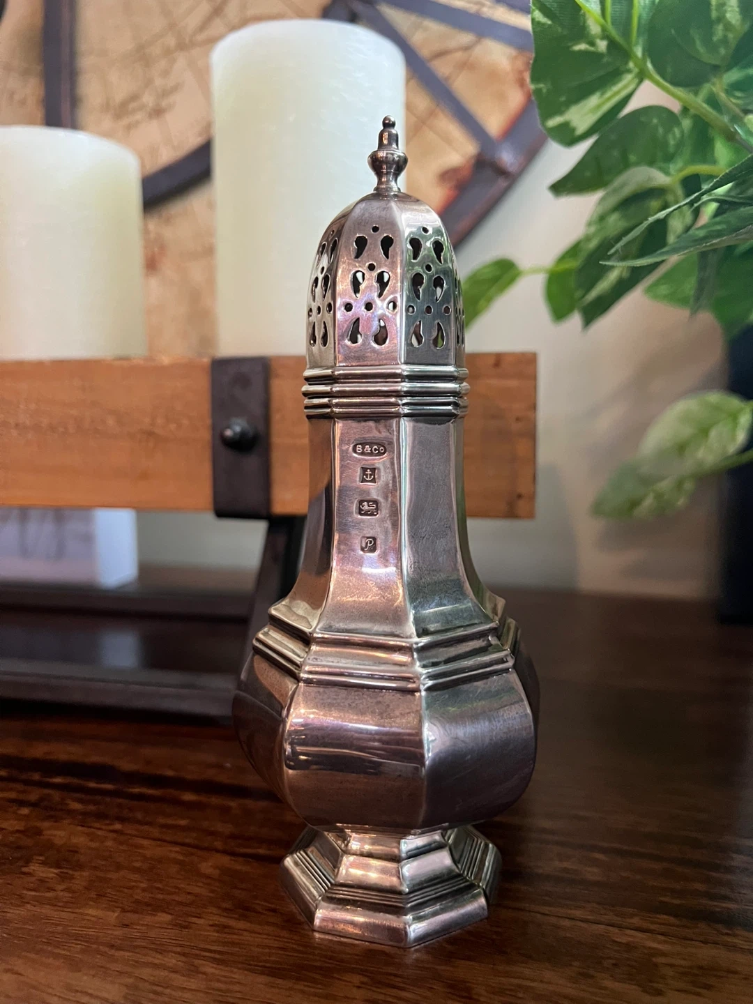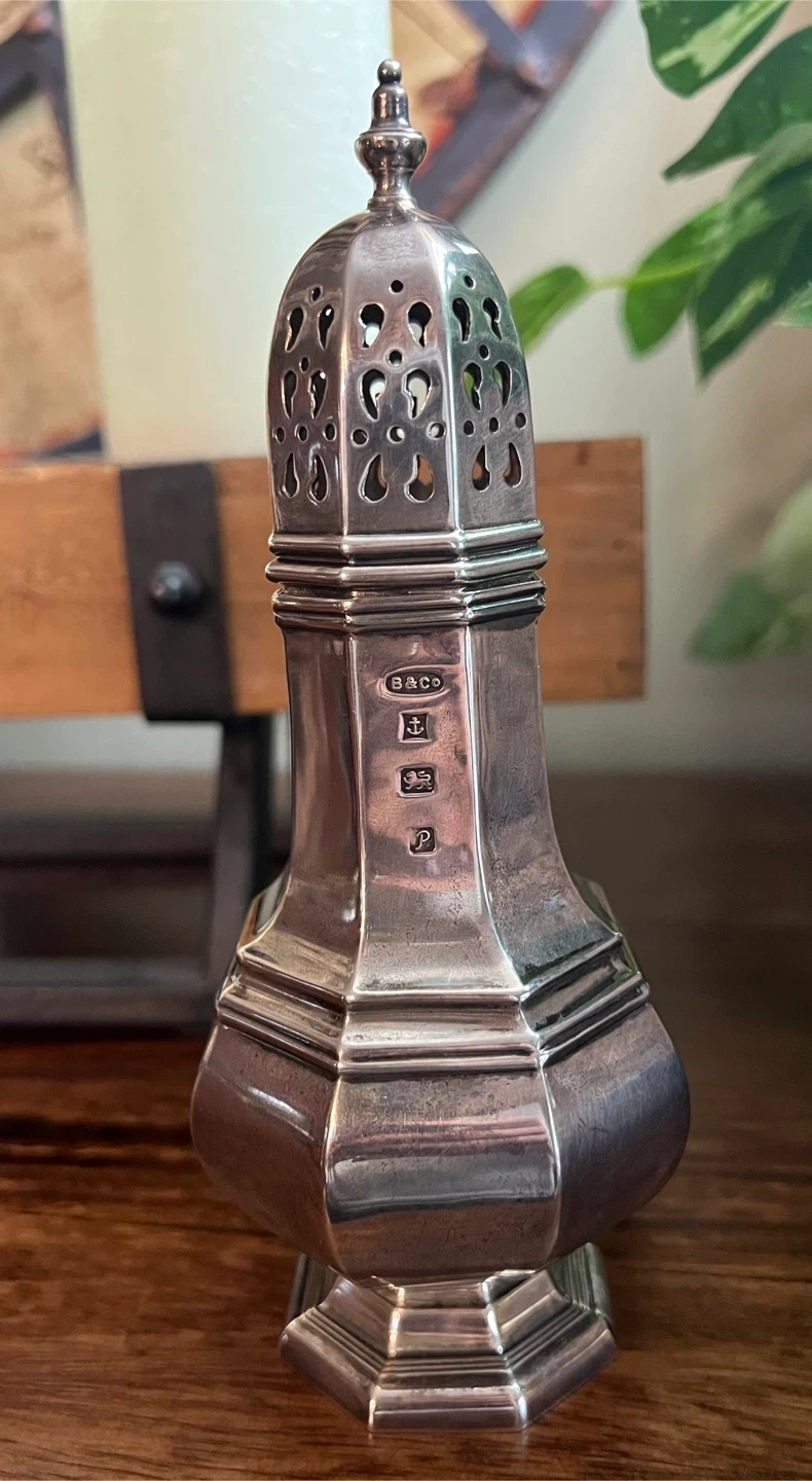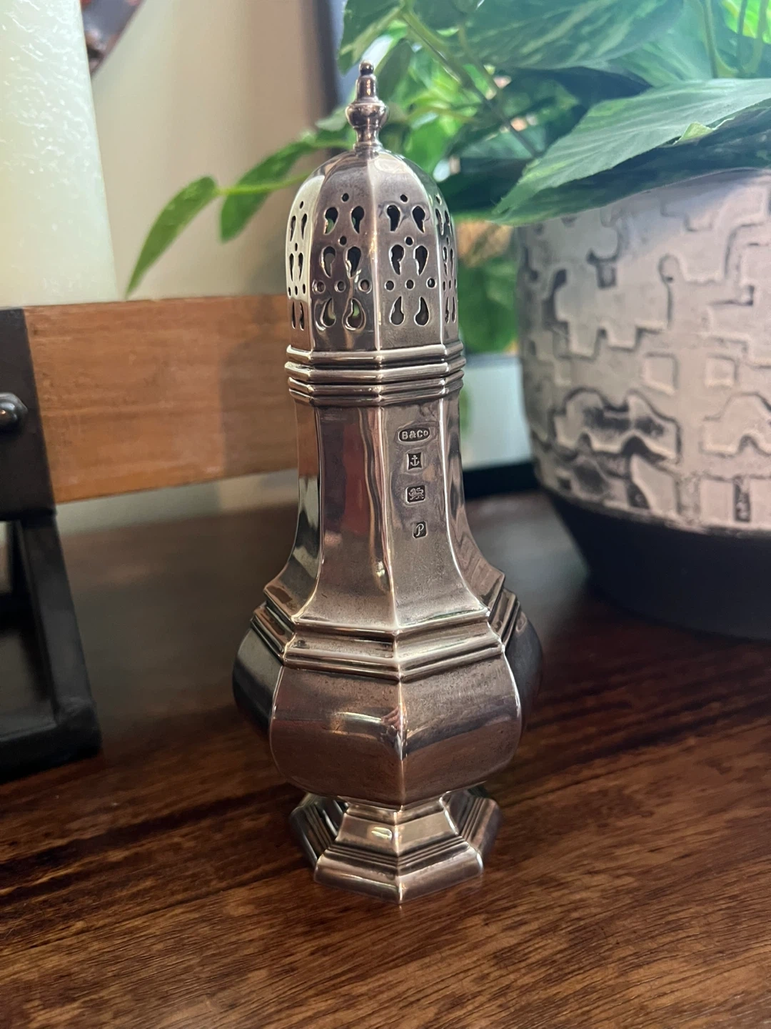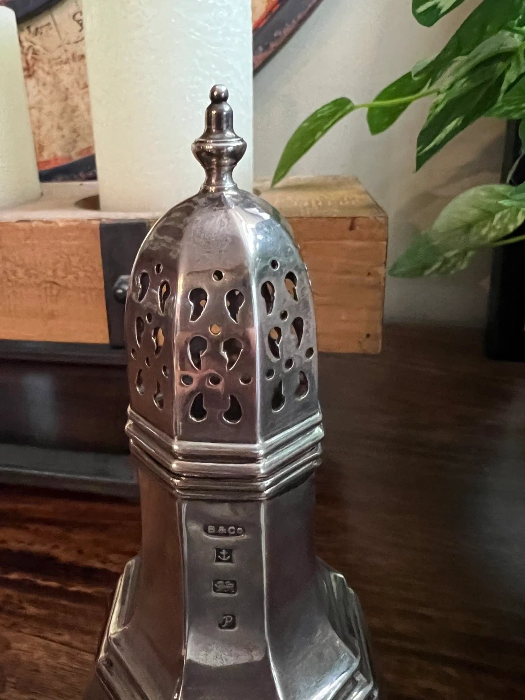 Also known as a muffineer or caster Sugar sifters were used to sprinkle powdered sugar on foods like biscuits, scones, muffins, and desserts Clearly visible hallmarks Lion passant hallmark on the body and the lid - English silver hallmark indicating that a piece is sterling silver (92.5% pure silver) B&Co which stand for Barker Brothers Silversmiths, a company that produced silver goods in Birmingham, England Standing over 7” tall Weights over 157g of silver Great condition Asking $325 Interested? Message me and please check my other listings…
