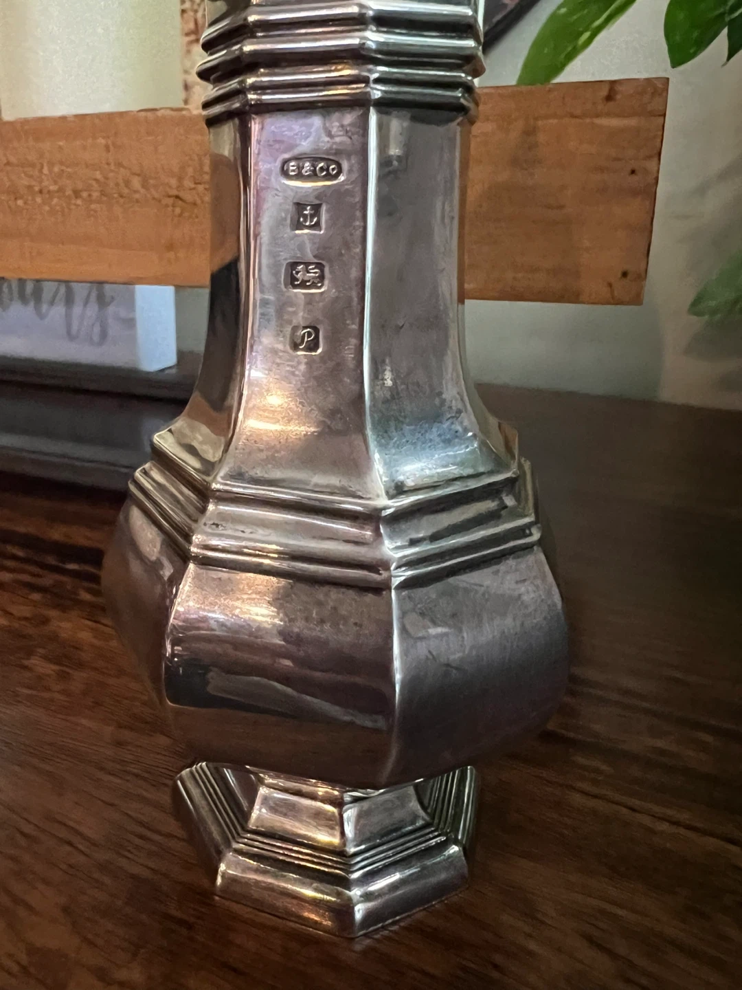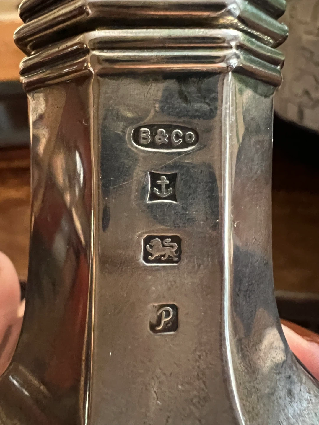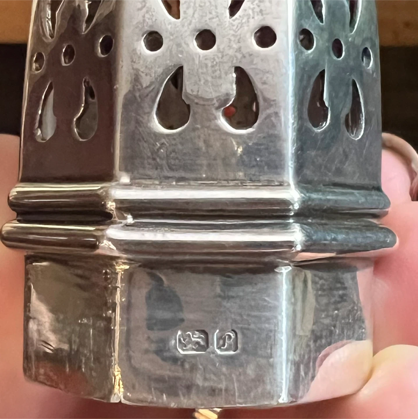 Also known as a muffineer or caster Sugar sifters were used to sprinkle powdered sugar on foods like biscuits, scones, muffins, and desserts Clearly visible hallmarks Lion passant hallmark on the body and the lid - English silver hallmark indicating that a piece is sterling silver (92.5% pure silver) B&Co which stand for Barker Brothers Silversmiths, a company that produced silver goods in Birmingham, England Standing over 7” tall Weights over 157g of silver Great condition Asking $325 Interested? Message me and please check my other listings…