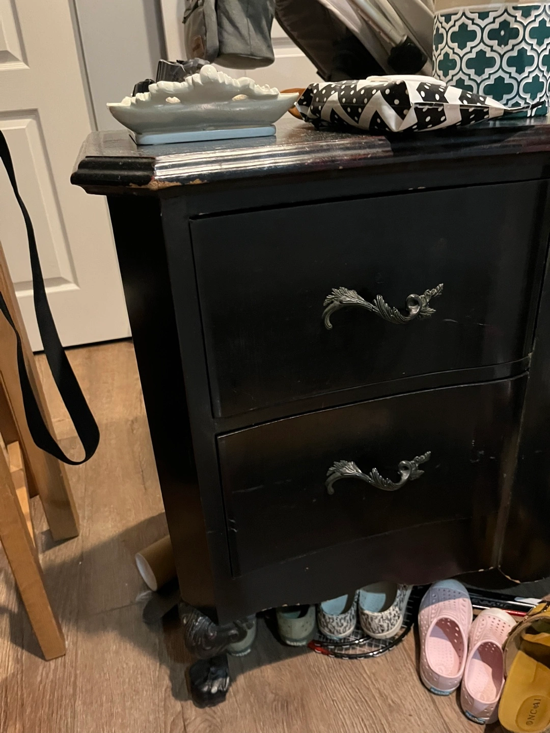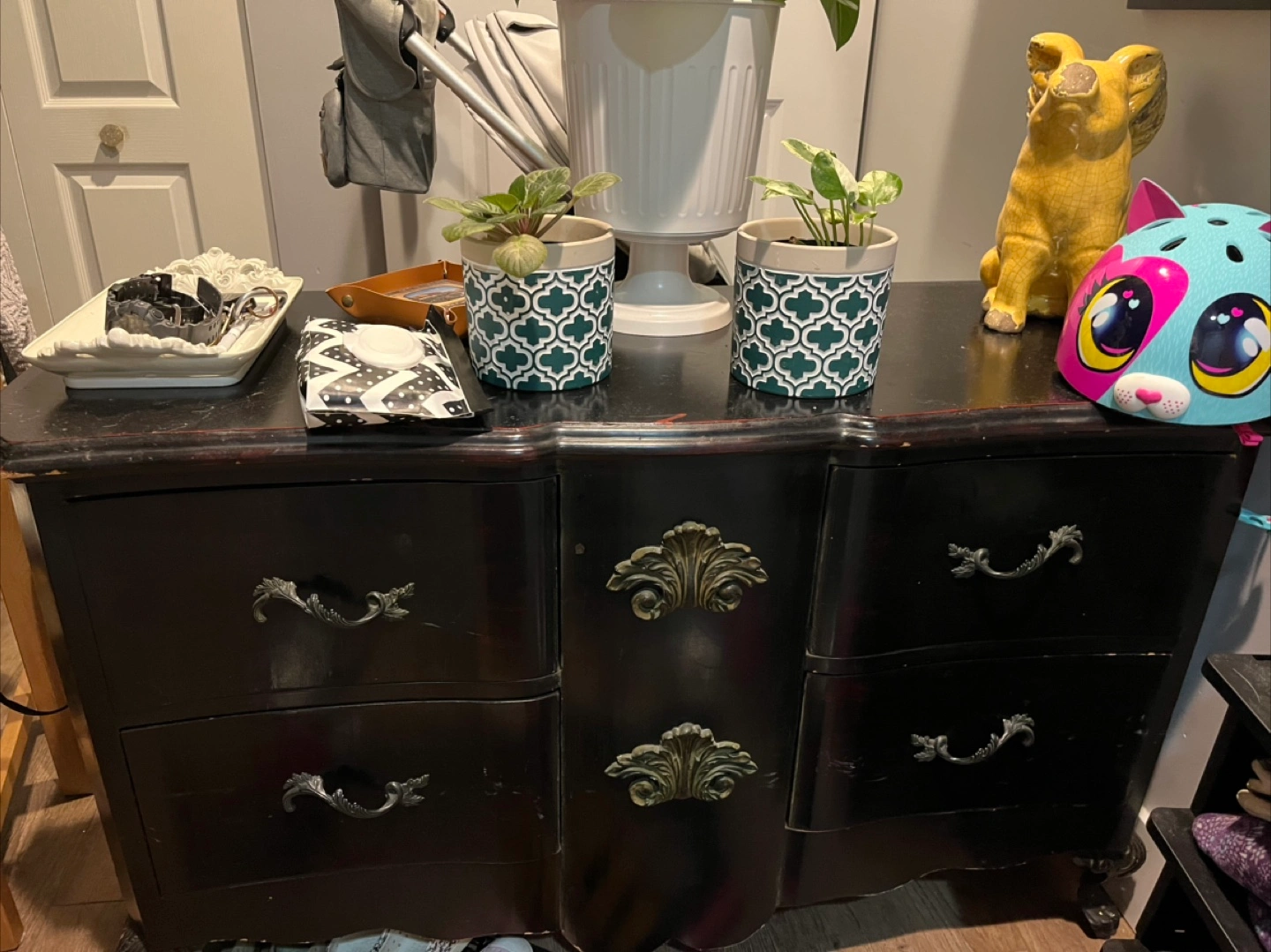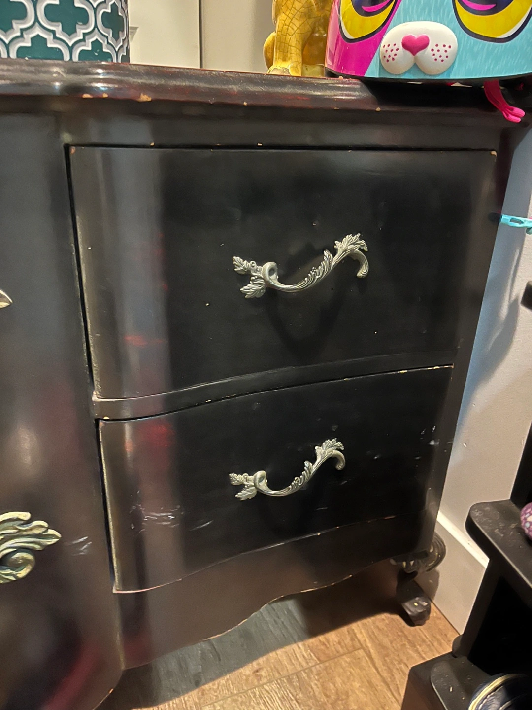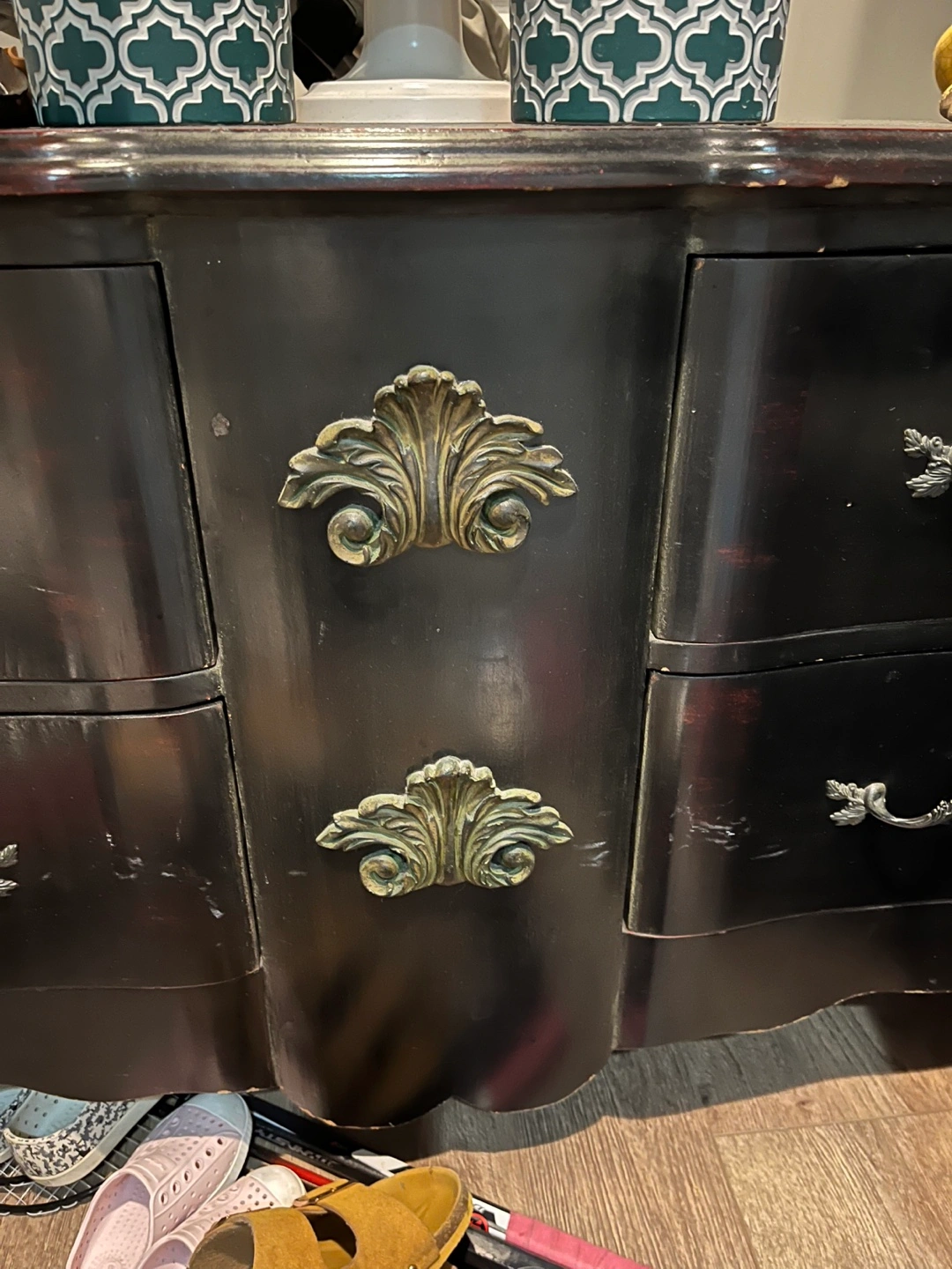 Selling a charming antique black dresser. It features ornate handles and a classic design. It has a few signs of wear, but it's still a beautiful and functional piece for any home
