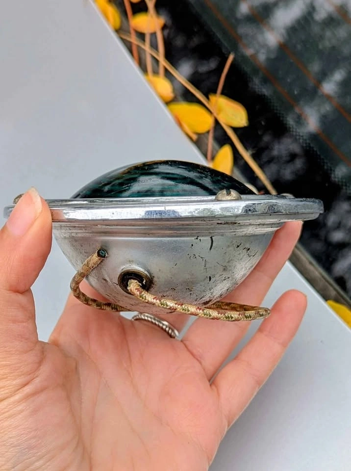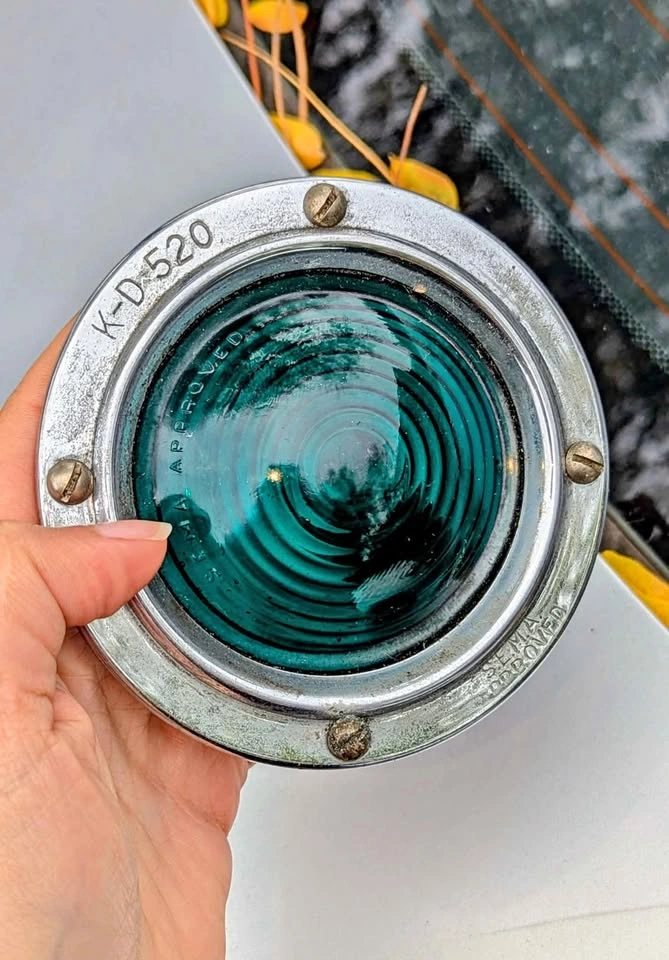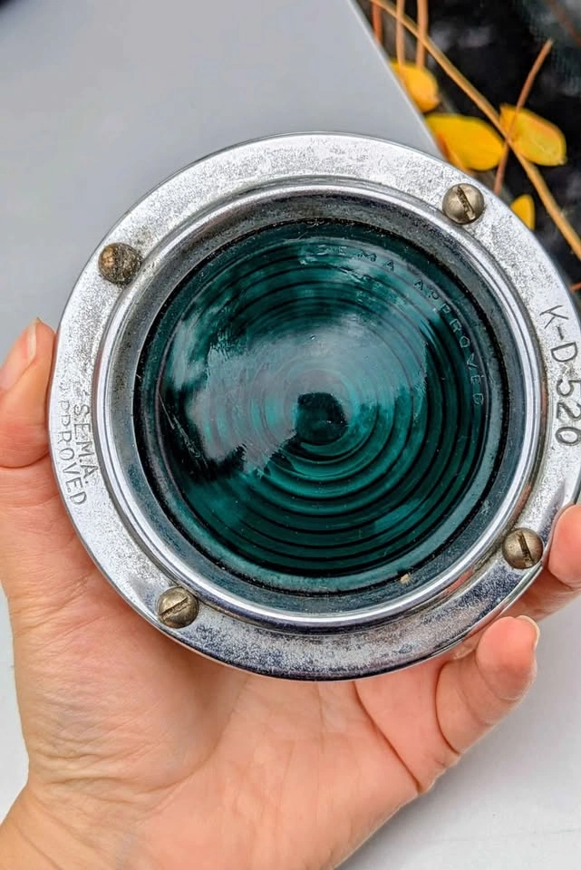 Vintage rare green marker light Heavy-duty round marker light with a domed green glass Fresnel lens and cast/chrome bezel stamped “K-D 520” and “SEMA APPROVED.” Original cloth-wrapped lead intact; case grounds through the housing. Likely 1940s K-D Lamp Co. (Cleveland, USA) equipment used on trucks/industrial vehicles and popular today for rat rods, hot rods, trailers, shop décor, or marine/utility projects. •Untested •Green glass Fresnel, domed •Chrome/metal, 4 machine screws •stamped steel cup with cloth-wrapped single lead (housing ground) •(approx.): 4 in diameter , 2 in dome depth