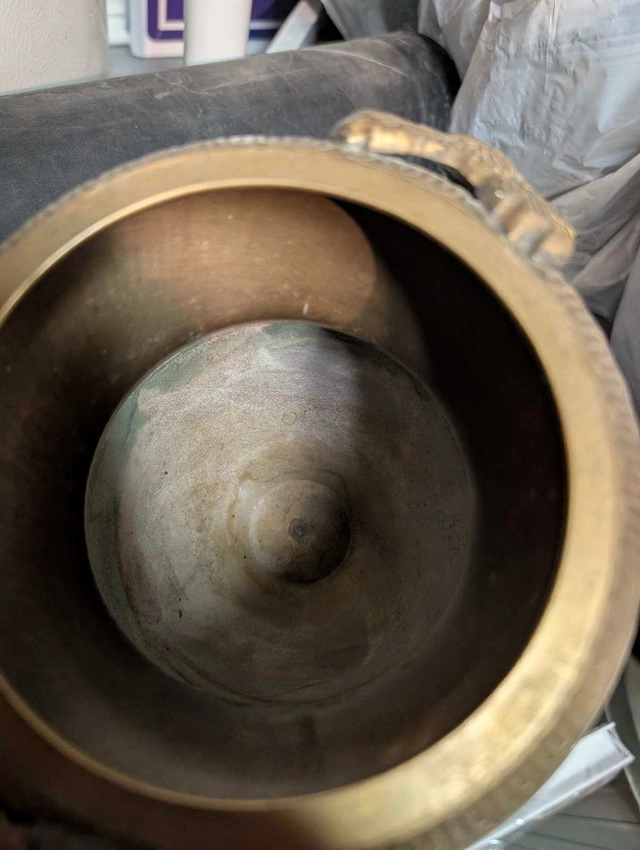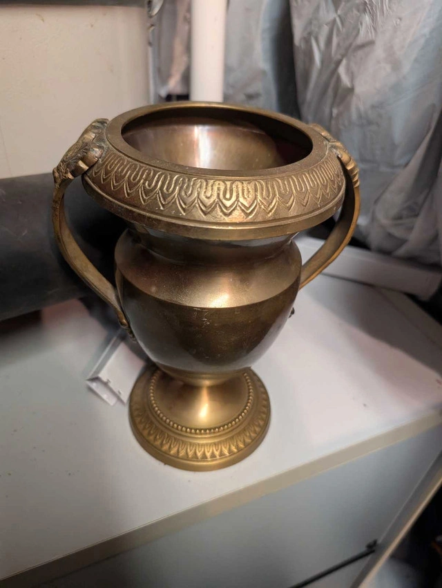 This pre-owned brass vase features decorative handles, adding a touch of elegance to any space. Its unique design and warm metallic tone make it a standout piece. Please note it is in good, used condition, with some signs of wear that add to its vintage charm. * Material: Brass * Style: Vintage * Handles: Decorative lion head design Looking to add a bit of old-world charm to your decor? This vase is perfect! And yes, if you're seeing this ad, it's still available!