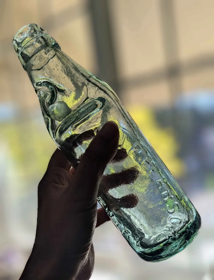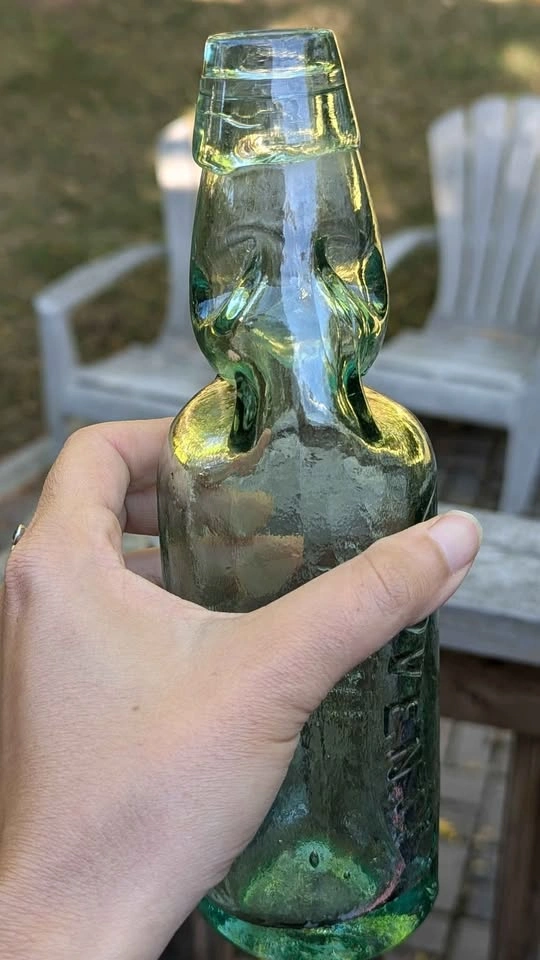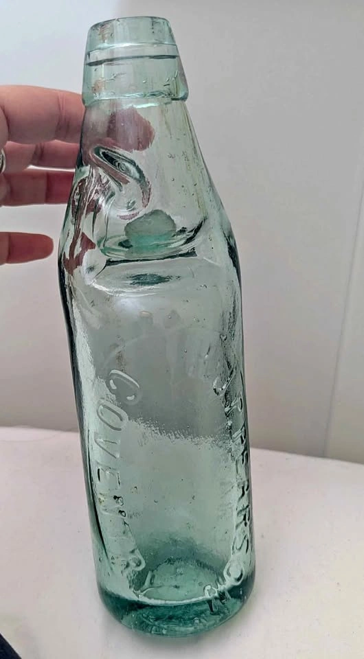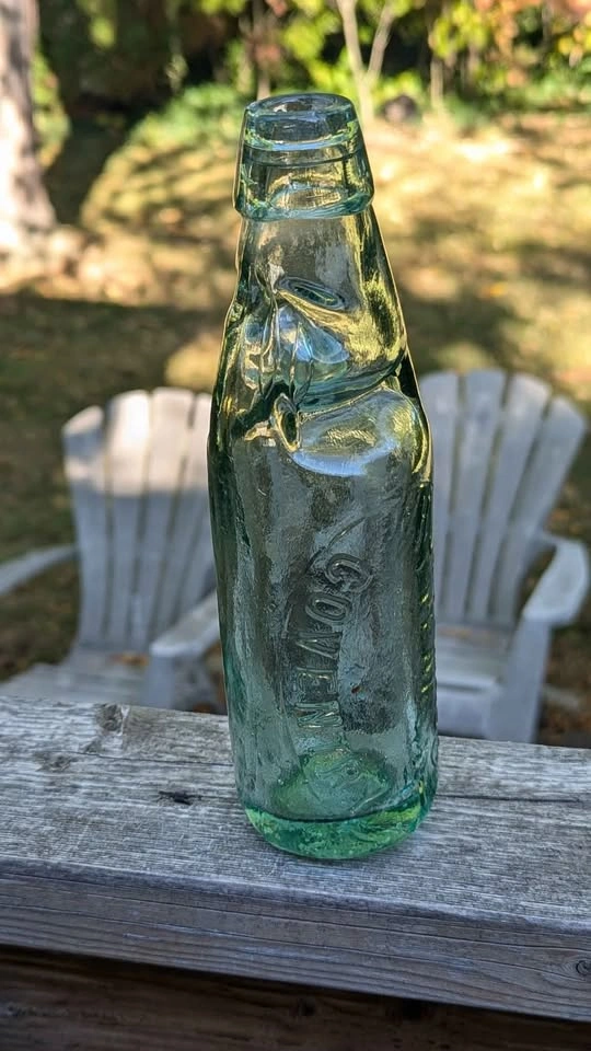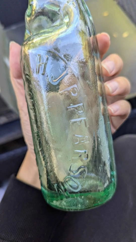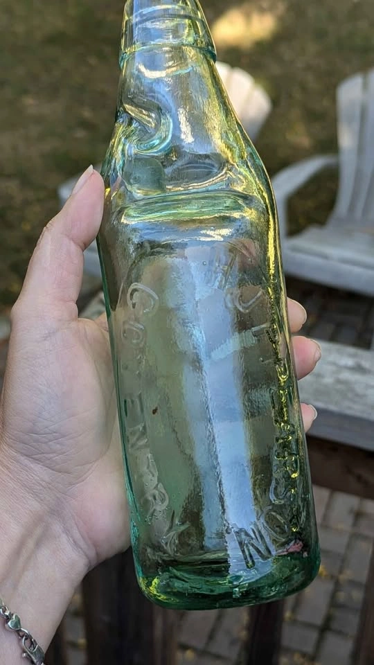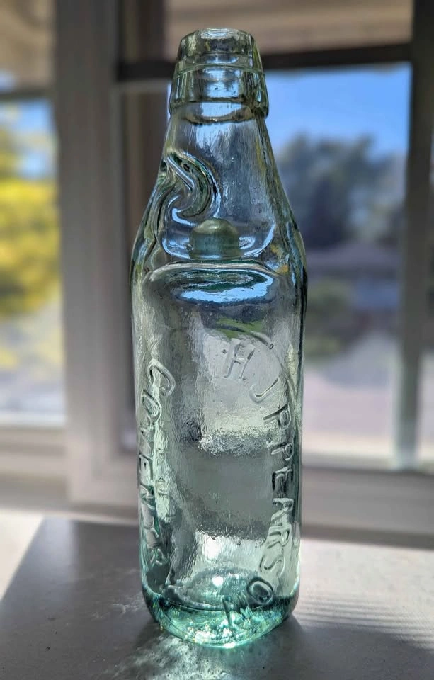 Absolutely beautiful condition. No cracks or chips. Marble in tact, clear and good bubbles visible. Authentic late-1800s Codd-neck mineral water bottle from H. J. Pearson & Co., Coventry, England. Hand-blown aqua-green glass with natural bubbles and “COVENTRY - HJPPEARSON" embossing. Designed with the original marble seal invented by Hiram Codd (1872). A true relic of Victorian soda history and a stunning display piece for any antique bar or kitchen shelf.
