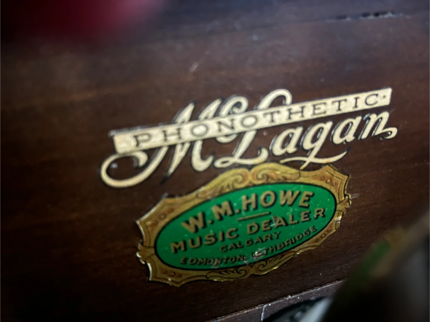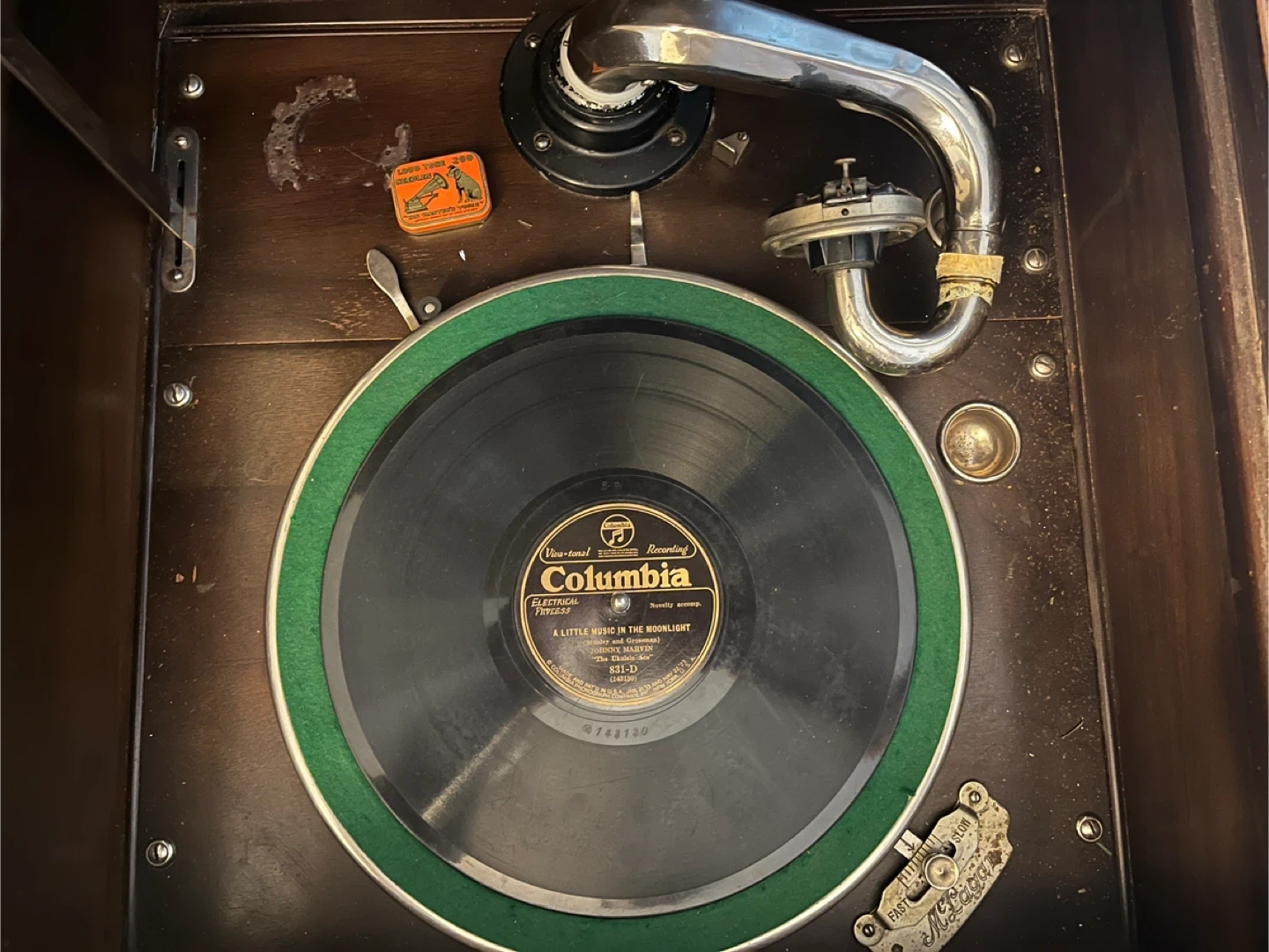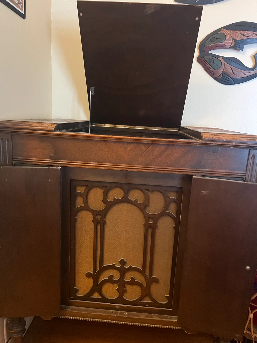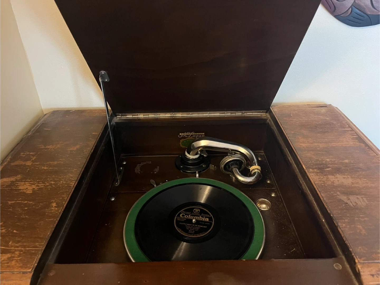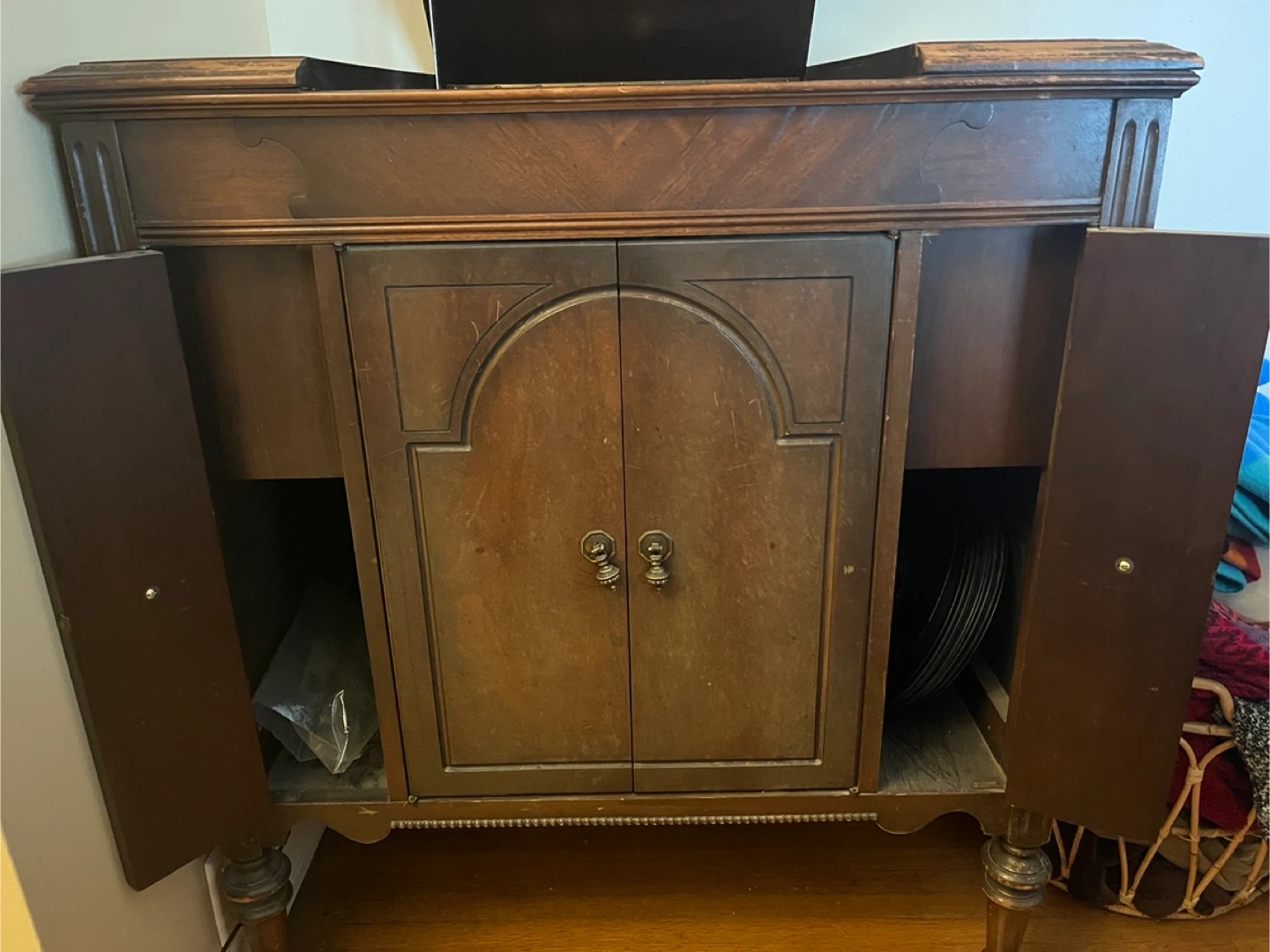 Amazing deal for an antique! Selling an antique Columbia Grafonola record player cabinet. This piece features a beautiful dark wood finish and ornate detailing. It includes a record player and storage space for records. A unique addition to any home! Priced based on appearance of top and needs service.
