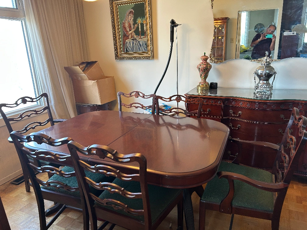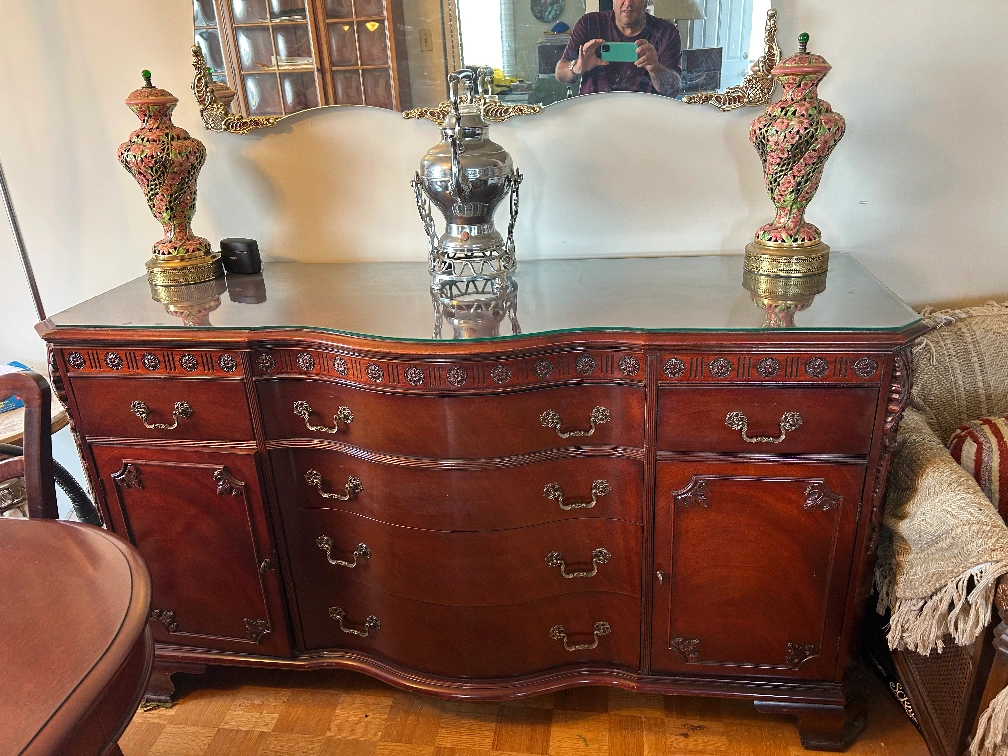 Selling a beautiful antique dining set with chairs and a matching display cabinet. The set has a rich, dark wood finish and ornate detailing. It would be perfect for adding a touch of elegance to any dining room. Also included is a lovely buffet and hutch.