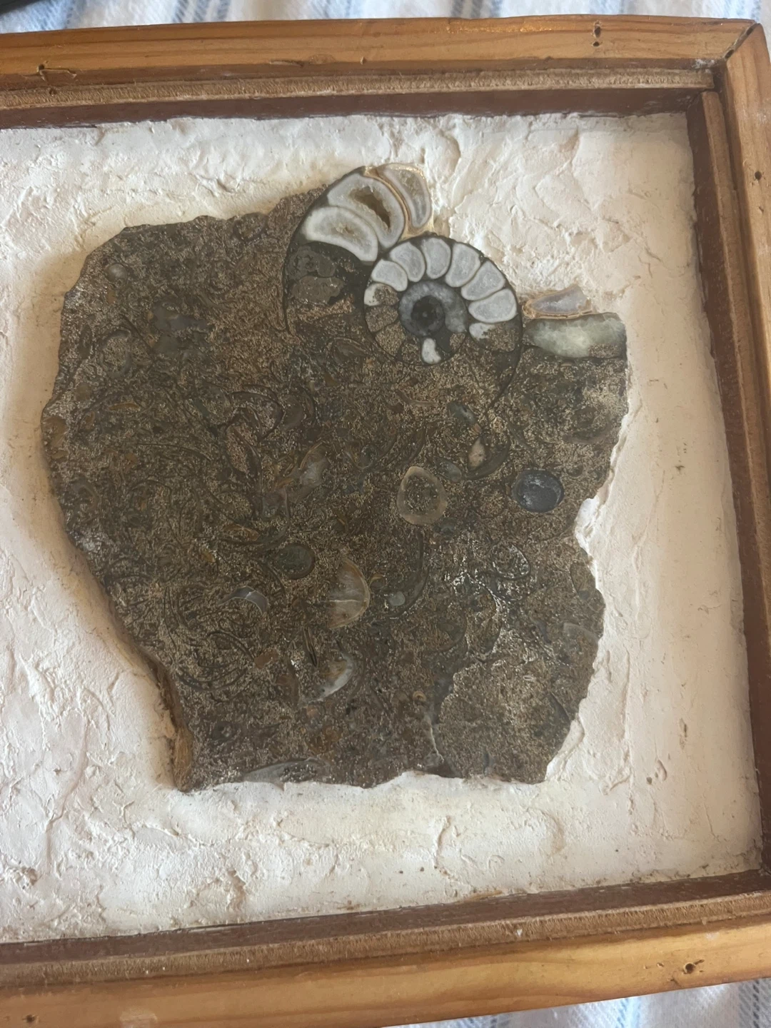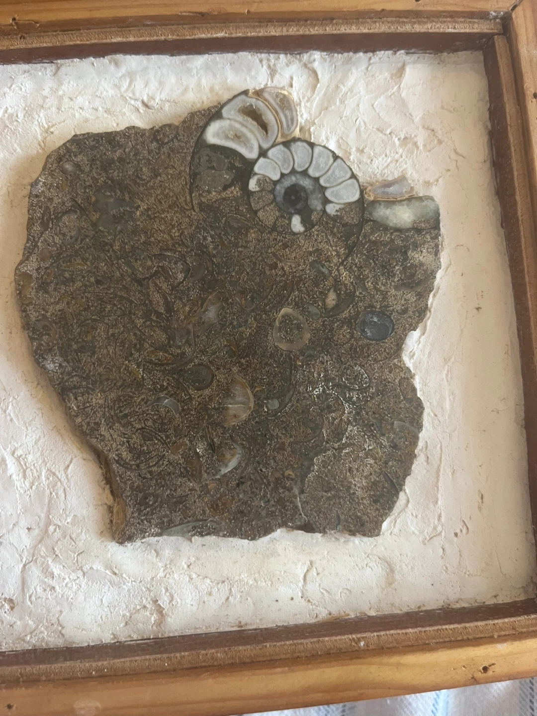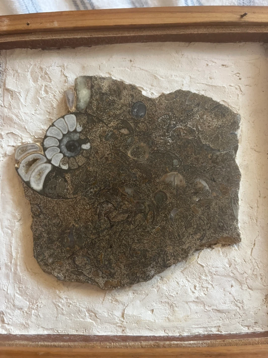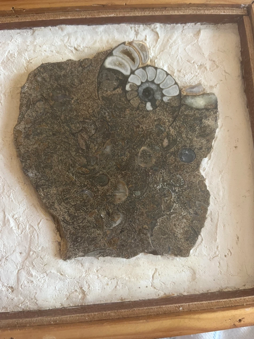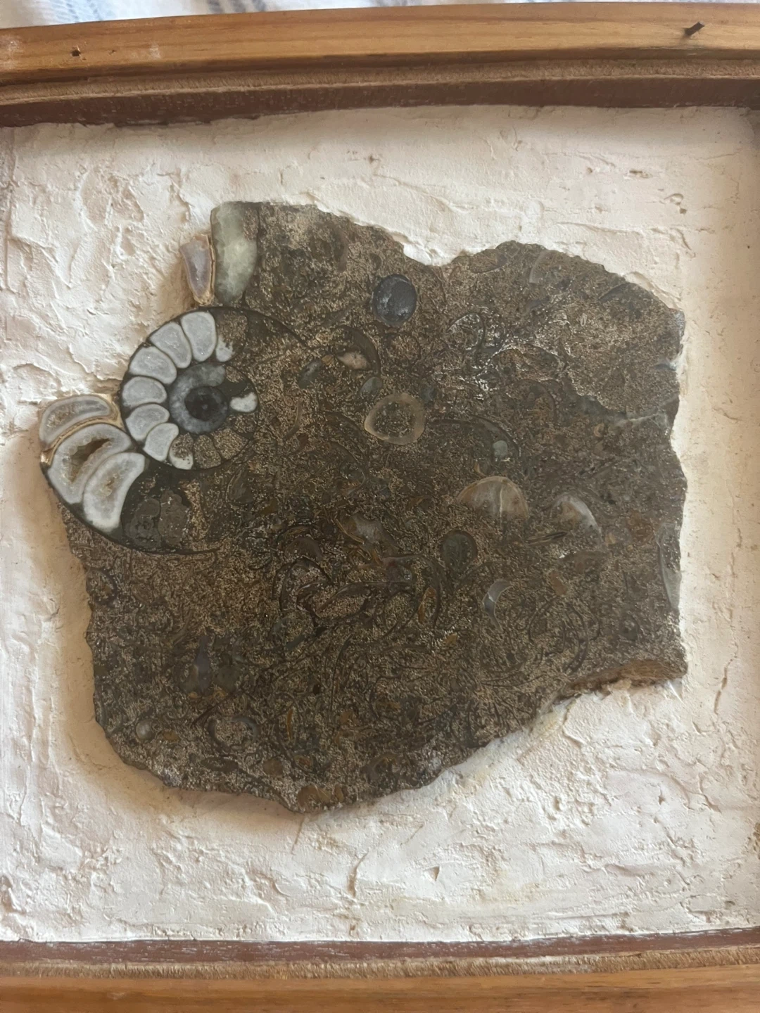 Unique framed fossil art piece. The fossil is embedded in a textured white background and surrounded by a wooden frame. It's a great conversation starter and a beautiful addition to any room!