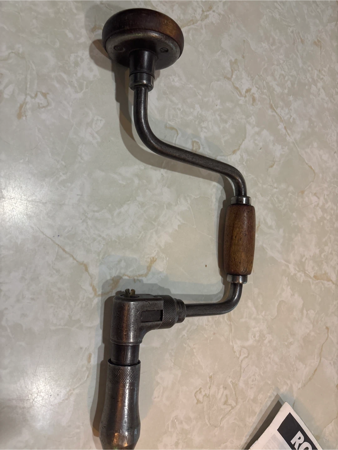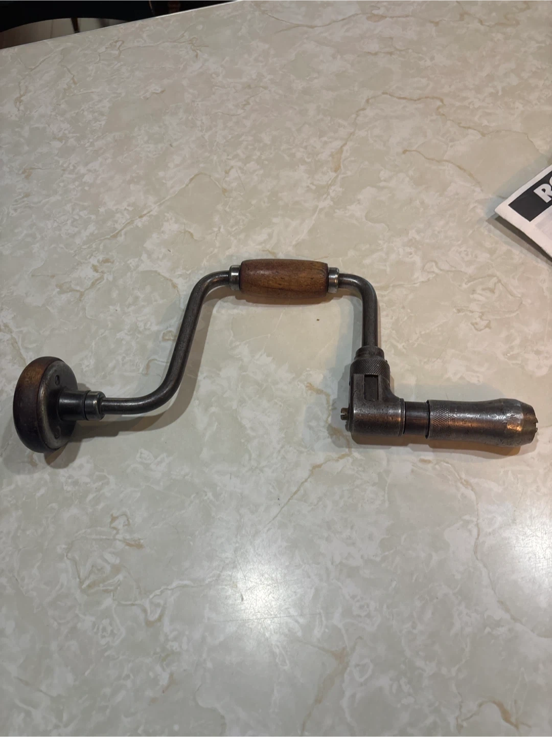 Selling an antique hand brace drill! It's a classic tool with a wooden handle and a metal frame. Perfect for collectors or anyone who appreciates vintage tools