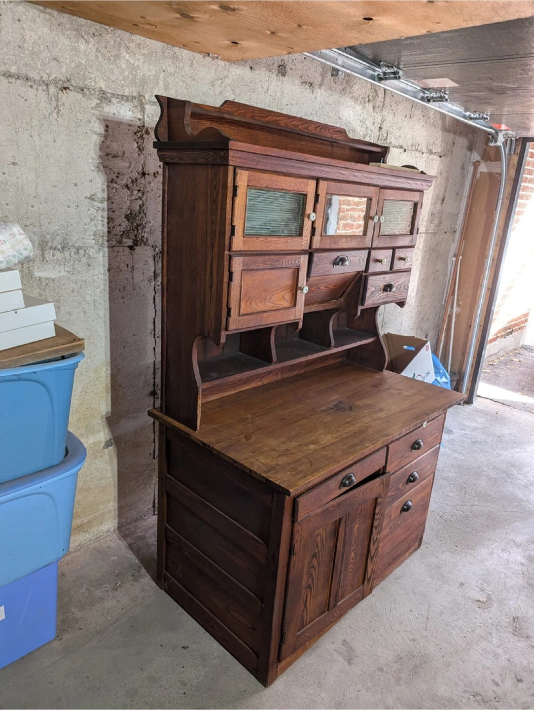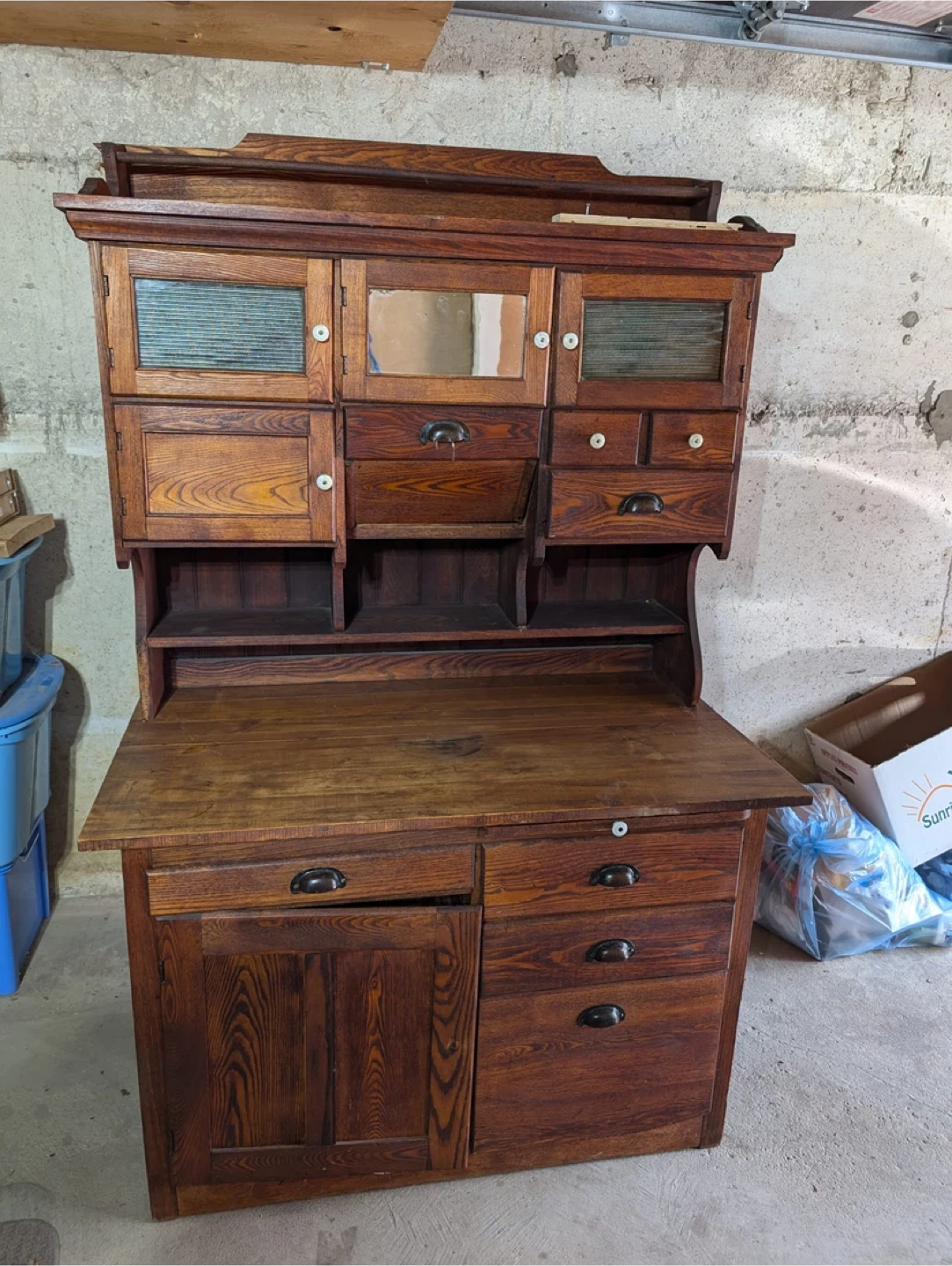 Selling an antique Hoosier cabinet made by Hanson Spendell Co. in Chatham, Ontario. It's a beautiful piece with lots of storage, perfect for adding a vintage touch to your kitchen or dining area. It has a unique design with glass-fronted cabinets and drawers.