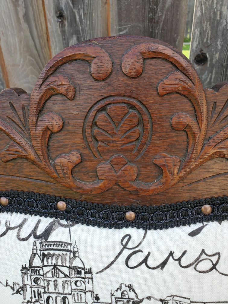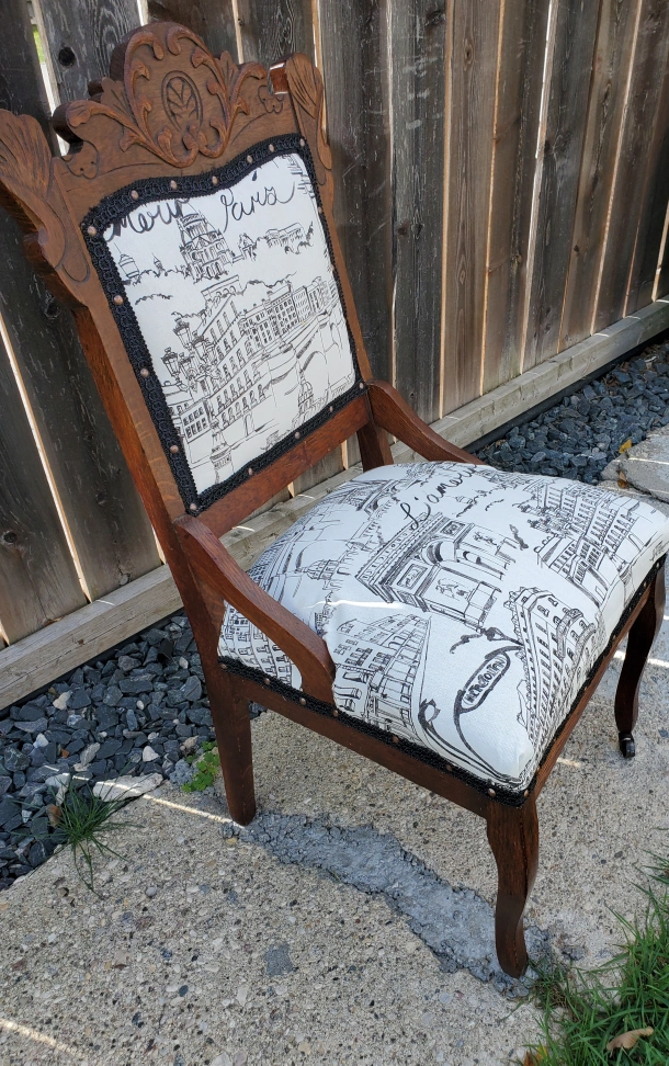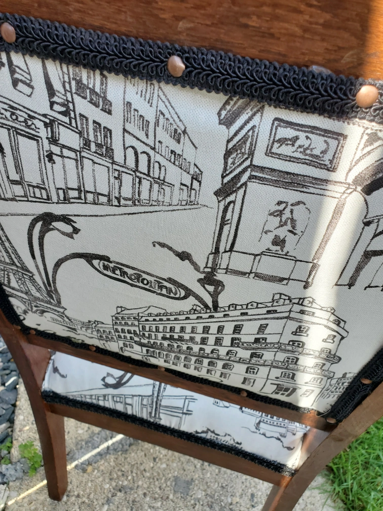 Here's a lovely antique oak accent chair with a unique Paris-themed print! The chair measures 19 inches wide and 37 inches in height, with a seat height of 18 inches. It would make a great addition to any room! beautiful fron brass casters