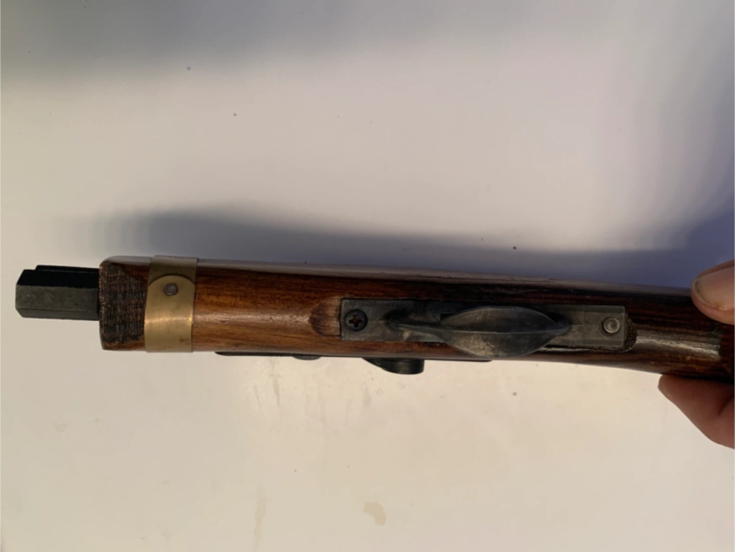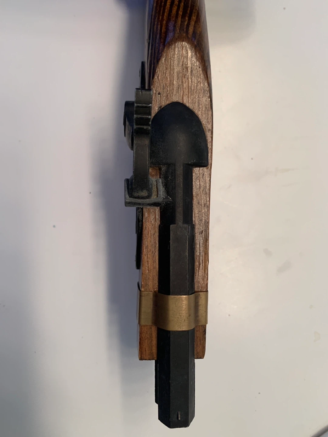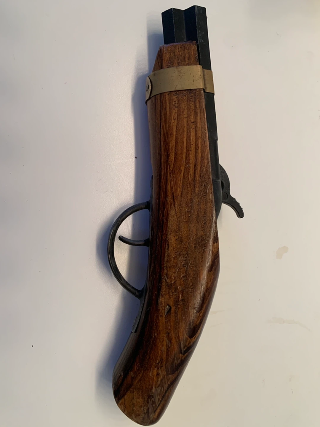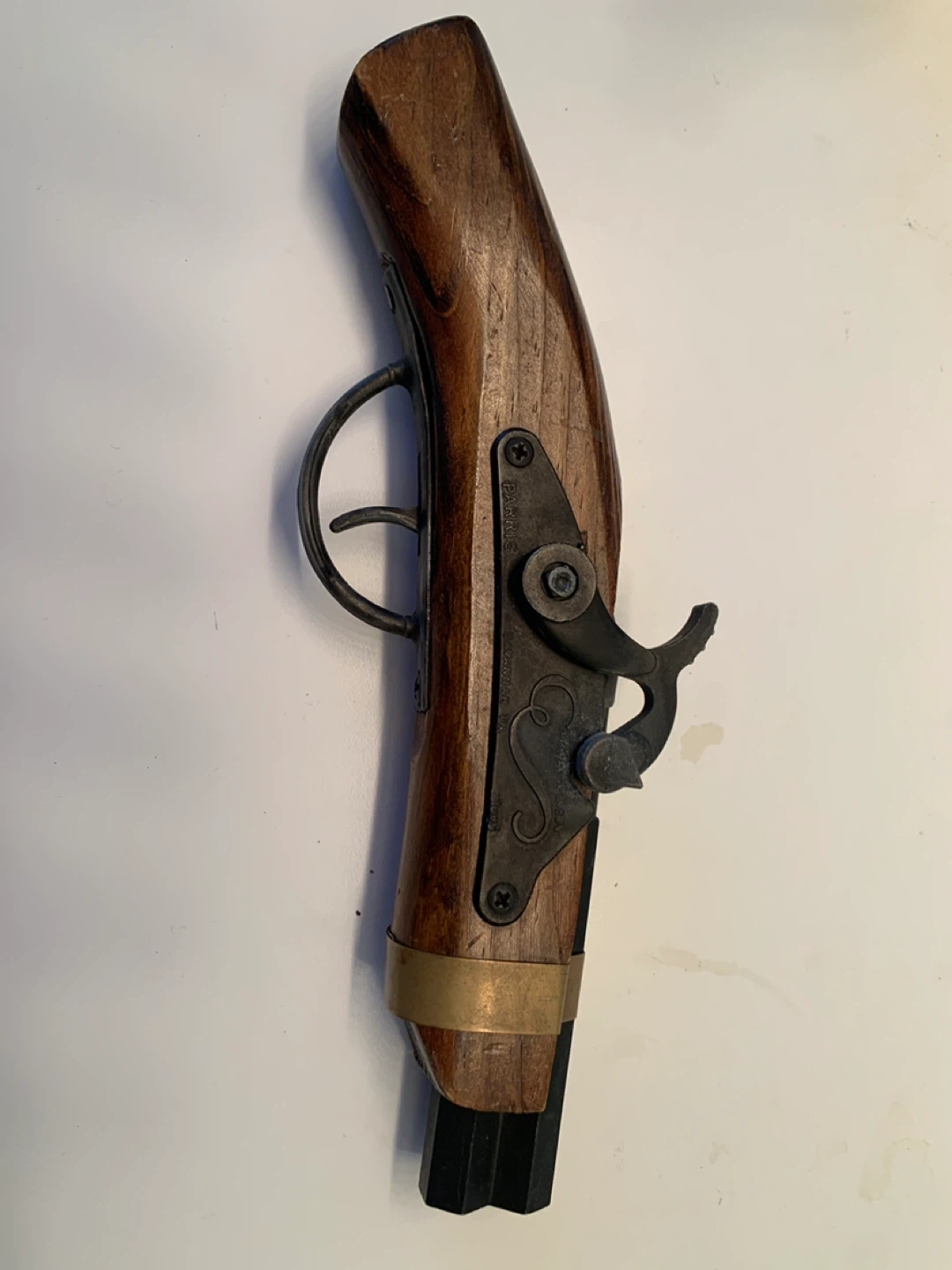 Selling an antique replica flintlock pistol. It has a wooden handle and a metal trigger and hammer mechanism. A unique decorative piece!