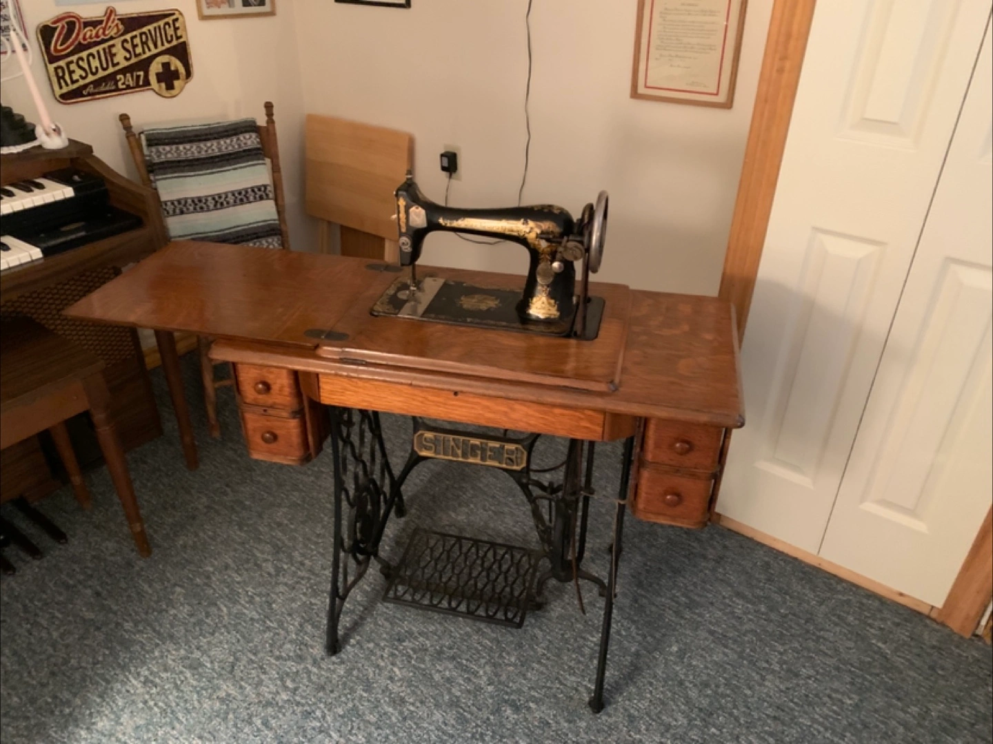 Selling an antique Singer sewing machine. It's a beautiful piece of history and would make a great addition to any collection or a unique statement piece for your home. The sewing machine shows signs of wear consistent with its age, adding to its vintage charm. In working condition.