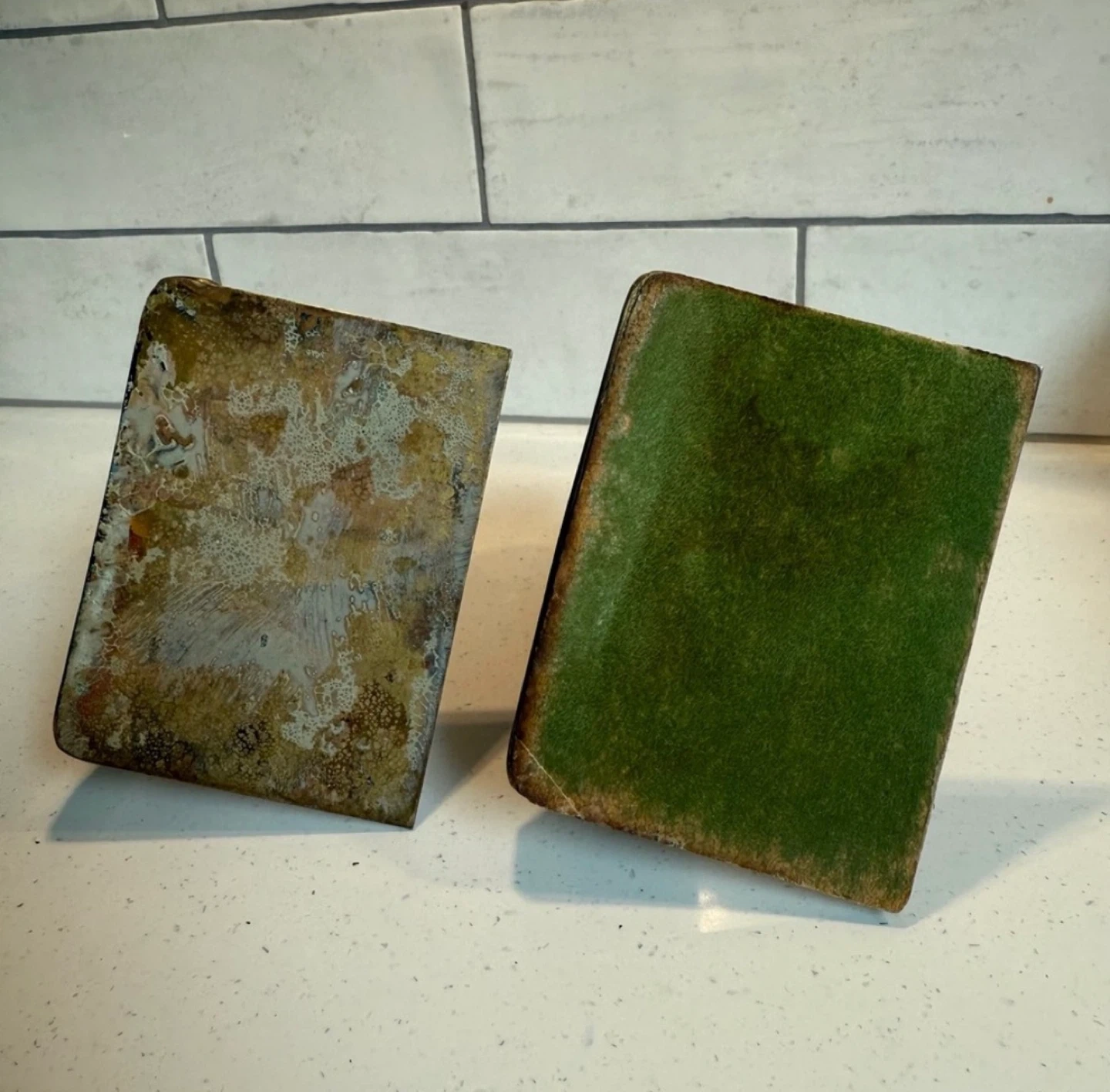 These bookends feature a pixie or elf figure holding a lantern, sitting on a mushroom amidst foliage, with "PIXIE" embossed on the base. Origin: They are often associated with Dartmoor, England, and are considered collectible items due to their age and design. Material: The bookends are made of solid bronze and are noted for their weight and sturdy construction. About 4” W, 3” D, 5” H