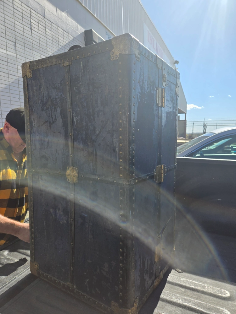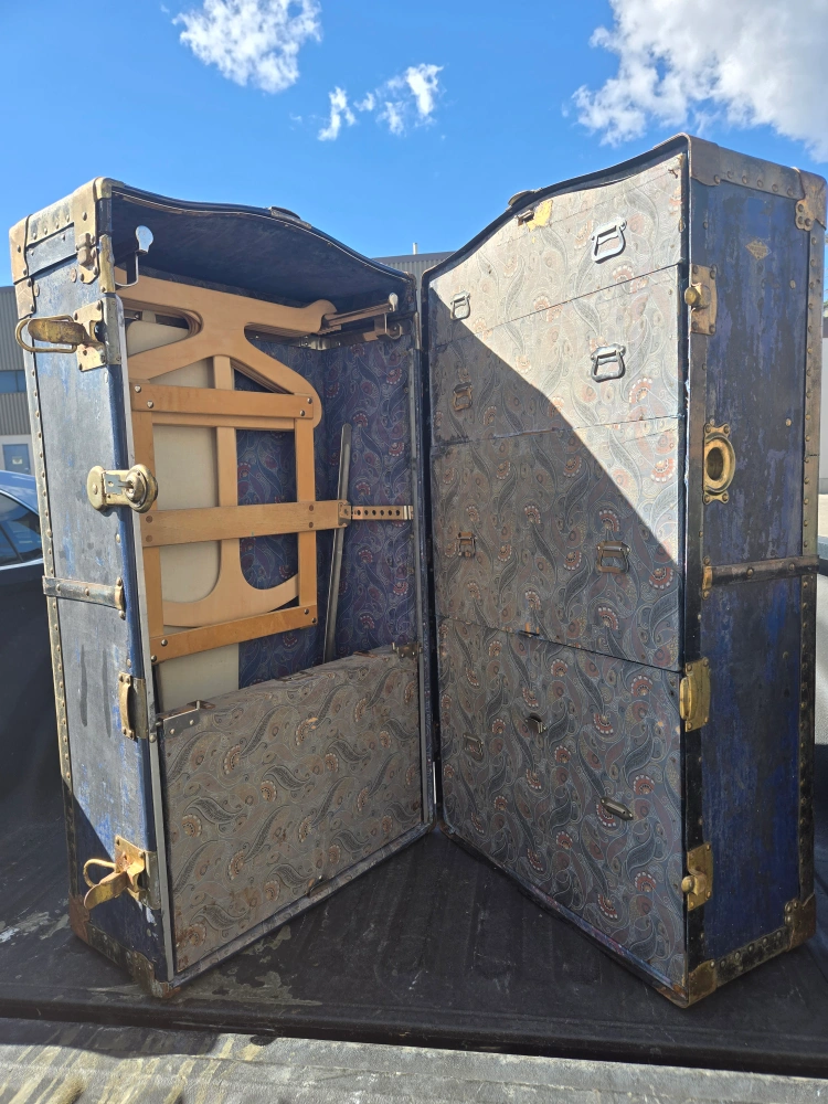 Selling an antique steamer trunk wardrobe. It has a lot of character and is in good condition for its age. Great for storage or as a unique piece of furniture