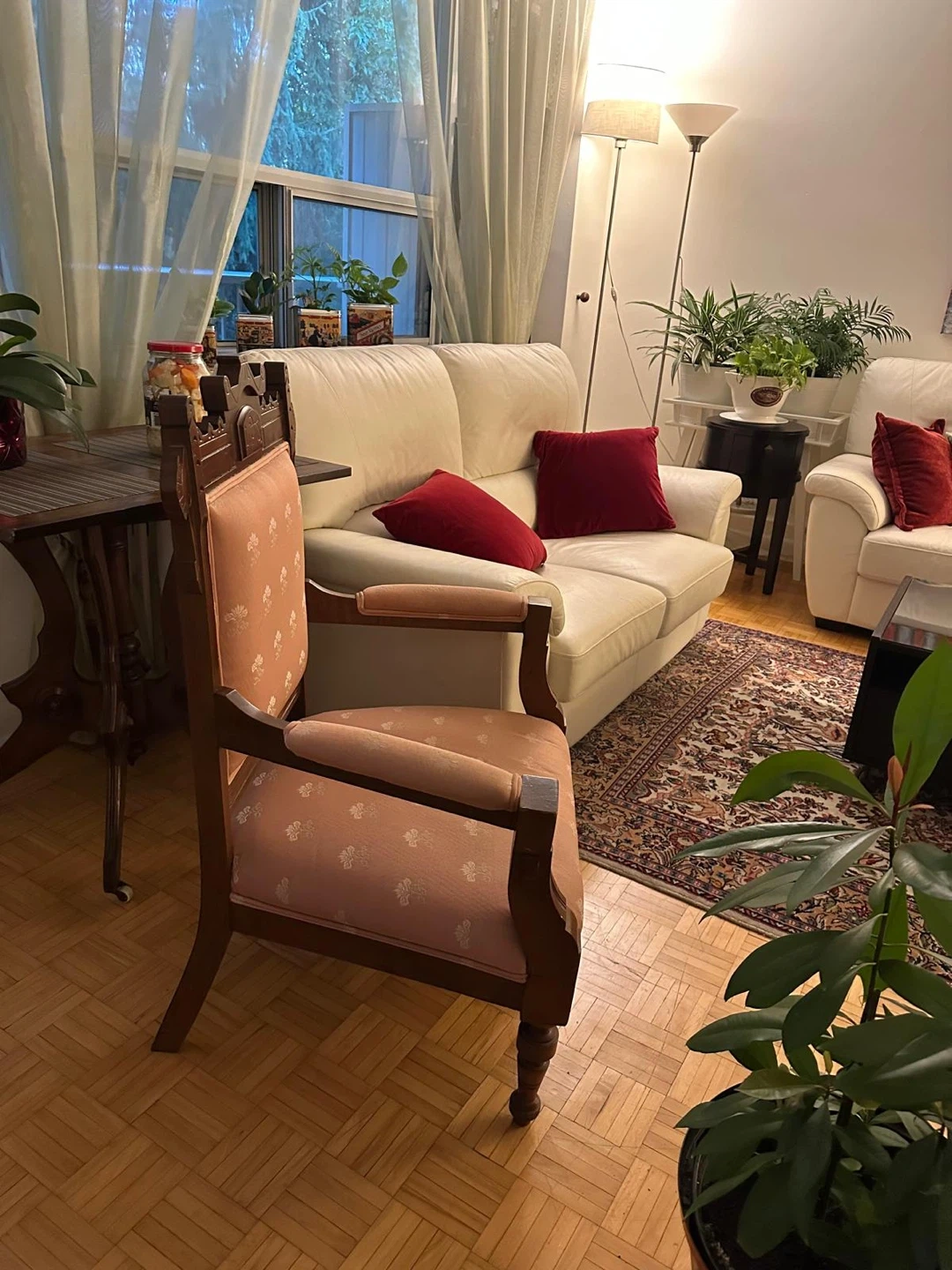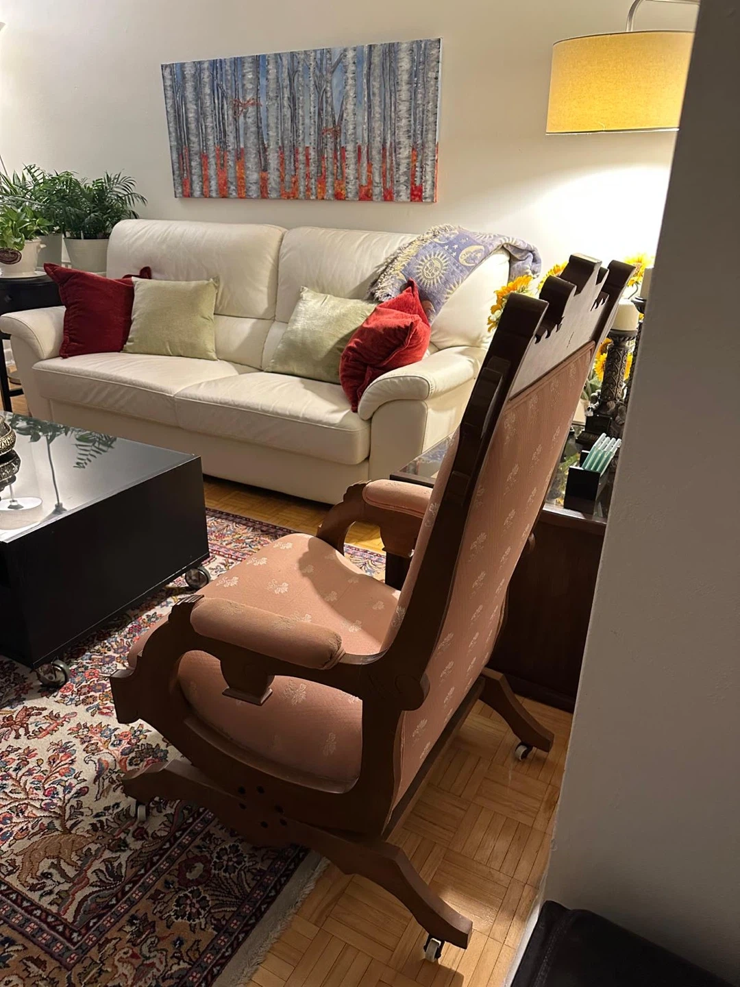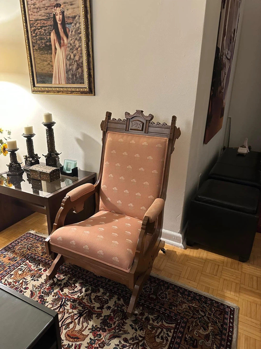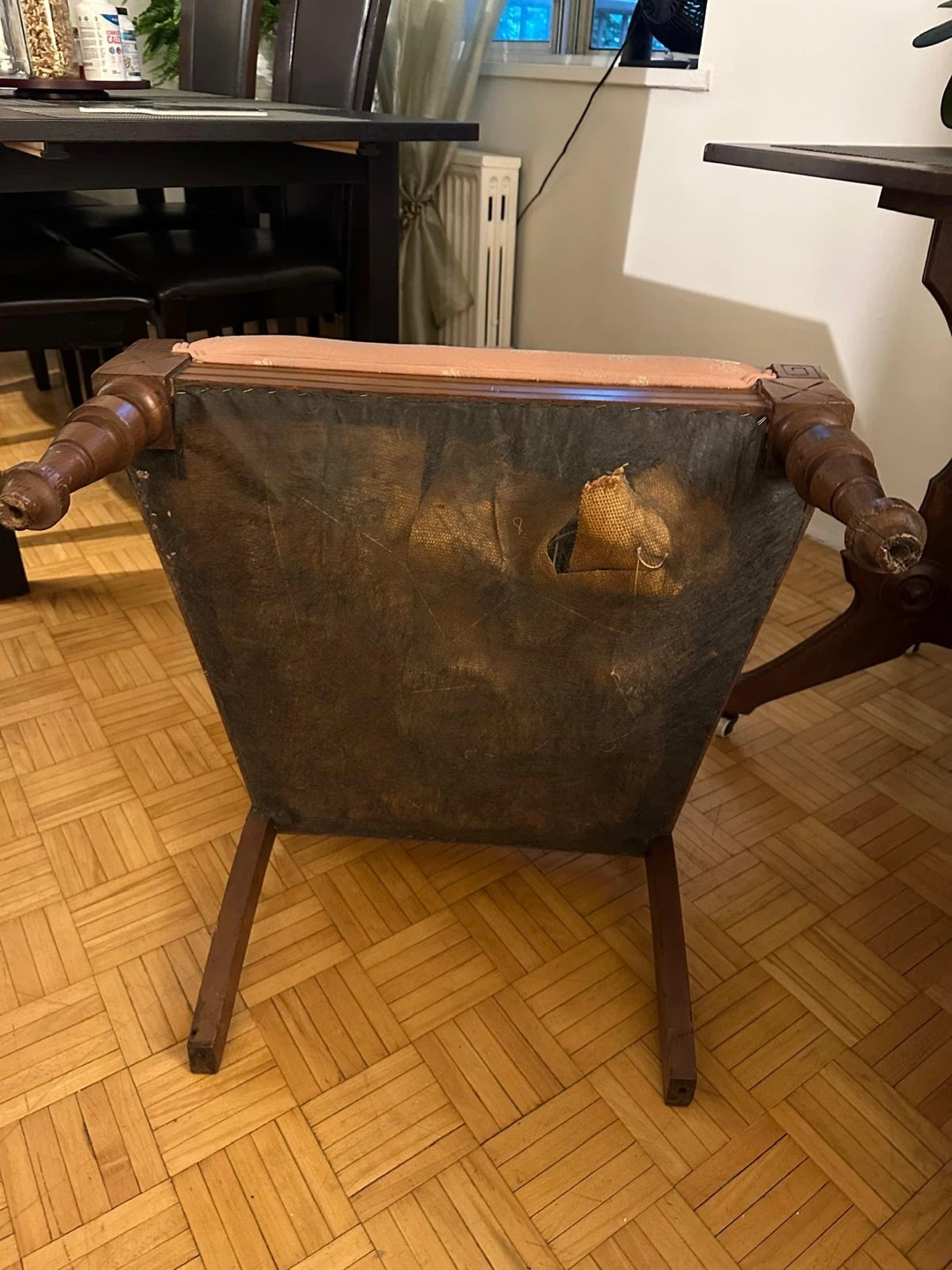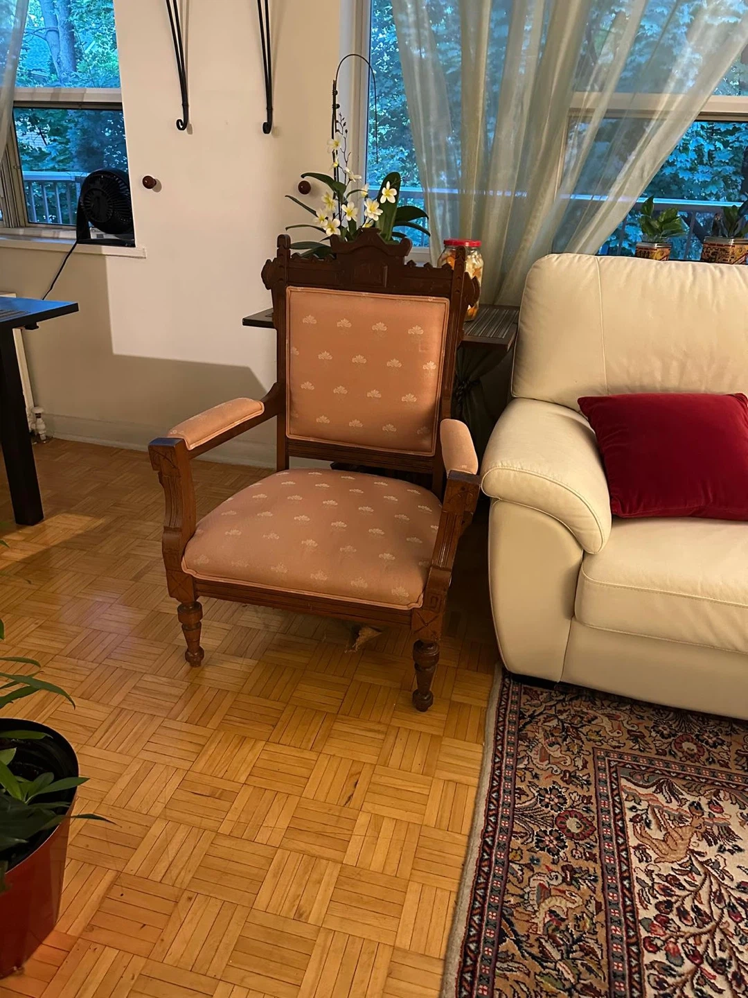 Selling a pair of armchairs with an antique style. It has a wooden frame and patterned upholstery. It would look great in any living room or study! They are about 60 years old. 60 for two chairs