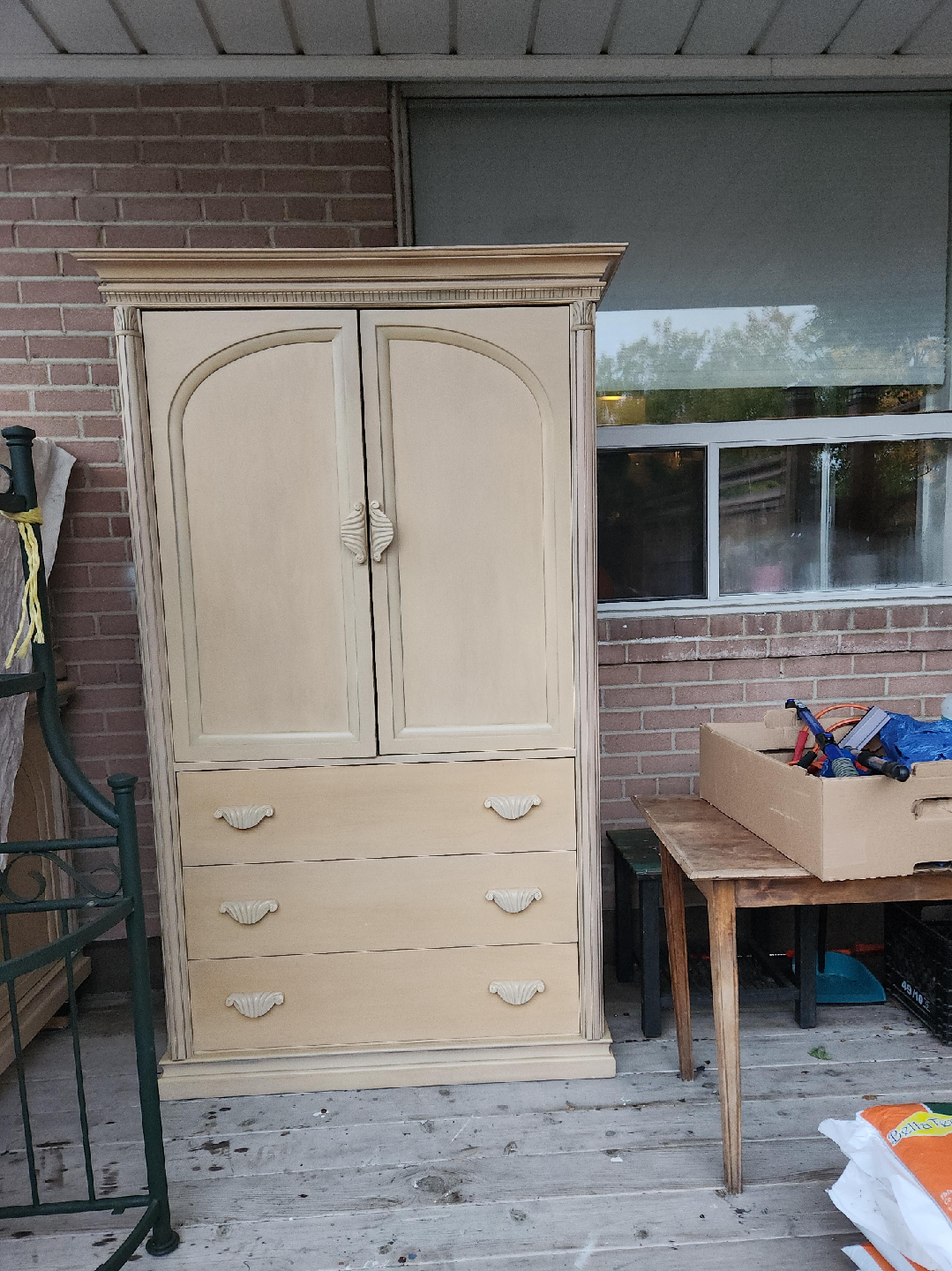 Selling a lovely armoire with an antique-style design. It features a cabinet with two doors on top and three drawers below. The colour is a soft beige. Perfect for adding some vintage charm to your space Pick up only!