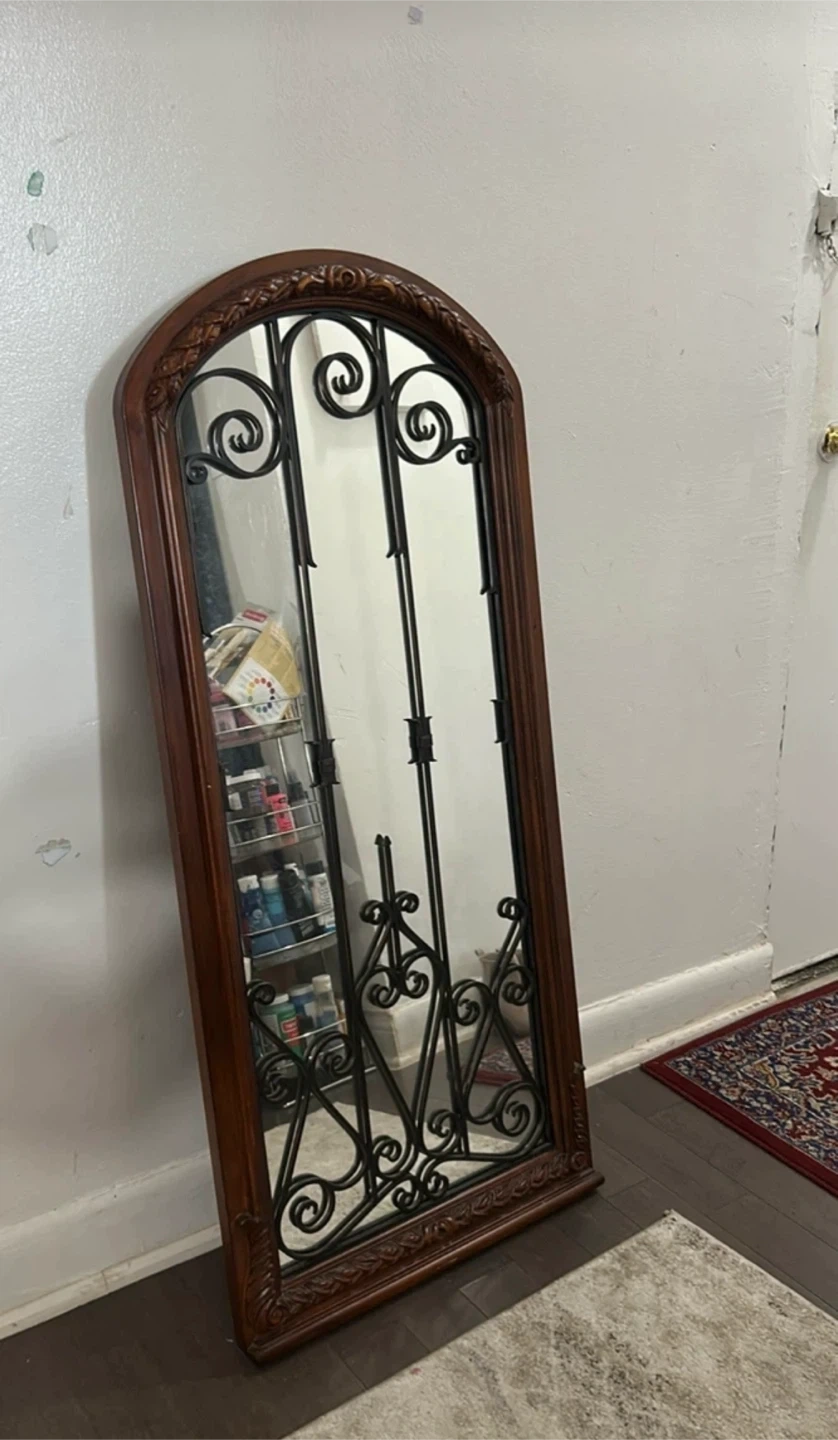 This is a beautiful ornate arch wall mirror with a brown wood frame. It would look great in any room!