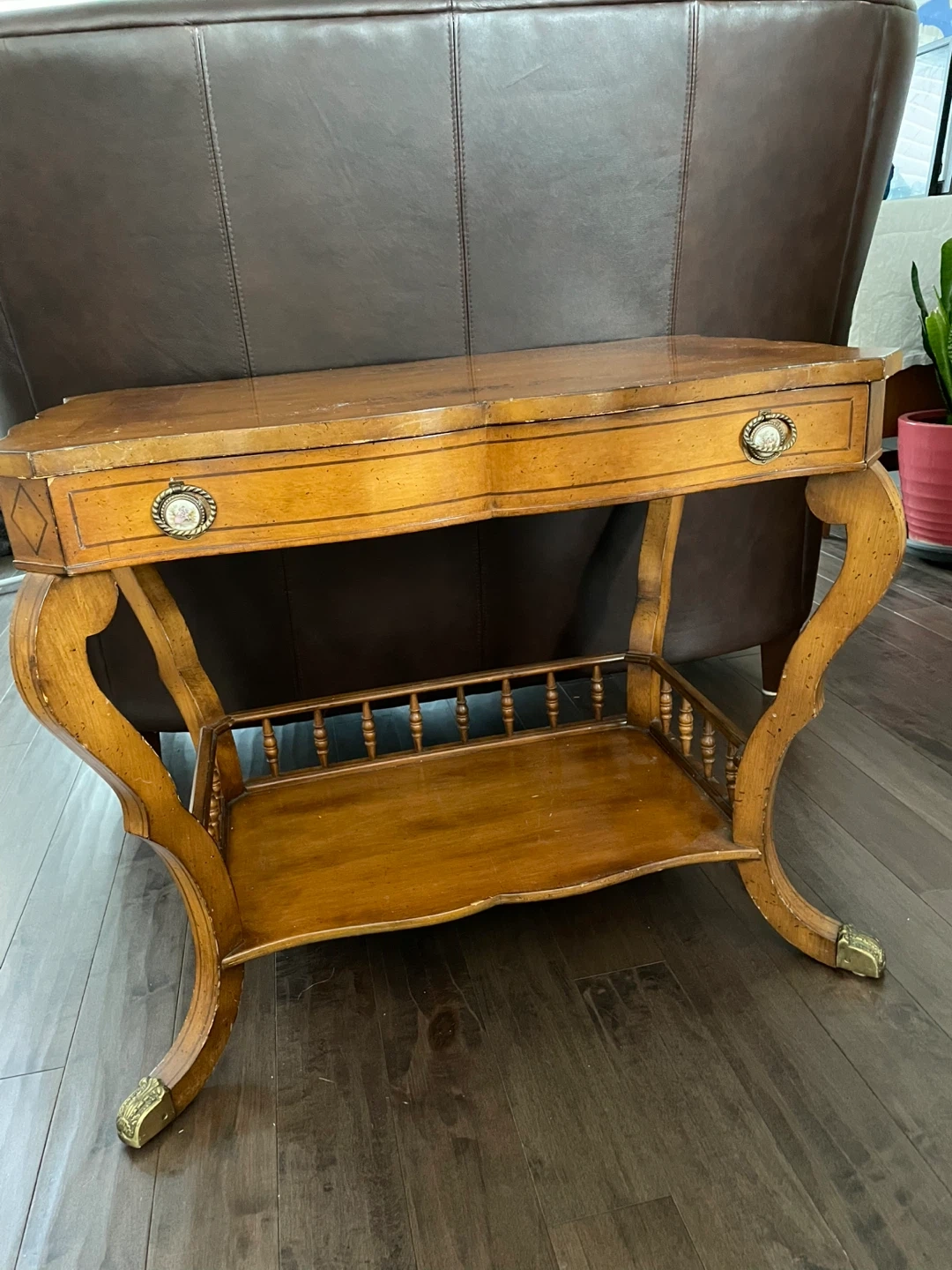 Selling an antique wooden console table because redecorating It has a classic design with decorative legs and a lower shelf for extra storage or display. There is also a drawer for storing smaller items. It’s been five years since I bought this from an antique furniture store named“Of Things Past”. Dimensions : 31”L *21”D*25”H 78cm * 53cm *64cm Cash only