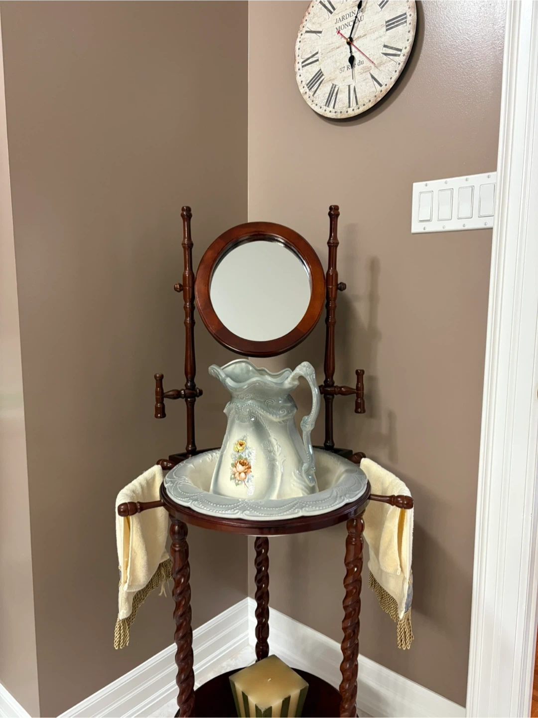 Selling a lovely antique washstand! It comes with a decorative pitcher and a mirror, perfect for adding a vintage touch to your home. The stand features a unique twisted leg design and towel bars on either side. A charming piece for any room!