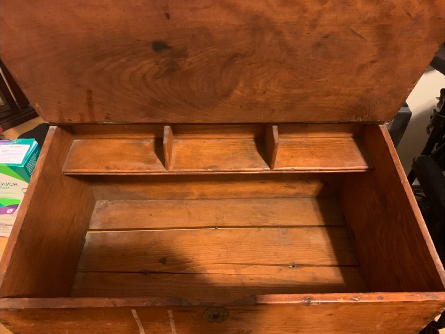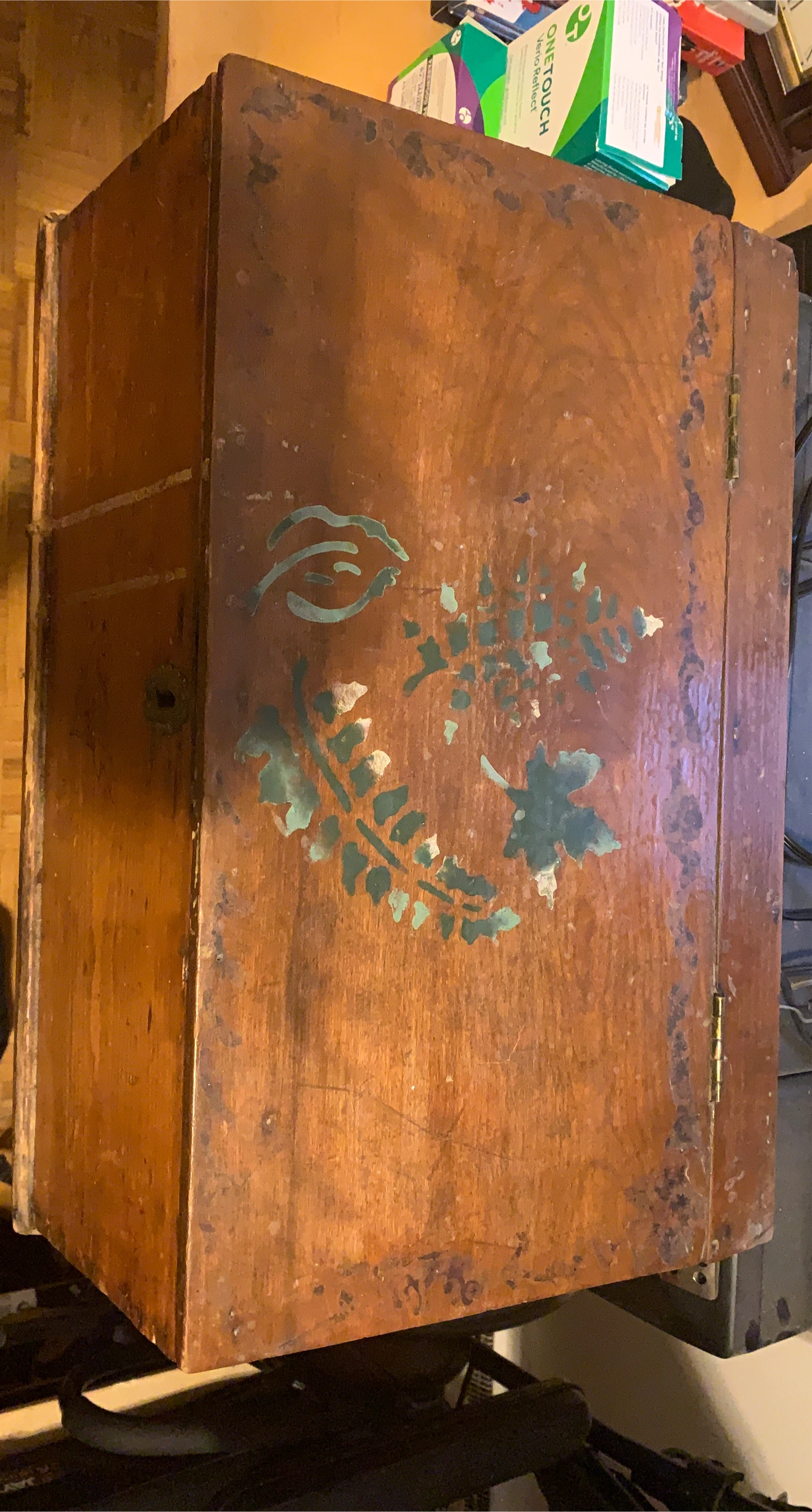 Selling an antique wooden box with a unique design on the front. It has an interior with dividers. It would be great for storage or as a decorative piece