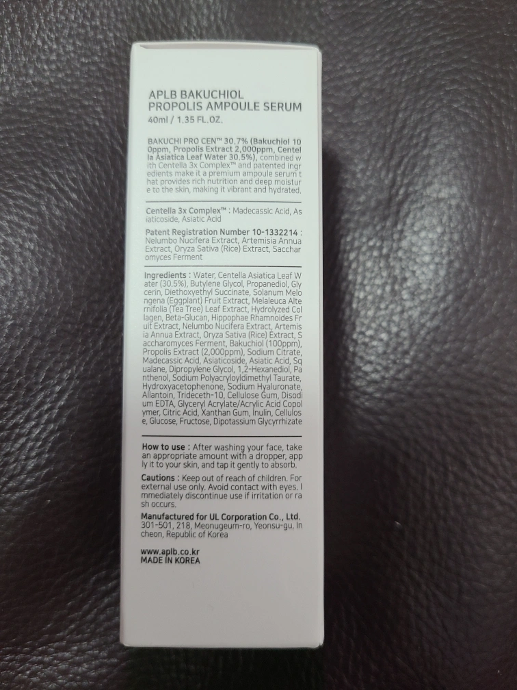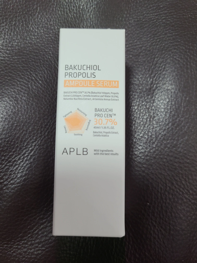 I'm selling APLB Bakuchiol Propolis Ampoule Serum. It contains Bakuchiol 100ppm and Propolis Extract 2,000ppm. It also has Centella Asiatica Leaf Water 30.5%. It's a premium ampoule serum that provides rich nutrients and energy to the skin, making it vibrant and hydrated. Unopened and unused