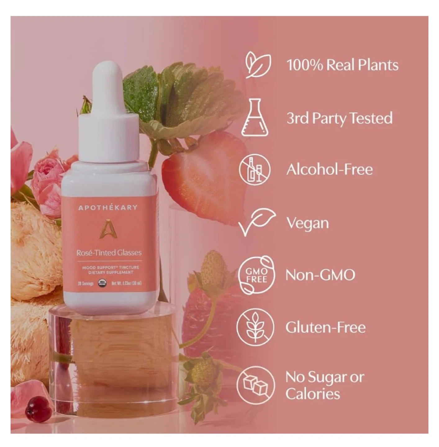 bottle of Apothekary Rosé-Tinted Glasses mood support tincture. It's a dietary supplement with 20 servings. This tincture is made with 100% real plants, is 3rd party tested, alcohol-free, vegan, non-GMO, and gluten-free, with no sugar or calories