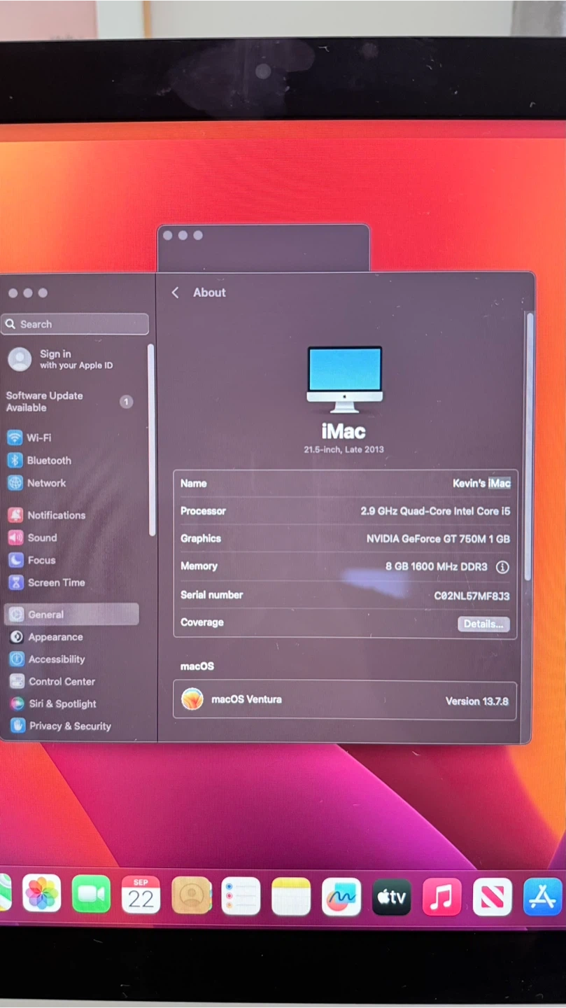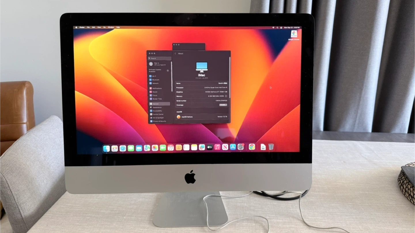 Selling my 21.5-inch Apple iMac from late 2013. It's in great shape and ready for a new home! Key specs: - 2.9 GHz Quad-Core Intel Core i5 processor - NVIDIA GeForce GT 750M 1 GB graphics - 8 GB 1600 MHz DDR3 memory - macOS Ventura Version 13.7.8 Imac only . No keyboard or mouse included.